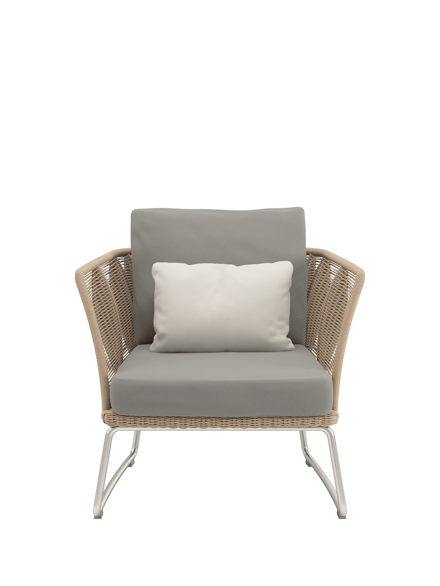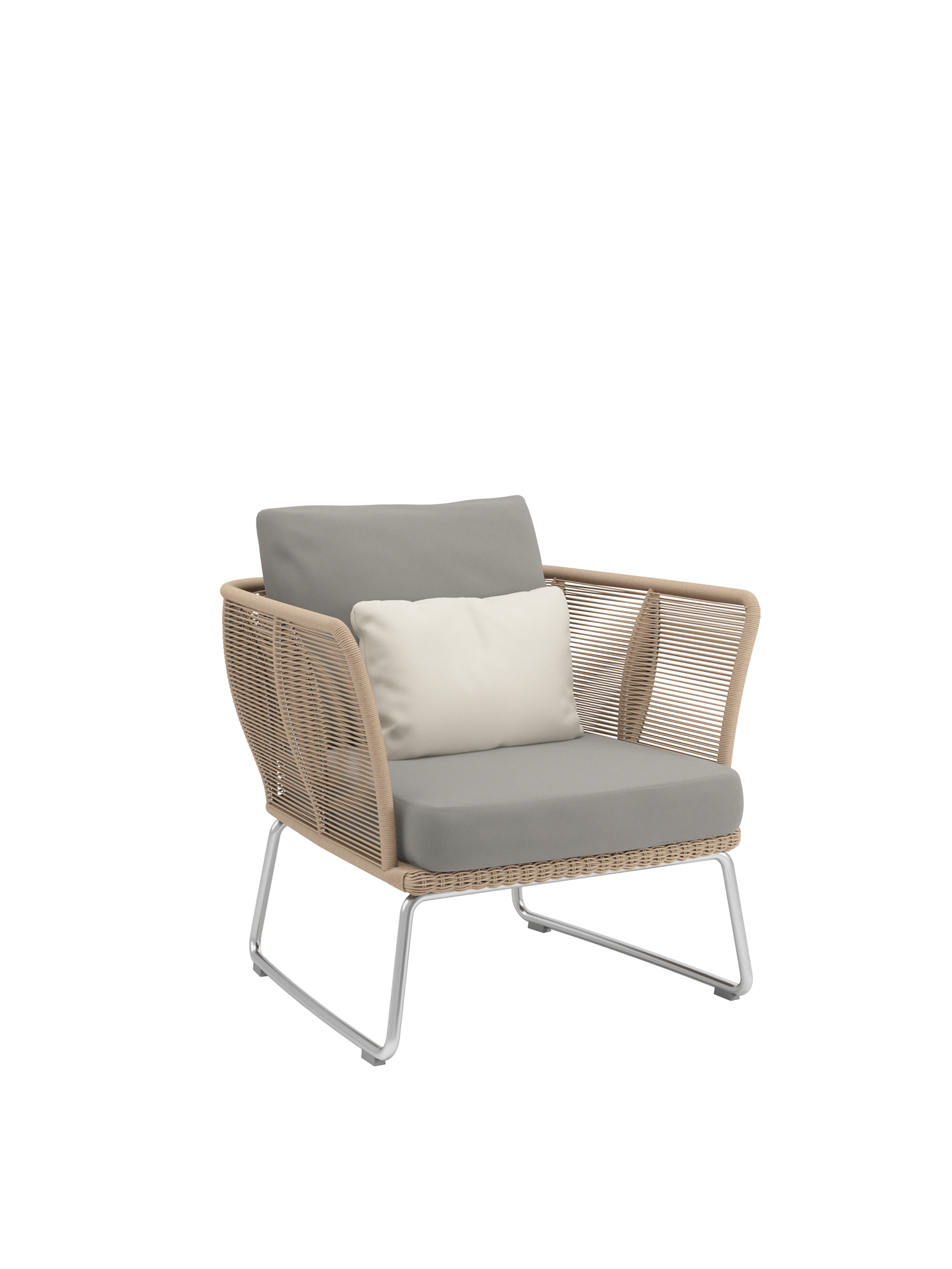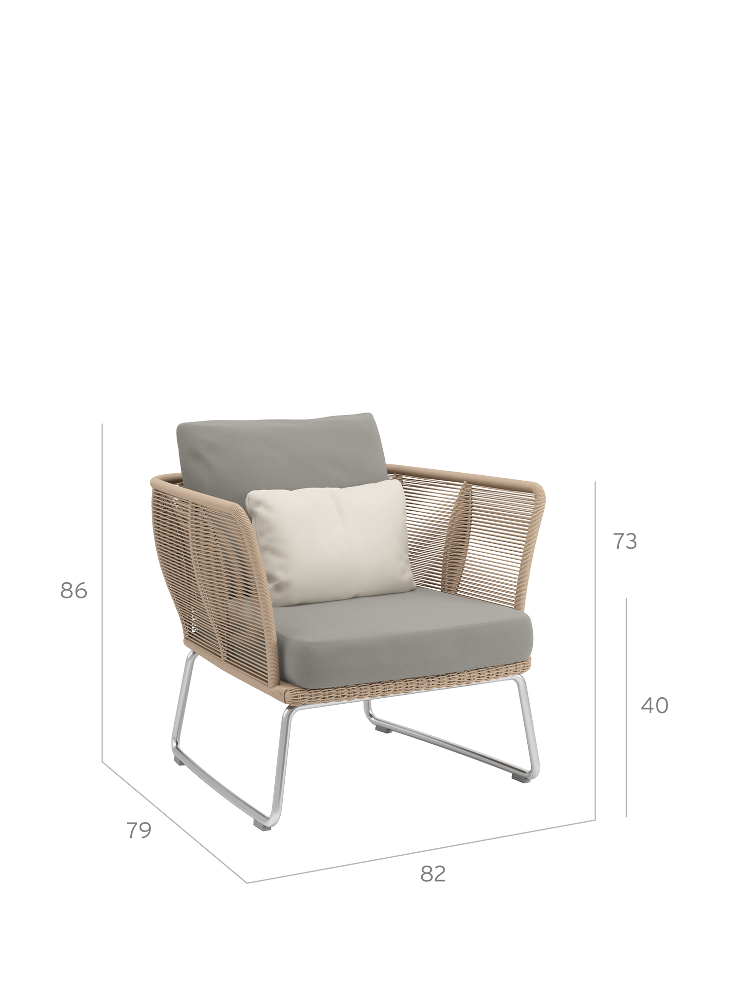 Eine Kombination aus witterungsbeständigem Kordelgeflecht und Edelstahl sorgt für Transparenz und Stabilität zugleich. Das geradlinige Flechtmuster der Loungemöbel lässt das Licht durchscheinen. Die auf gleicher Höhe verlaufenden Rücken- und Seitenteile des komfortablen Sessels sind doppellagig gearbeitet und bieten angenehmen Rückhalt. Schlanke, geschwungene Edelstahlkufen verleihen dem Design besondere Eleganz und zuverlässigen Halt.