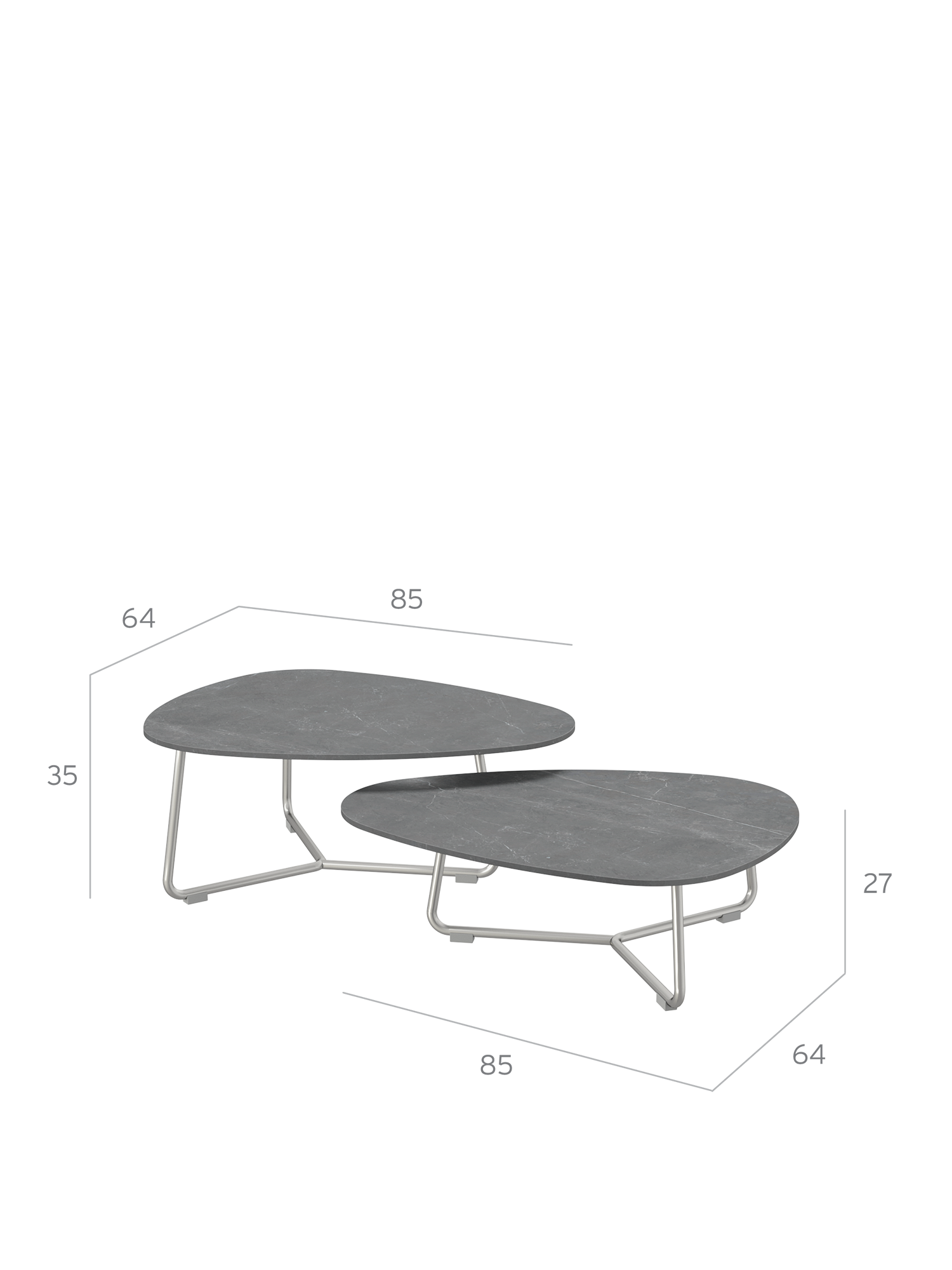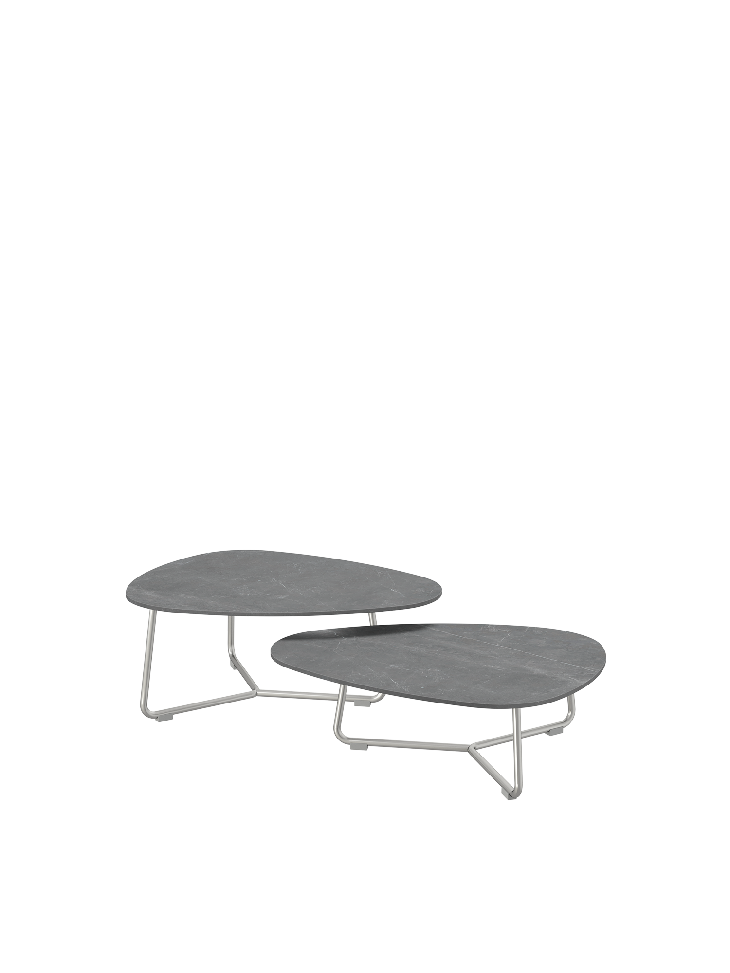 Das Loungetisch Zweierset kombiniert Tische in zwei unterschiedlichen Höhen mit gleich grossen Tischplatten aus Keramik. Durch ihre asymmetrisch gerundete Form lassen sie sich im Garten und auf der Terrasse flexibel und beliebig variieren. Ihre Höhe ist perfekt auf die Loungemöbel abgestimmt. Stehen ihre Längsstreben parallel zueinander, können die beiden Loungetische nach Belieben zusammen oder weiter auseinander geschoben werden – je nachdem, wie viel Platz benötigt wird.