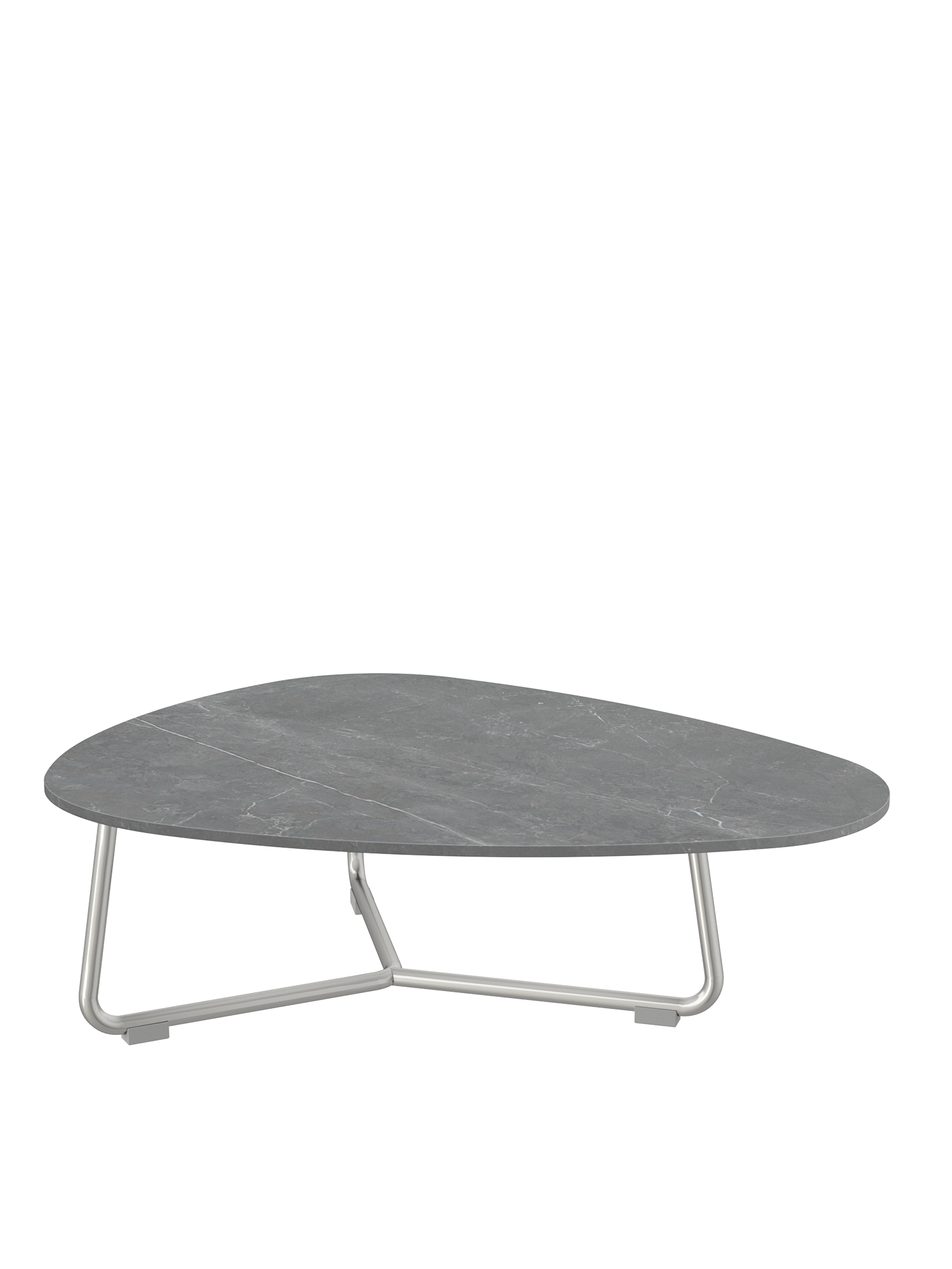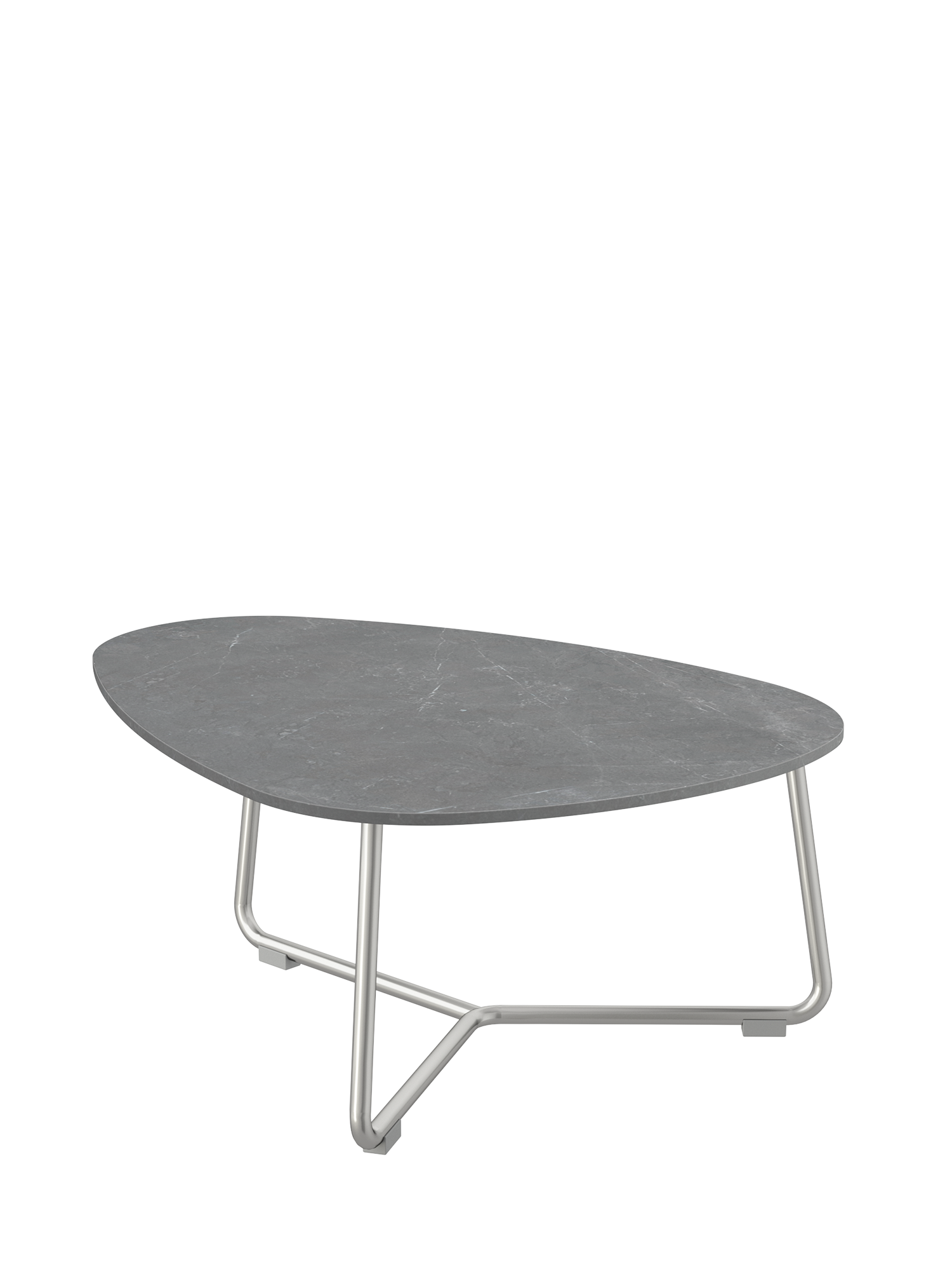 Die schlanken Edelstahlkufen der Loungetische sind wetterfest und besonders pflegeleicht. Auch die Oberflächen aus einer frostfesten, UV-beständigen Keramik mit feiner Maserung lassen sich einfach reinigen.