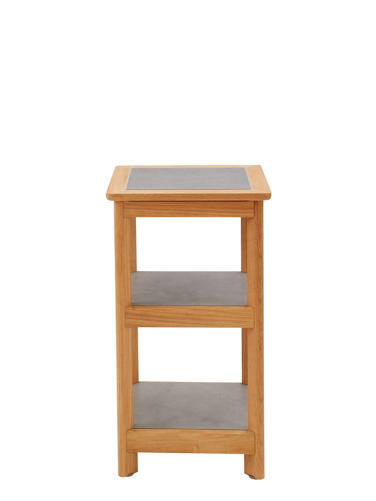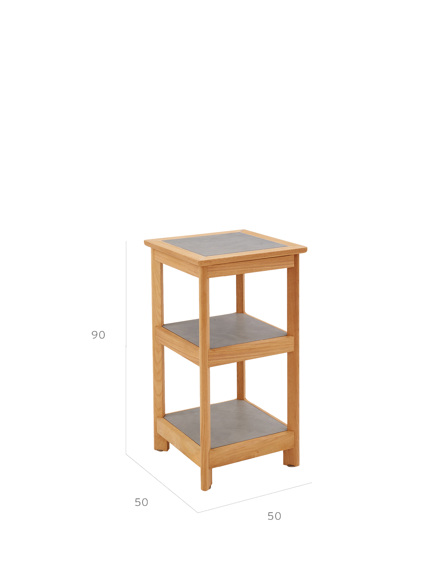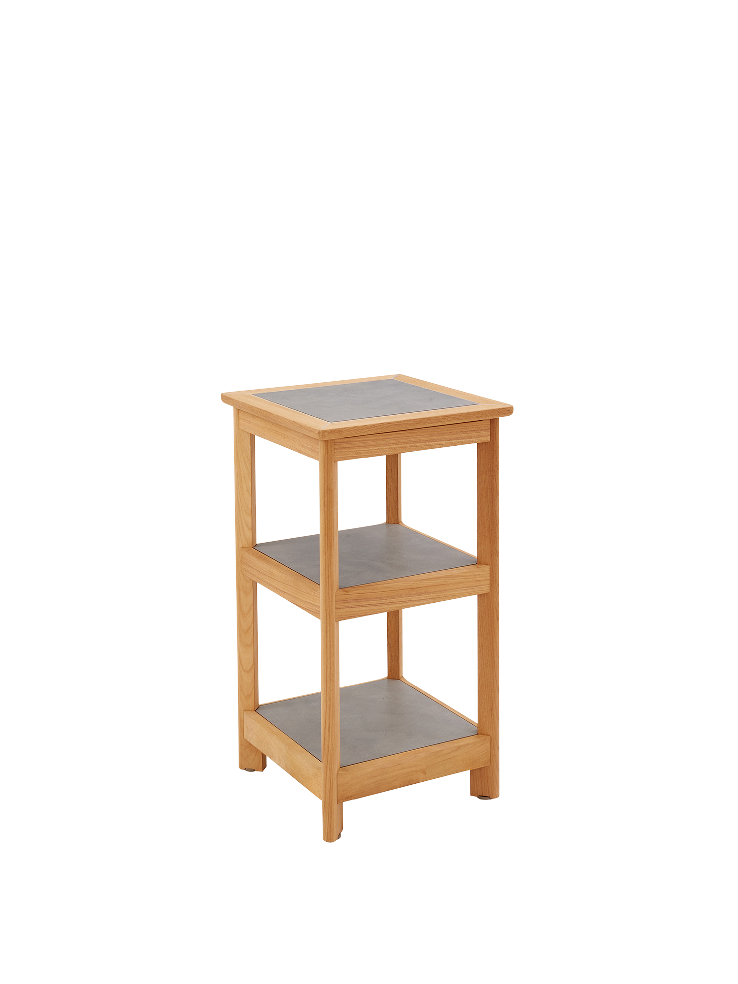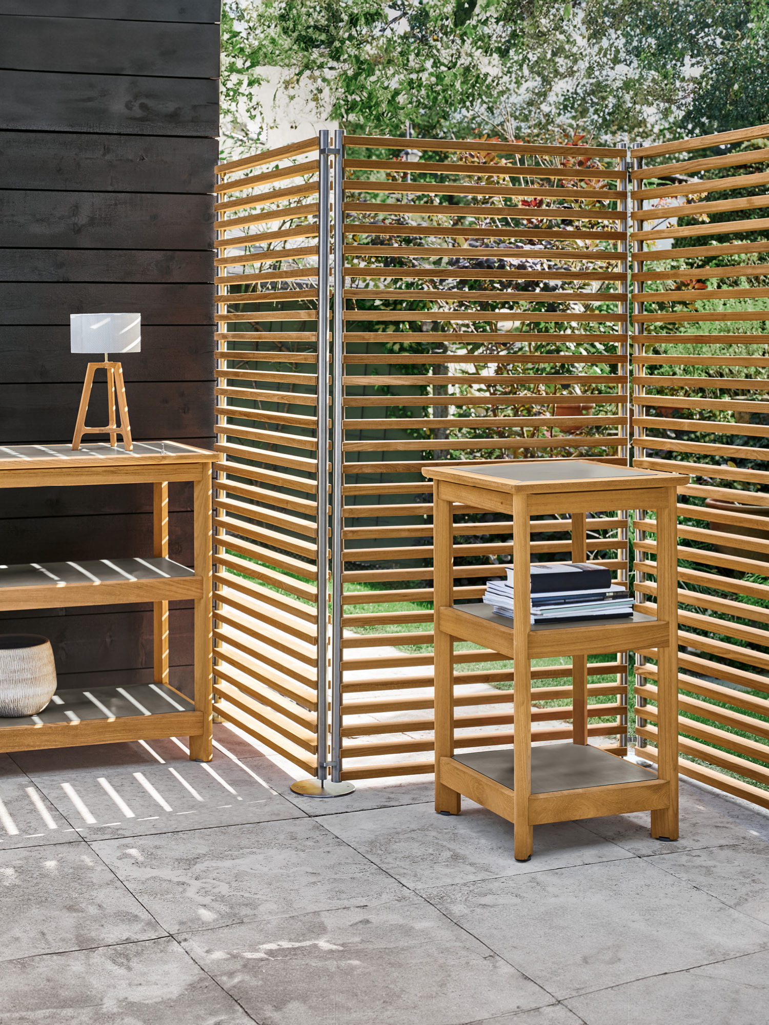 Als Abstellmöglichkeit, Stauraum mit üppiger Tiefe oder Ausstellungsort für dekorative Objekte macht es sich im Garten wie auf dem Balkon nützlich. Das solide Gestell mit der eleganten Bein-Zargen-Konstruktion wird aus Teakholz gefertigt, die Einlegeböden bestehen aus Kunstharz in Steinoptik. Höhenversteller gleichen Unebenheiten des Bodens aus.