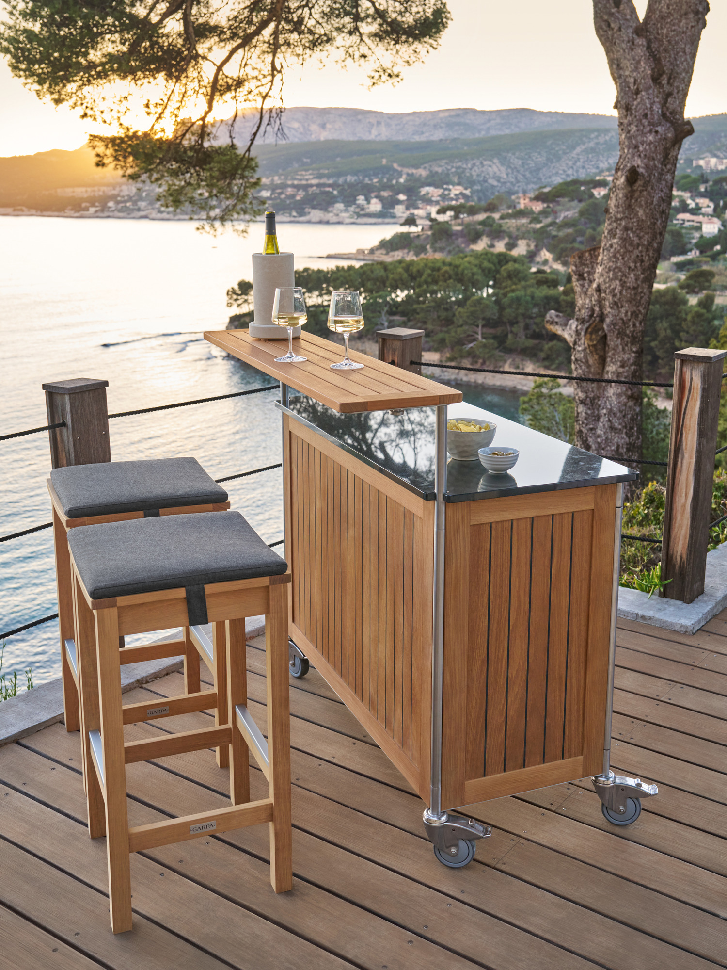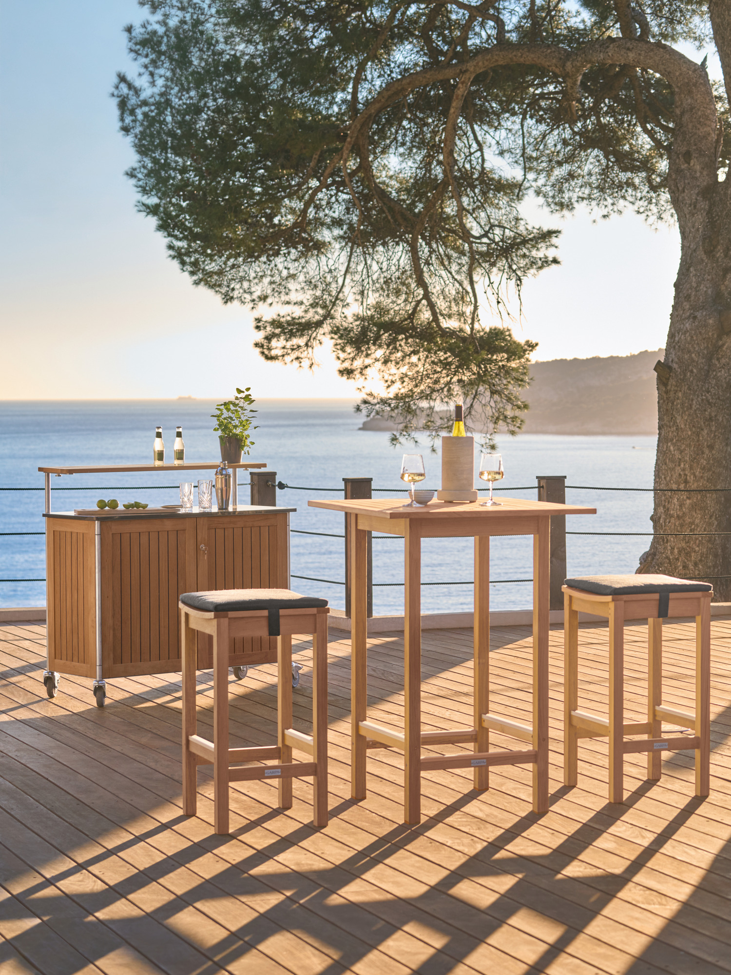 Im reduzierten Design offenbart sich gediegenes Handwerk – starkes Material, ergonomisch geformte Leisten, solide Verbindungen. Ob schneller Imbiss oder gesellige Happy Hour: Das Ensemble aus wetterfestem Teak lädt ein zum legeren Treff auf Balkon oder Terrasse. Die Stege an Tisch und Hocker werden durch Aluminiumprofile geschützt und geben den Füssen Halt. Passende Auflagen in Anthrazit finden Sie unter "Auflagen".