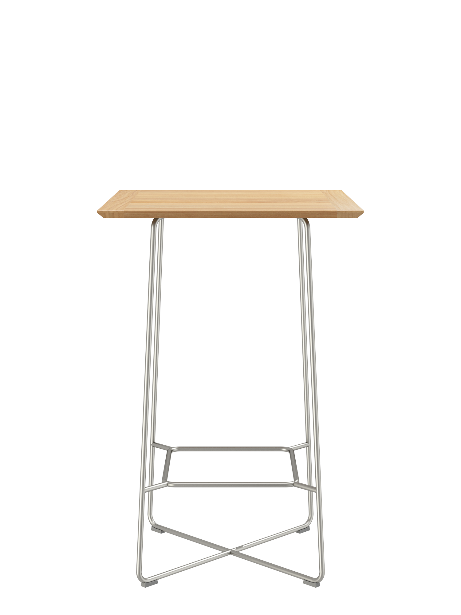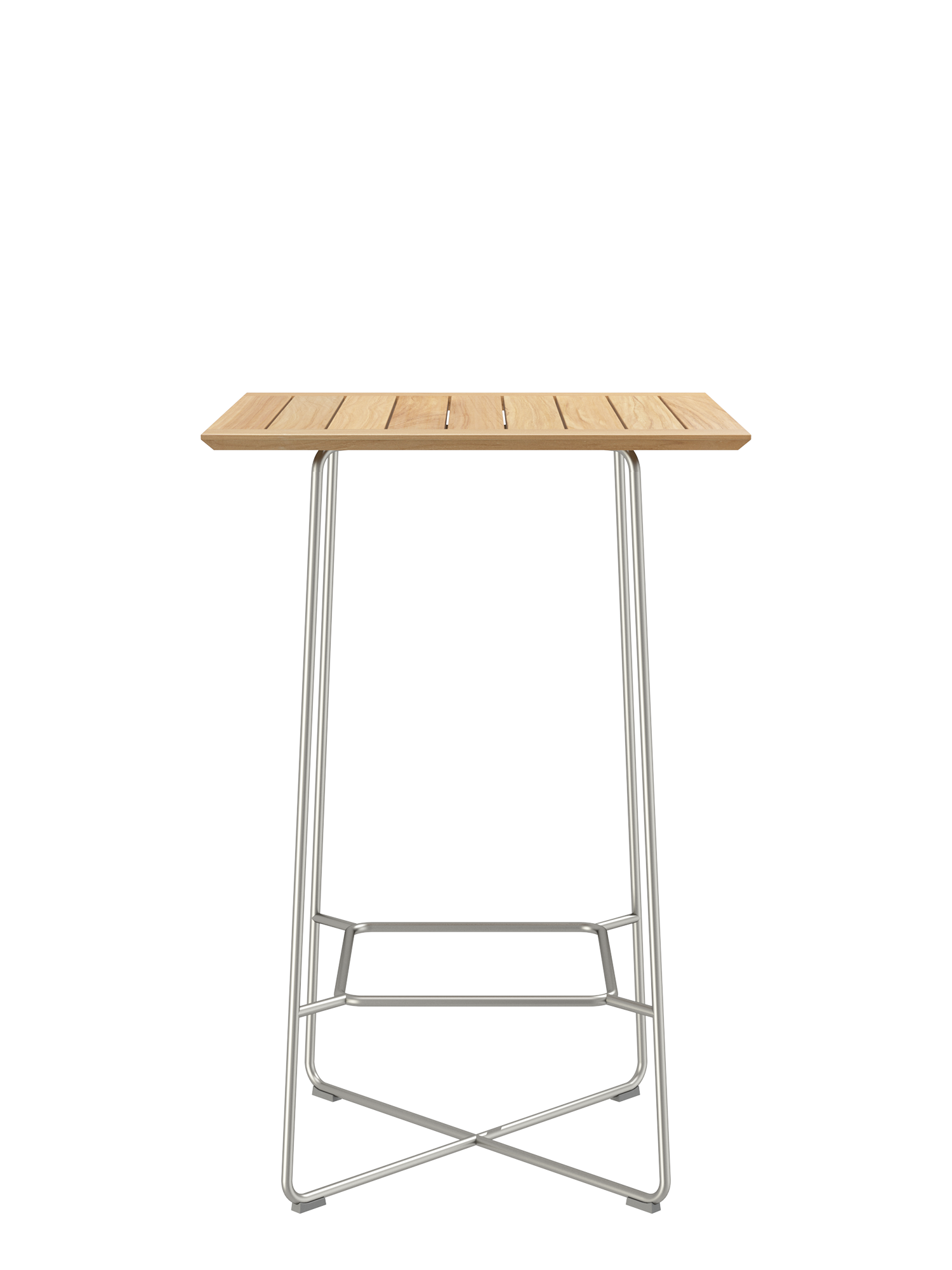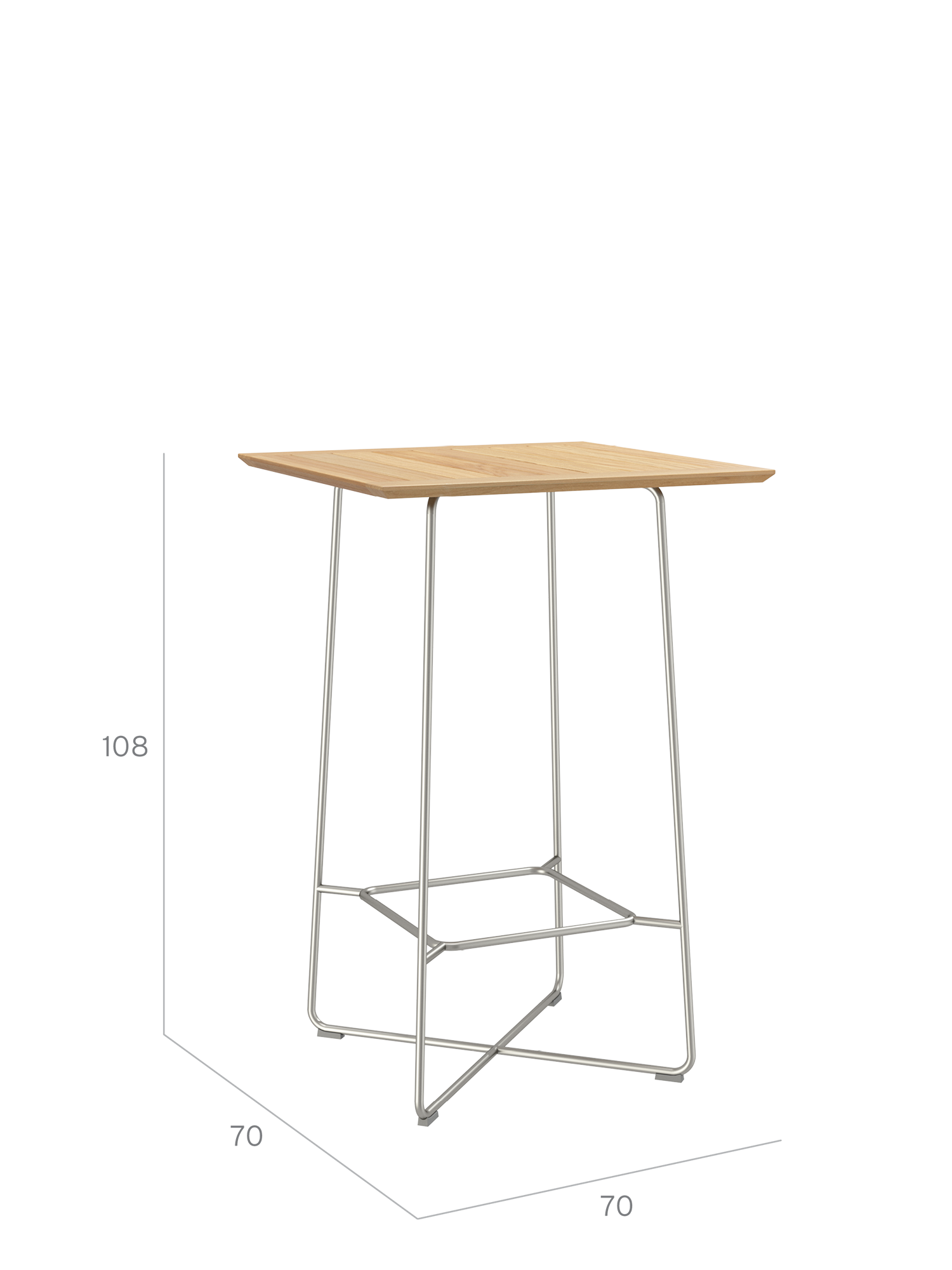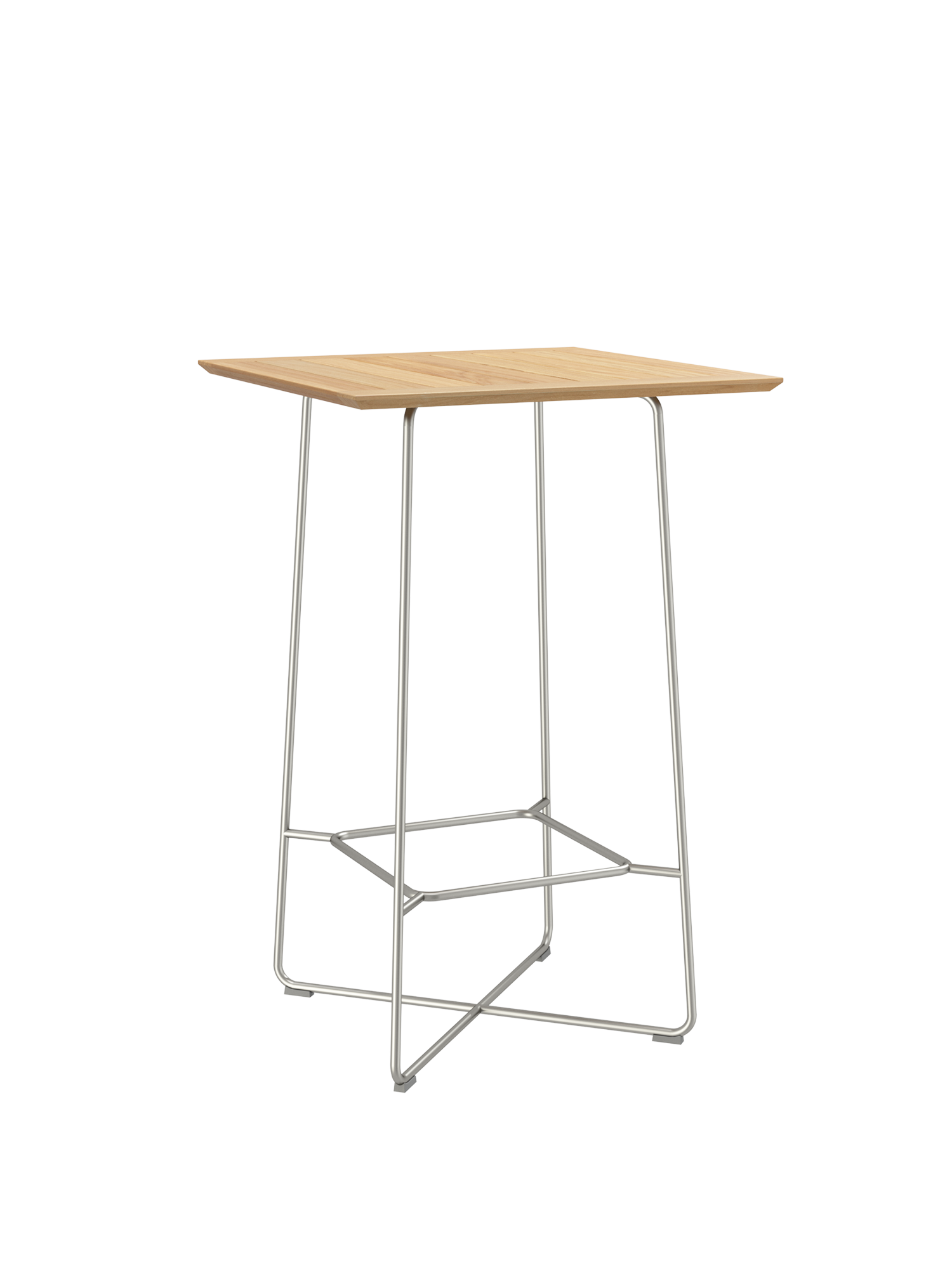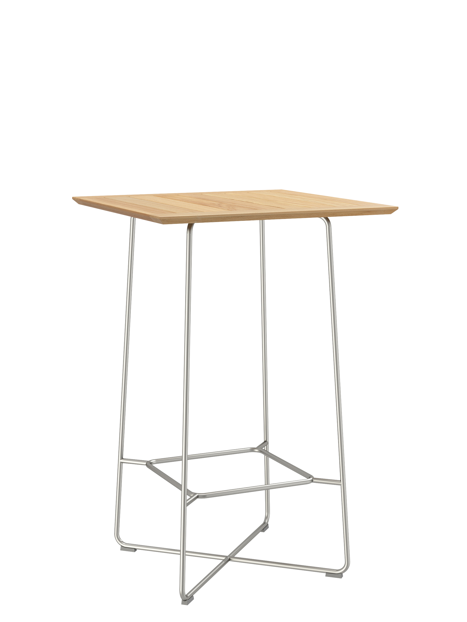 Der quadratische Bartisch passt perfekt zu den hohen Barstühlen der Benton Serie. Auf dem Gestell aus Edelstahl ruht eine Tischplatte aus wetterbeständigem Plantagenteakholz.