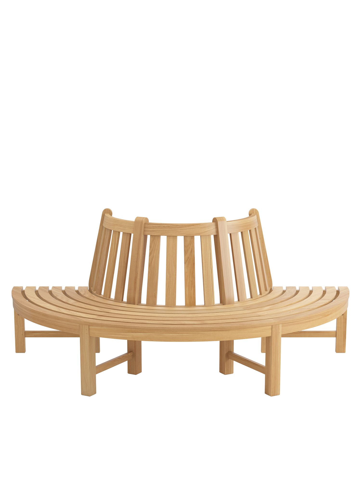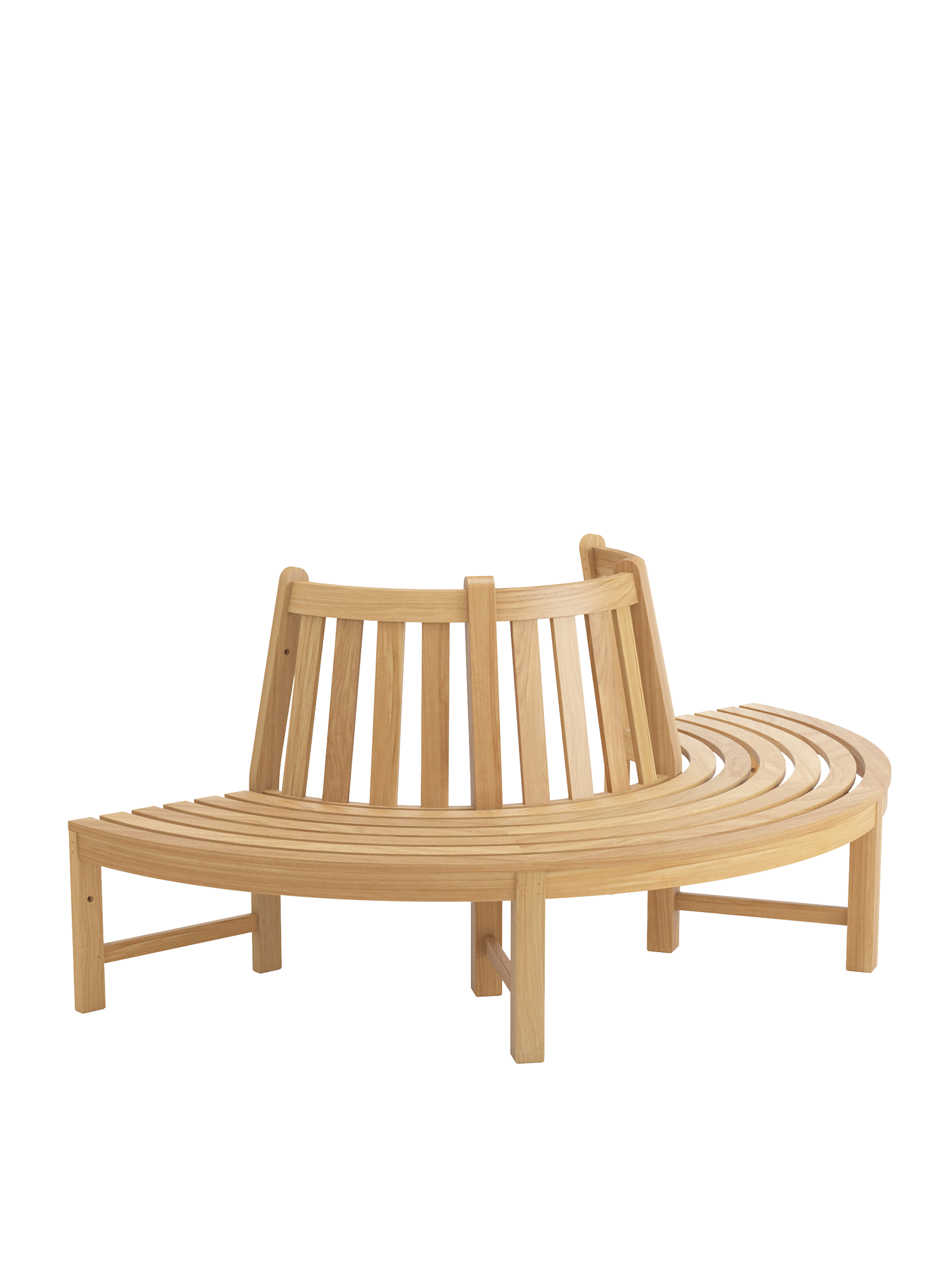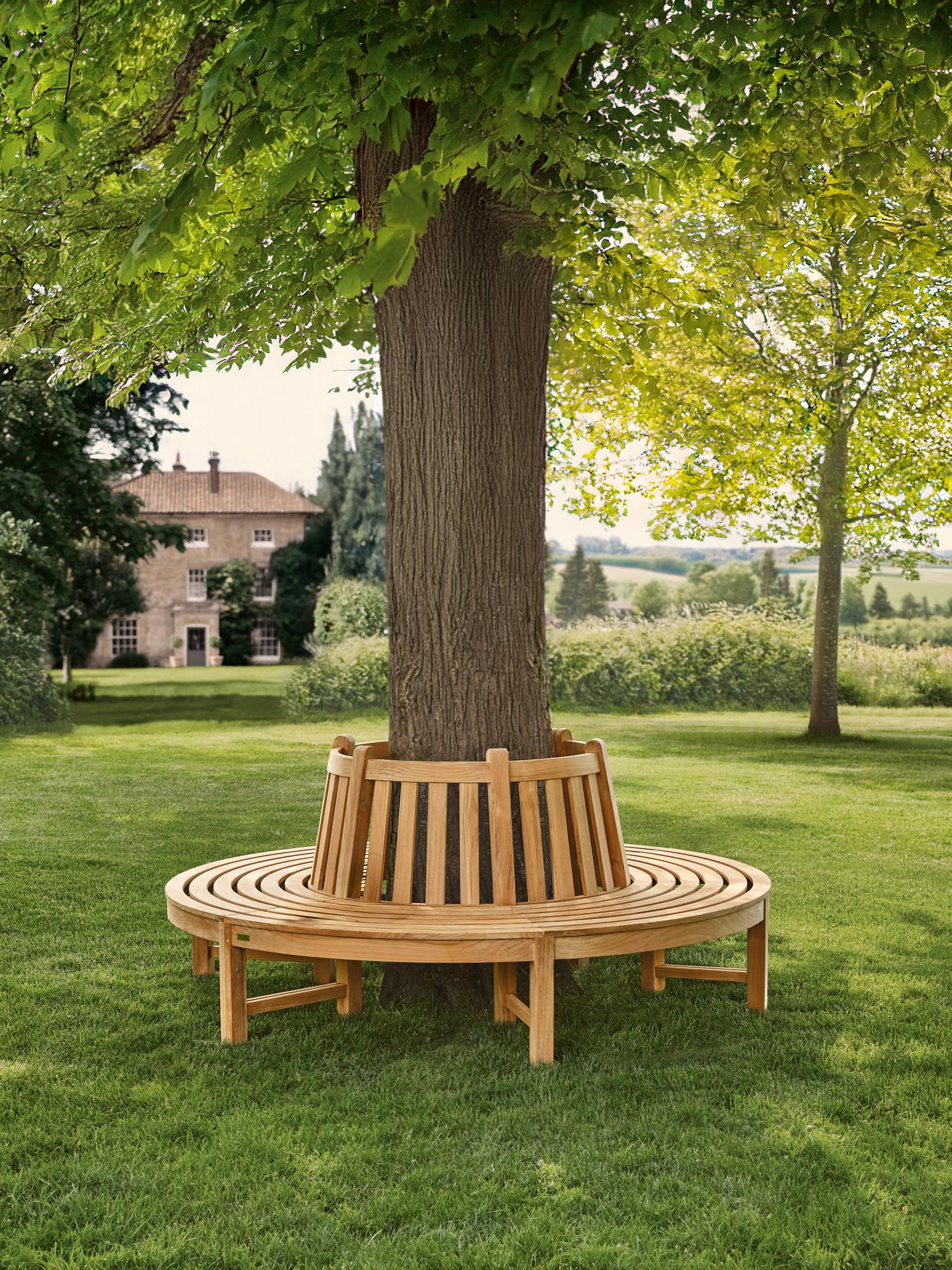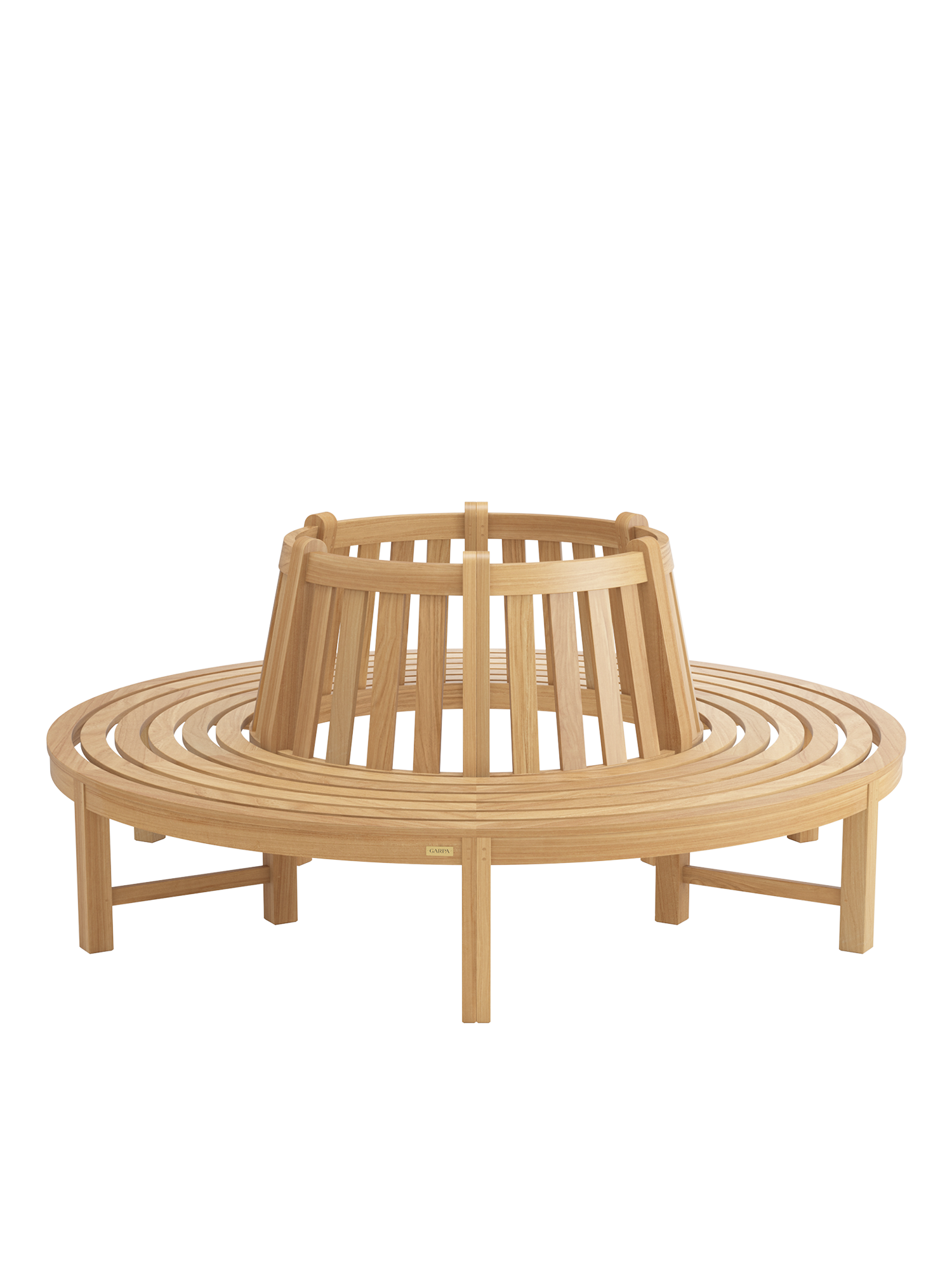 Die Baumbank aus Teak bittet zur klassischen Runde. Mit einem Innendurchmesser von 84 cm und einer Sitztiefe von 48 cm fügt sie sich um den Hausbaum – entweder als Halbkreis oder komplett. Für einen Vollkreis benötigen Sie zwei Halbkreise.