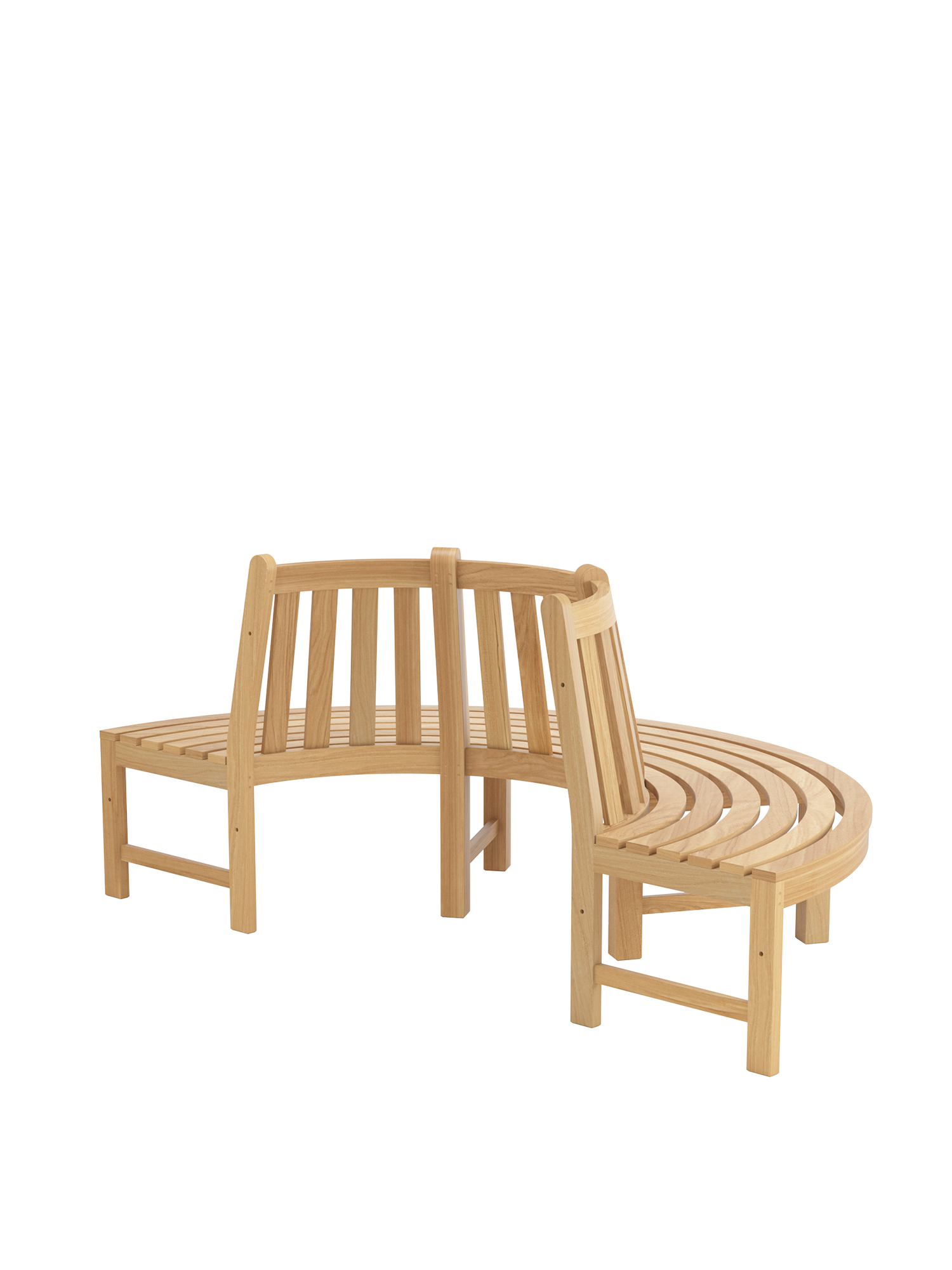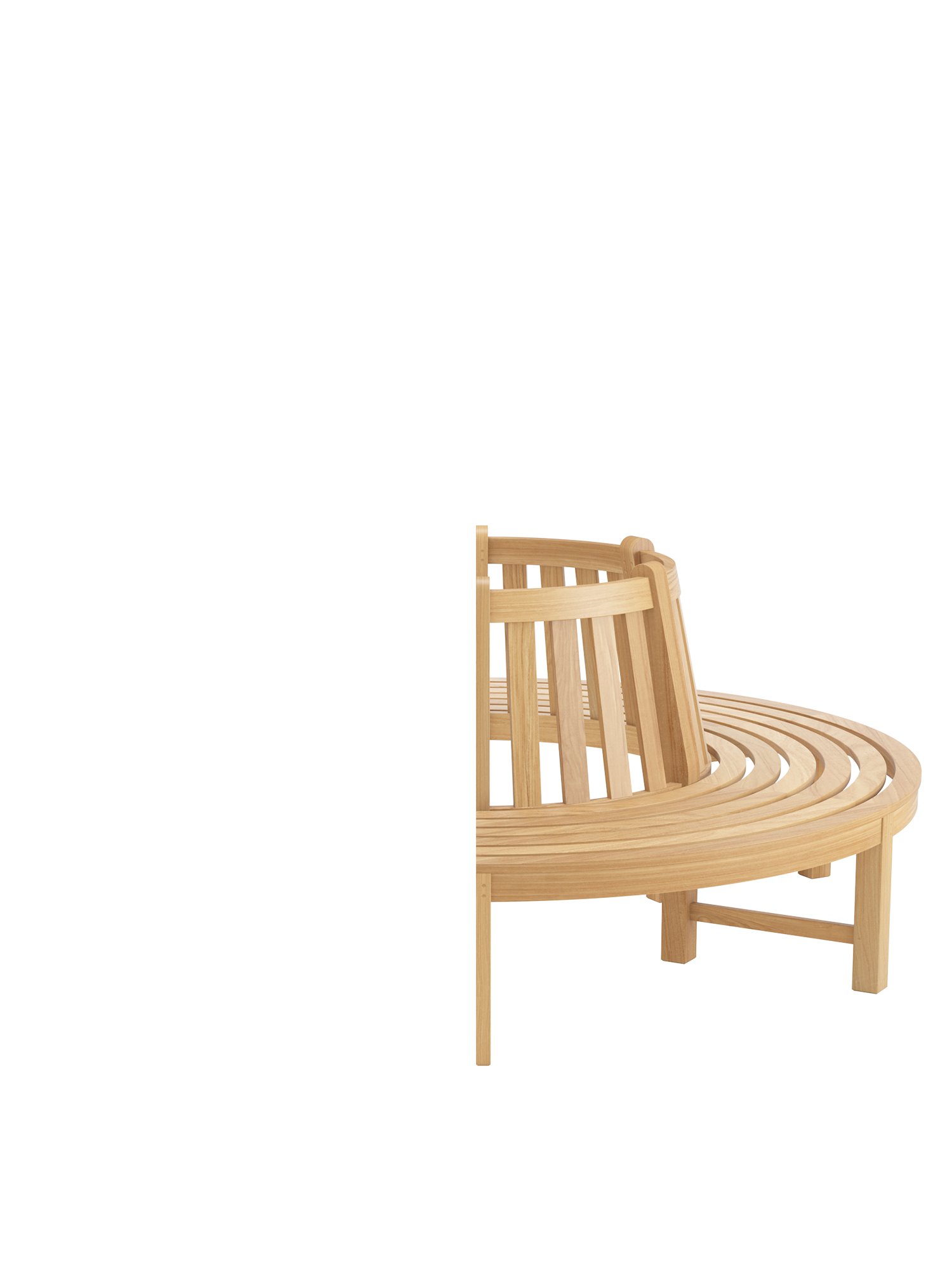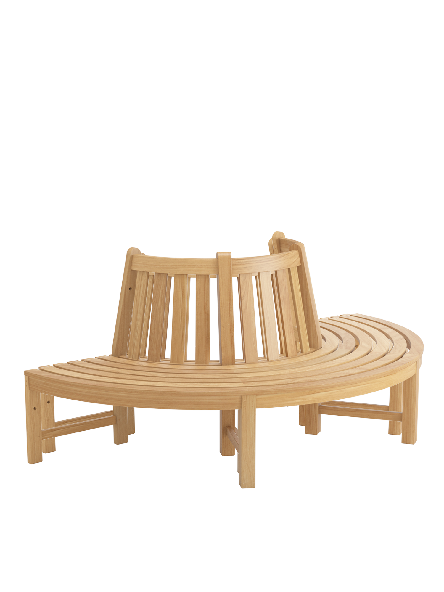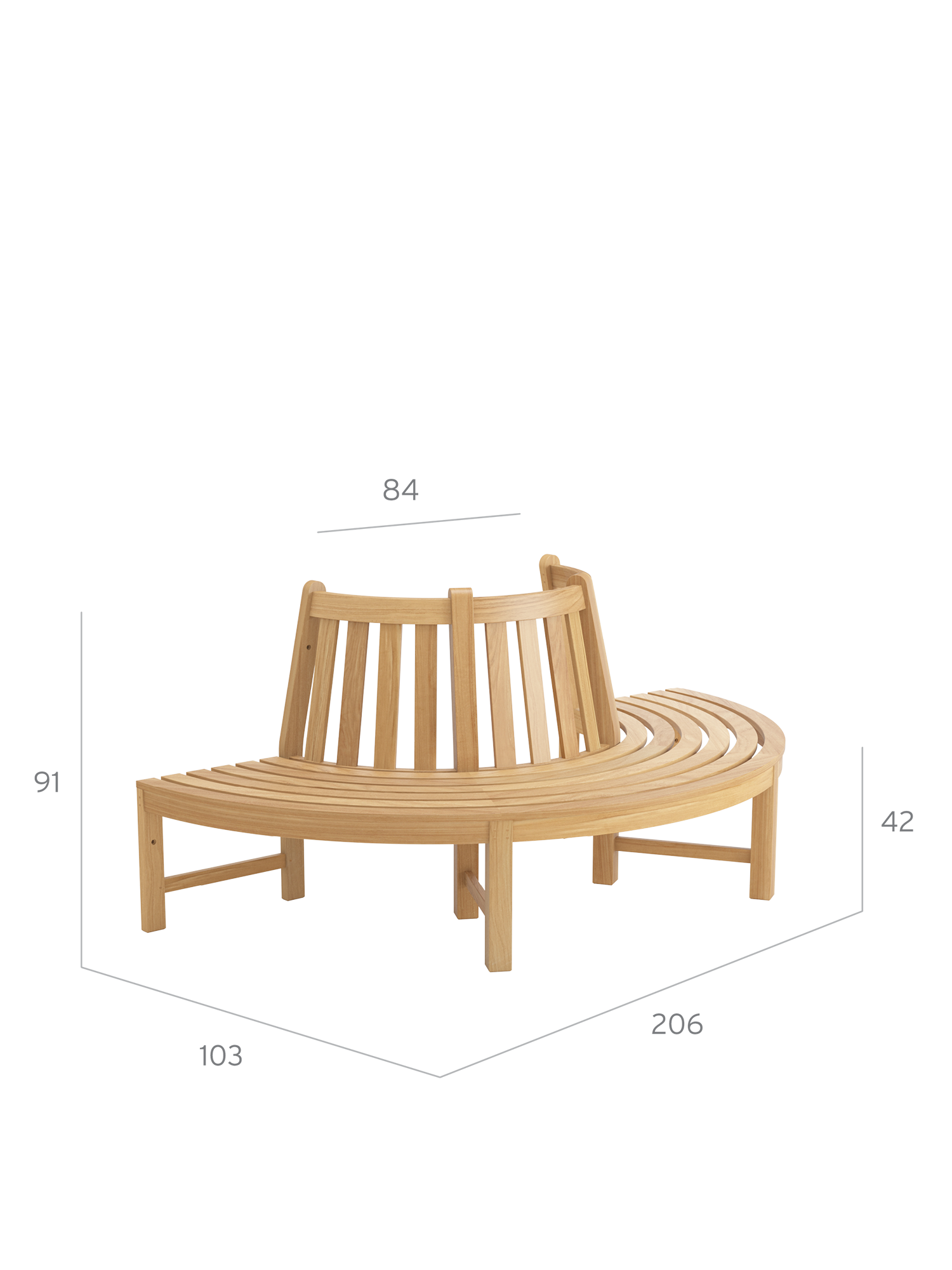 Die Baumbank aus Teak bittet zur klassischen Runde. Mit einem Innendurchmesser von 84 cm und einer Sitztiefe von 48 cm fügt sie sich um den Hausbaum – entweder als Halbkreis oder komplett. Für einen Vollkreis benötigen Sie zwei Halbkreise.