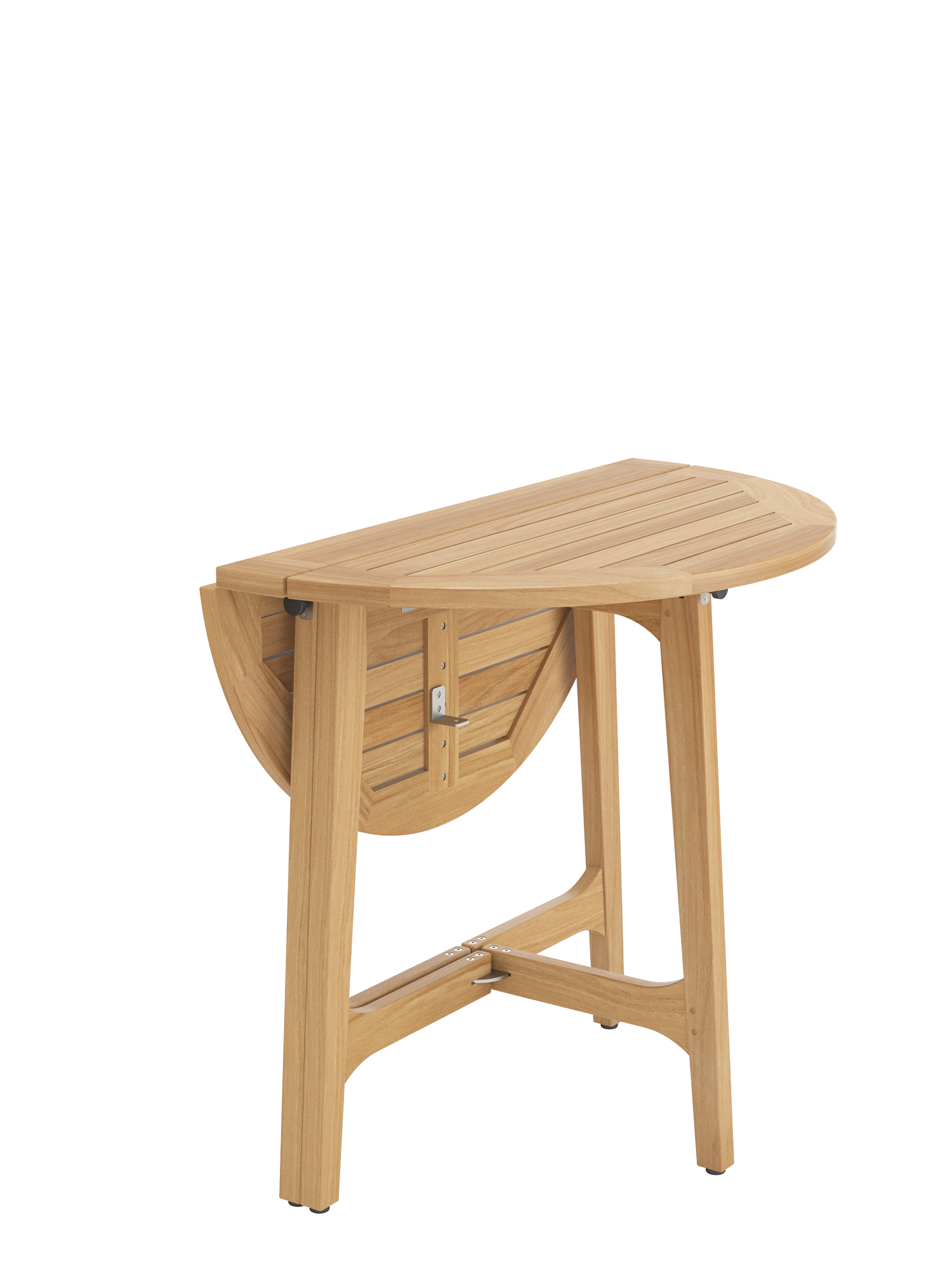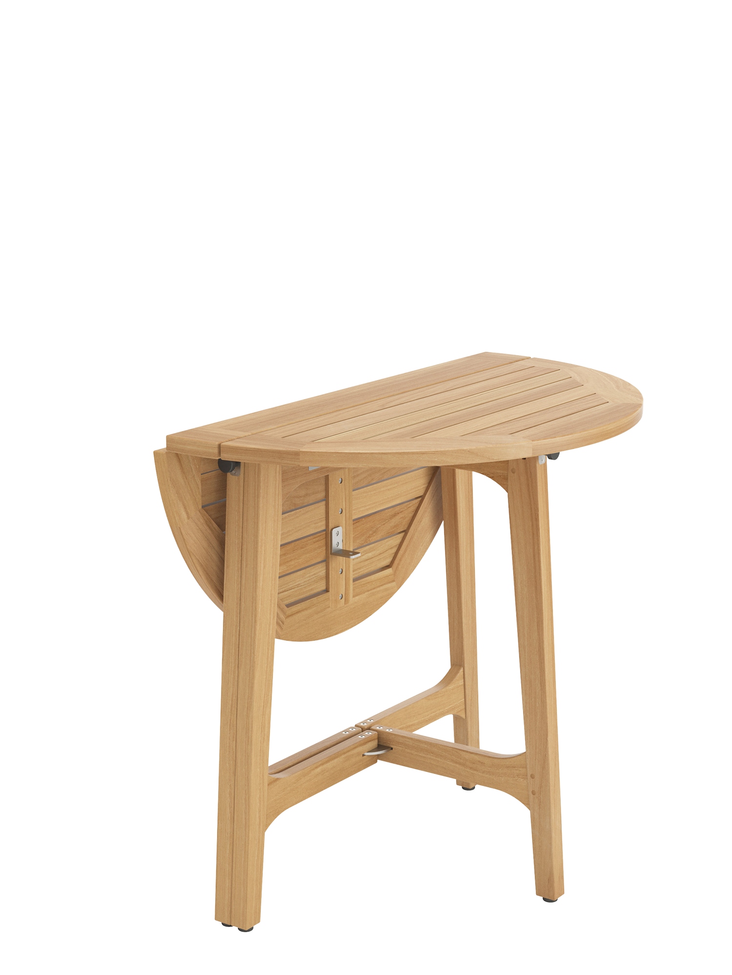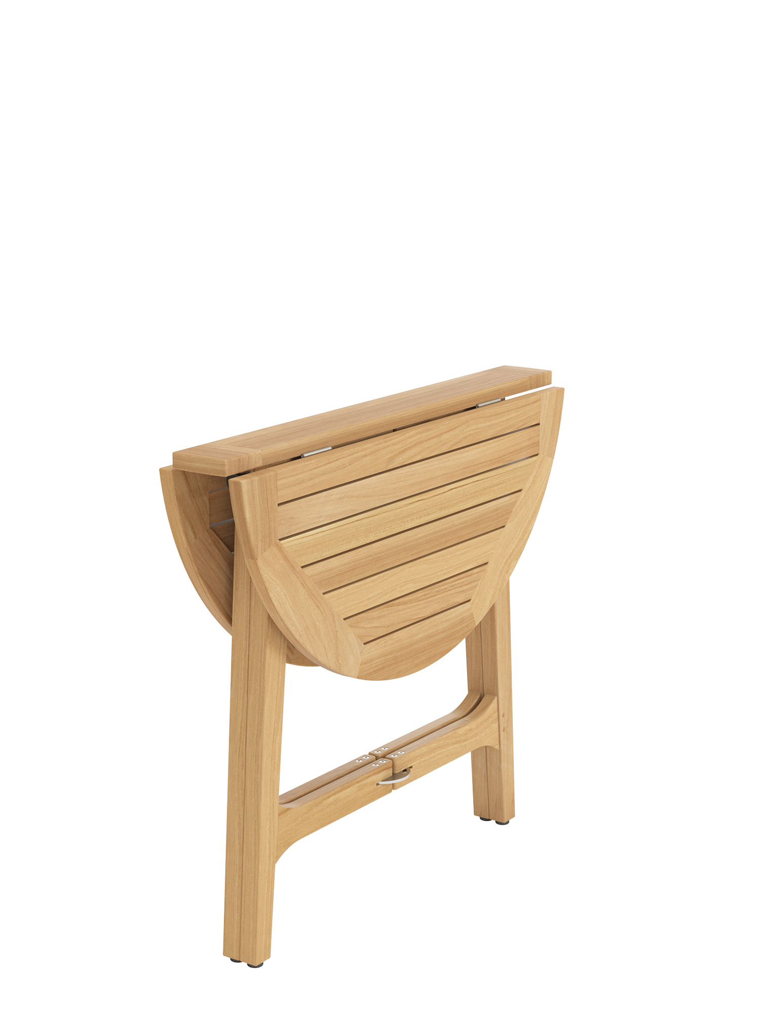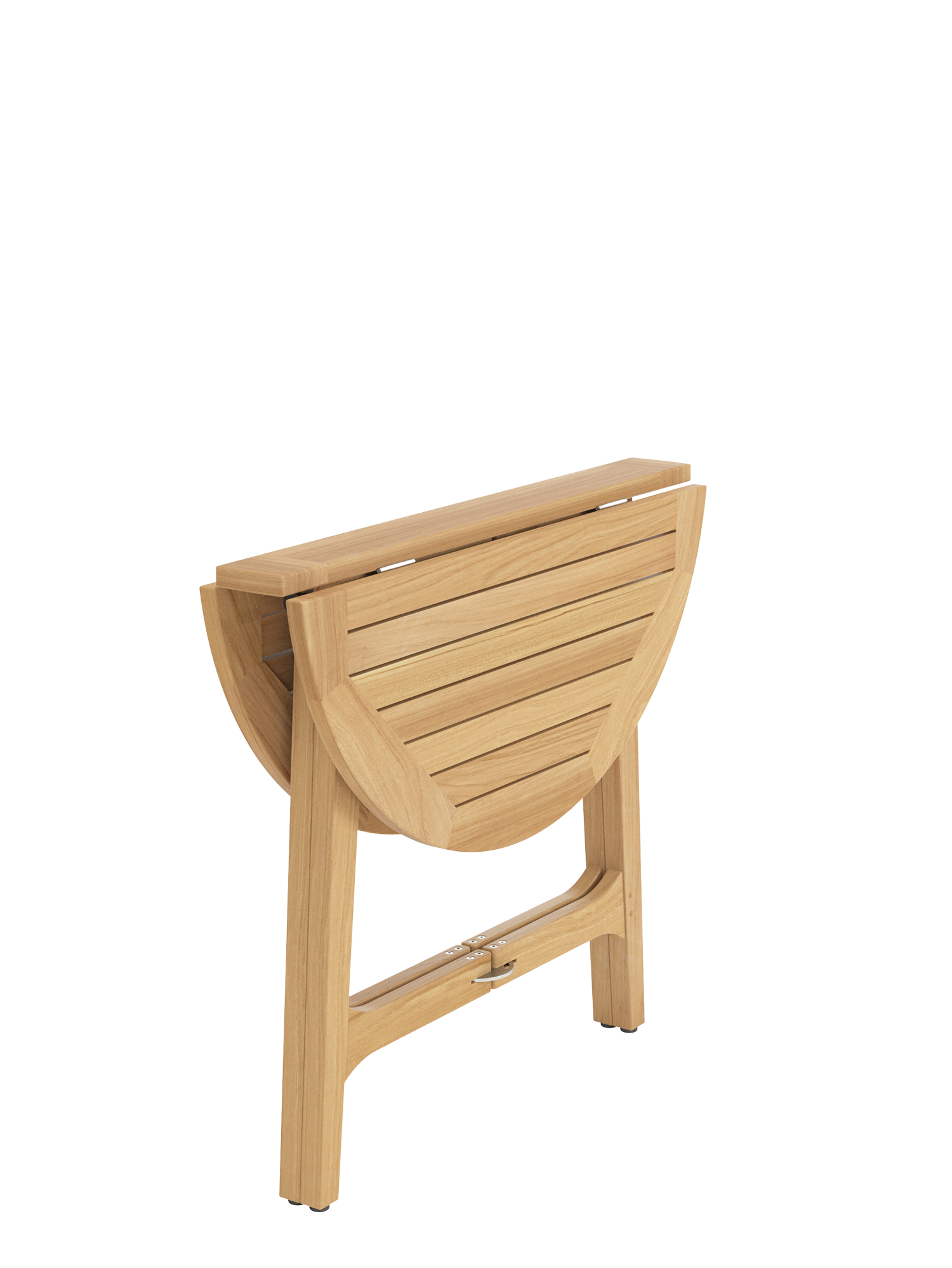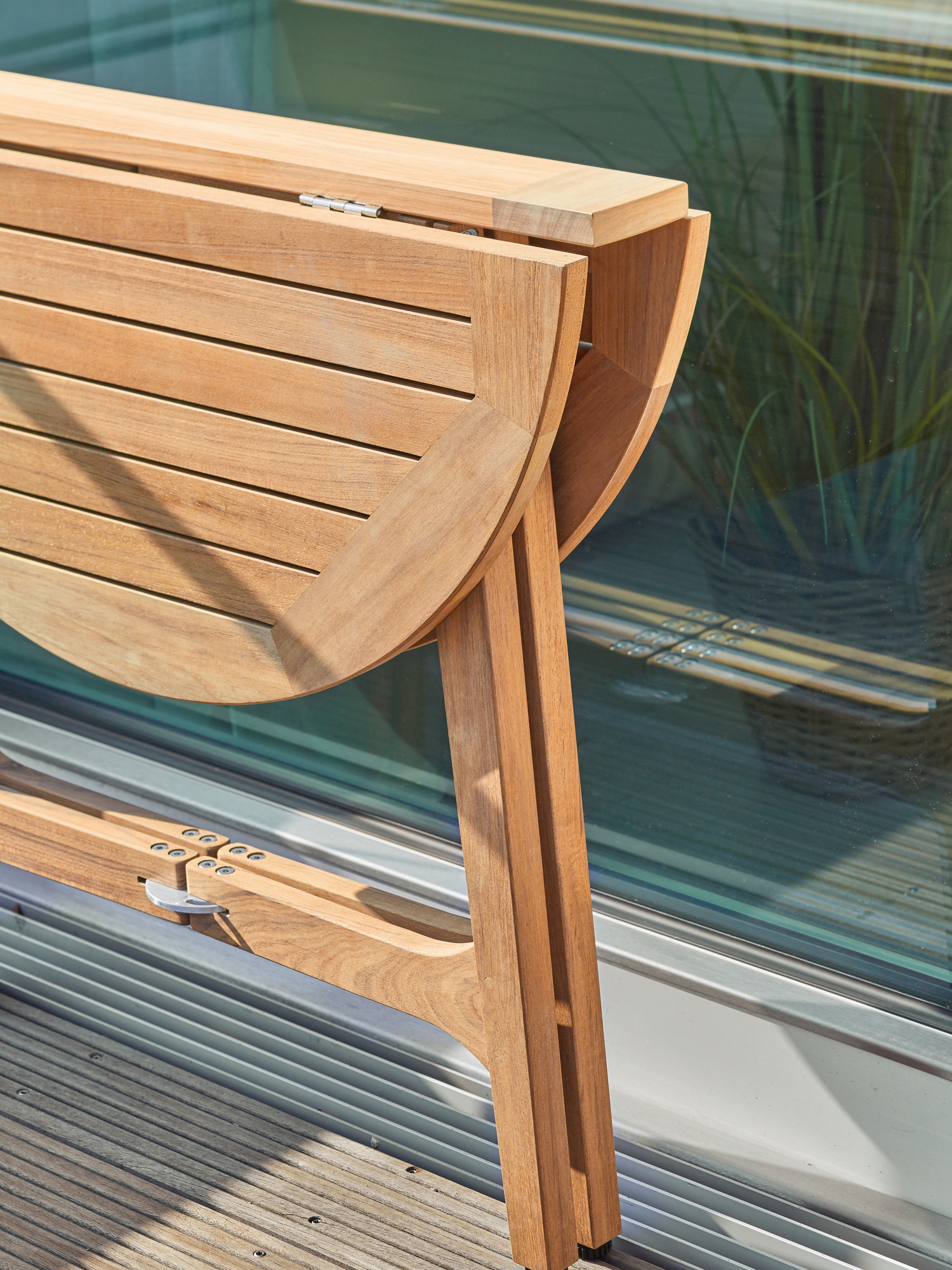 Der Verwandlungskünstler aus Teak mit Edelstahlführungen ist ein flexibles Möbel für kleine Balkone und Terrassen. Halb aufgeklappt lehnt der Tisch sicher an einer Wand. Der sog. ""Gateleg Table"" mit zwei herunterklappbaren Flügeln ist ursprünglich eine praktische englische Erfindung des 16. Jahrhunderts. Dank seines Gewichts von 11 kg lässt er sich unkompliziert zum Lieblingsplatz bewegen. Geklappt hat der Tisch eine Tiefe von 13,5 cm.