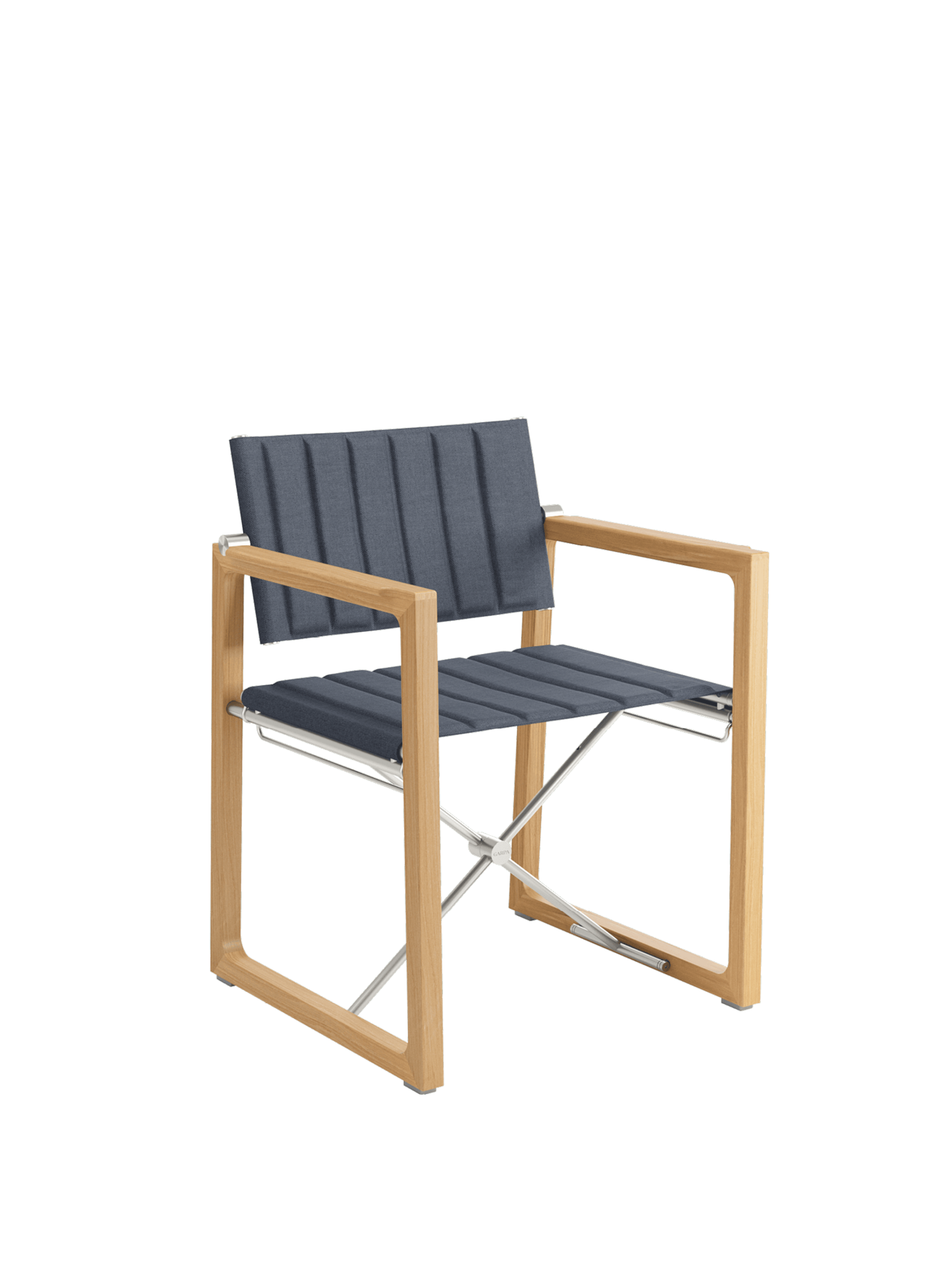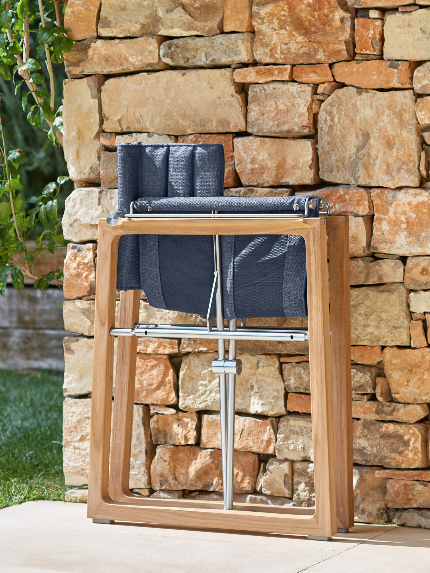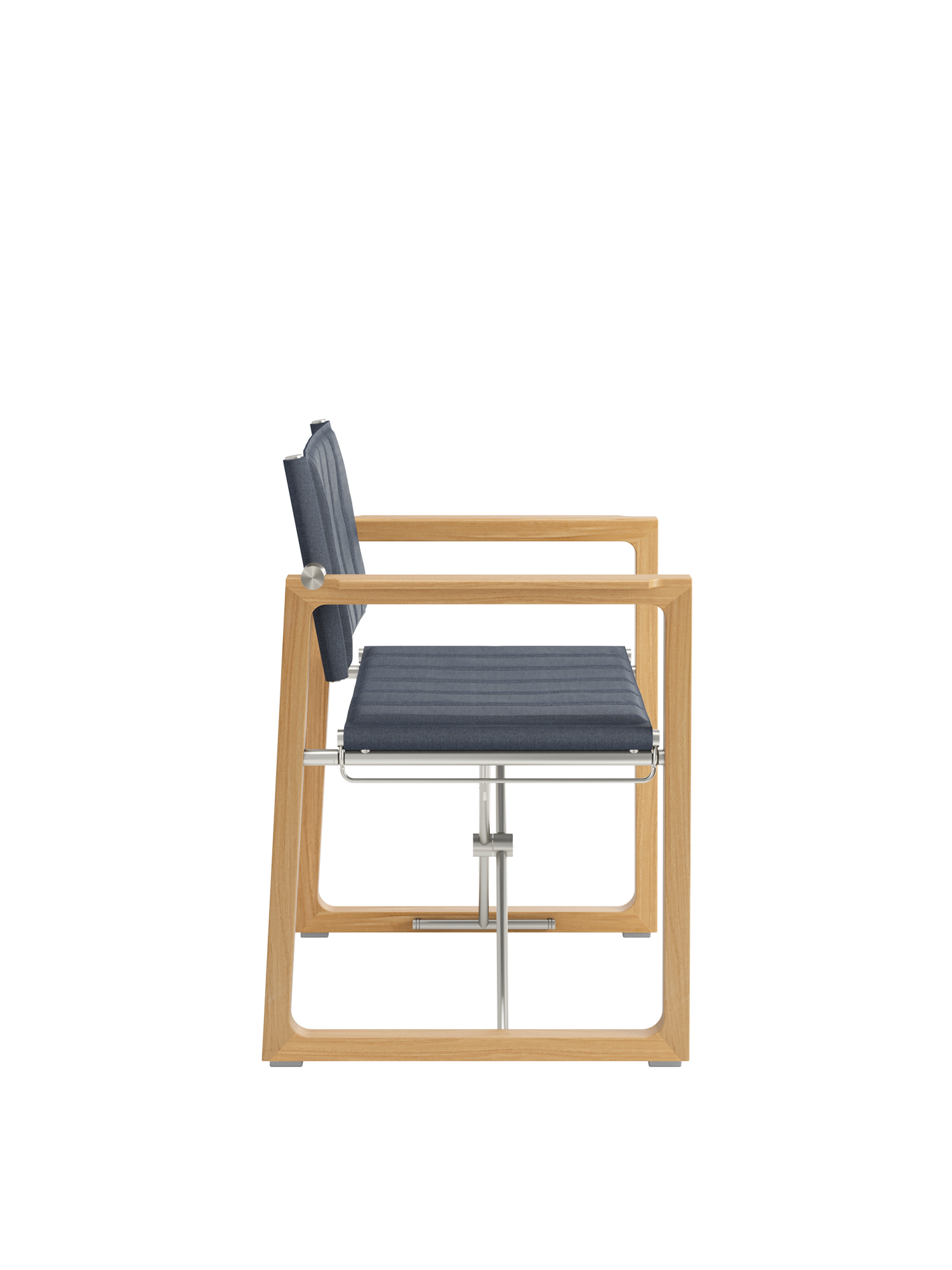 Die modernen Armlehnstühle verbreiten ein unbeschwertes Lebensgefühl. Geradlinige Teakholzwangen rahmen Sitz- und Rückenpolster; ein Edelstahlkreuz verbindet die puristische, dabei äusserst komfortable Konstruktion. Aus satiniertem Edelstahl sind auch die Gelenke, die die Rückenlehne in die bequemste Position bringen.