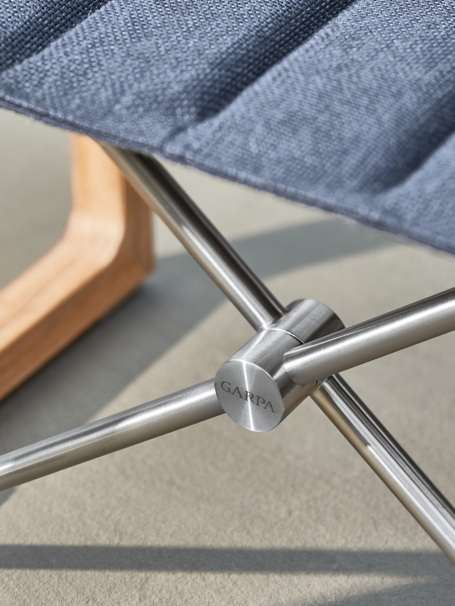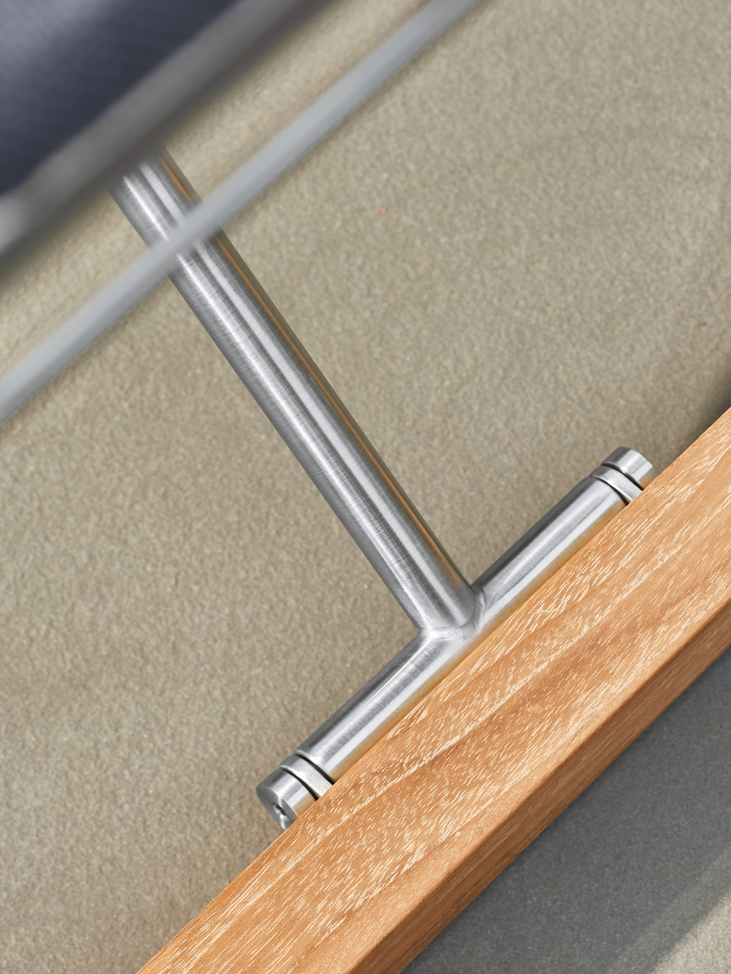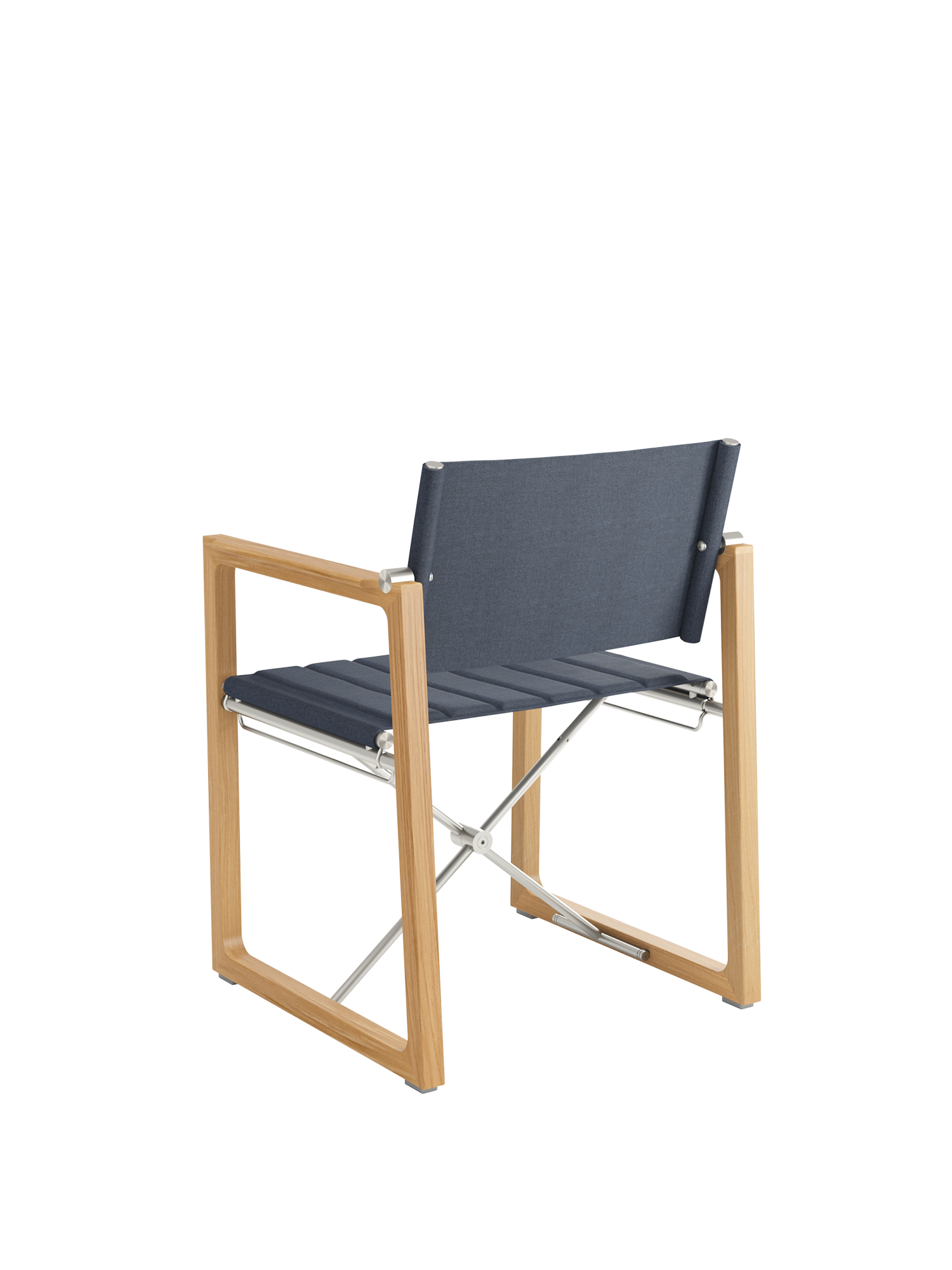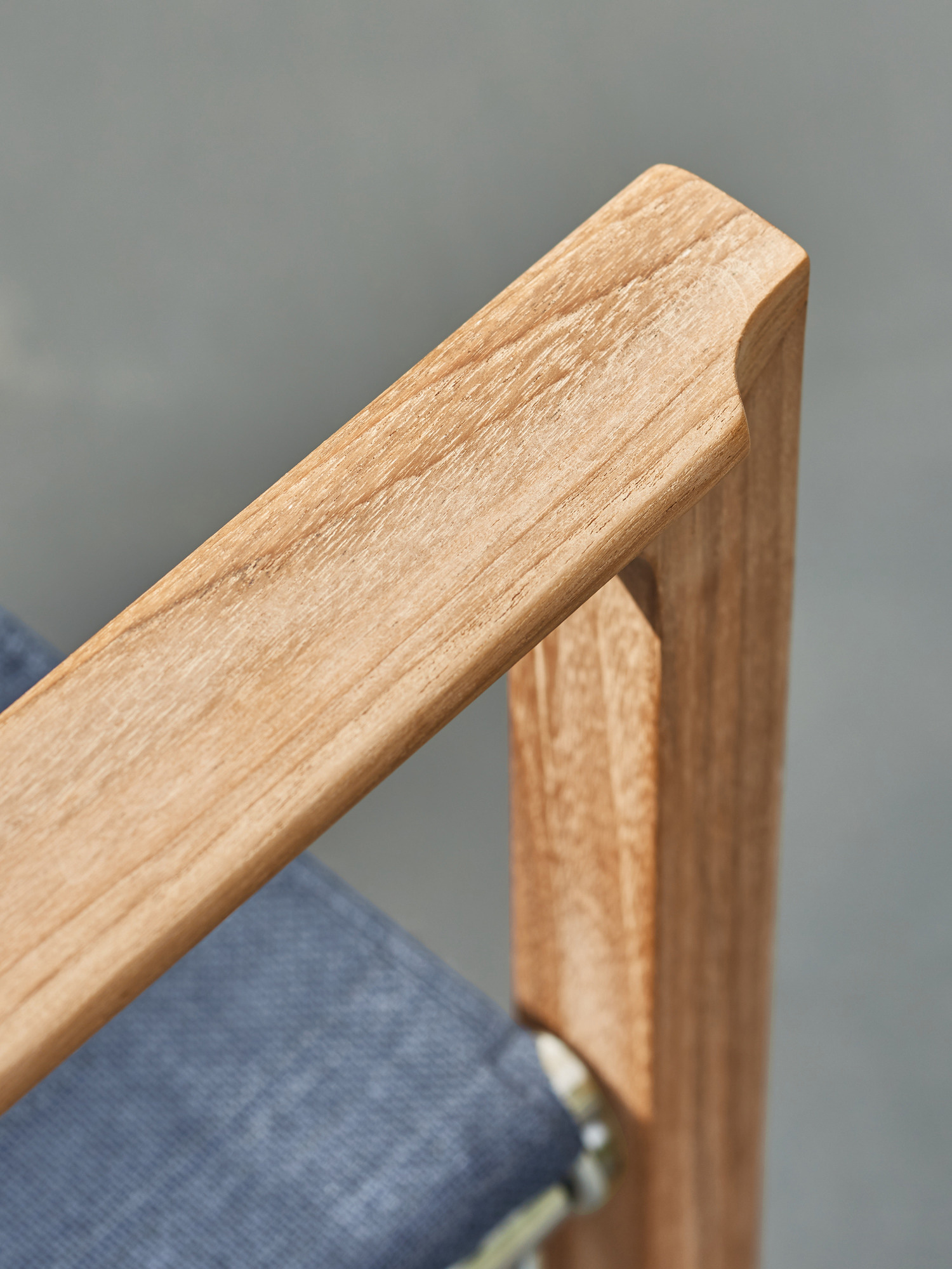 Die modernen Armlehnstühle verbreiten ein unbeschwertes Lebensgefühl. Geradlinige Teakholzwangen rahmen Sitz- und Rückenpolster; ein Edelstahlkreuz verbindet die puristische, dabei äusserst komfortable Konstruktion. Aus satiniertem Edelstahl sind auch die Gelenke, die die Rückenlehne in die bequemste Position bringen.