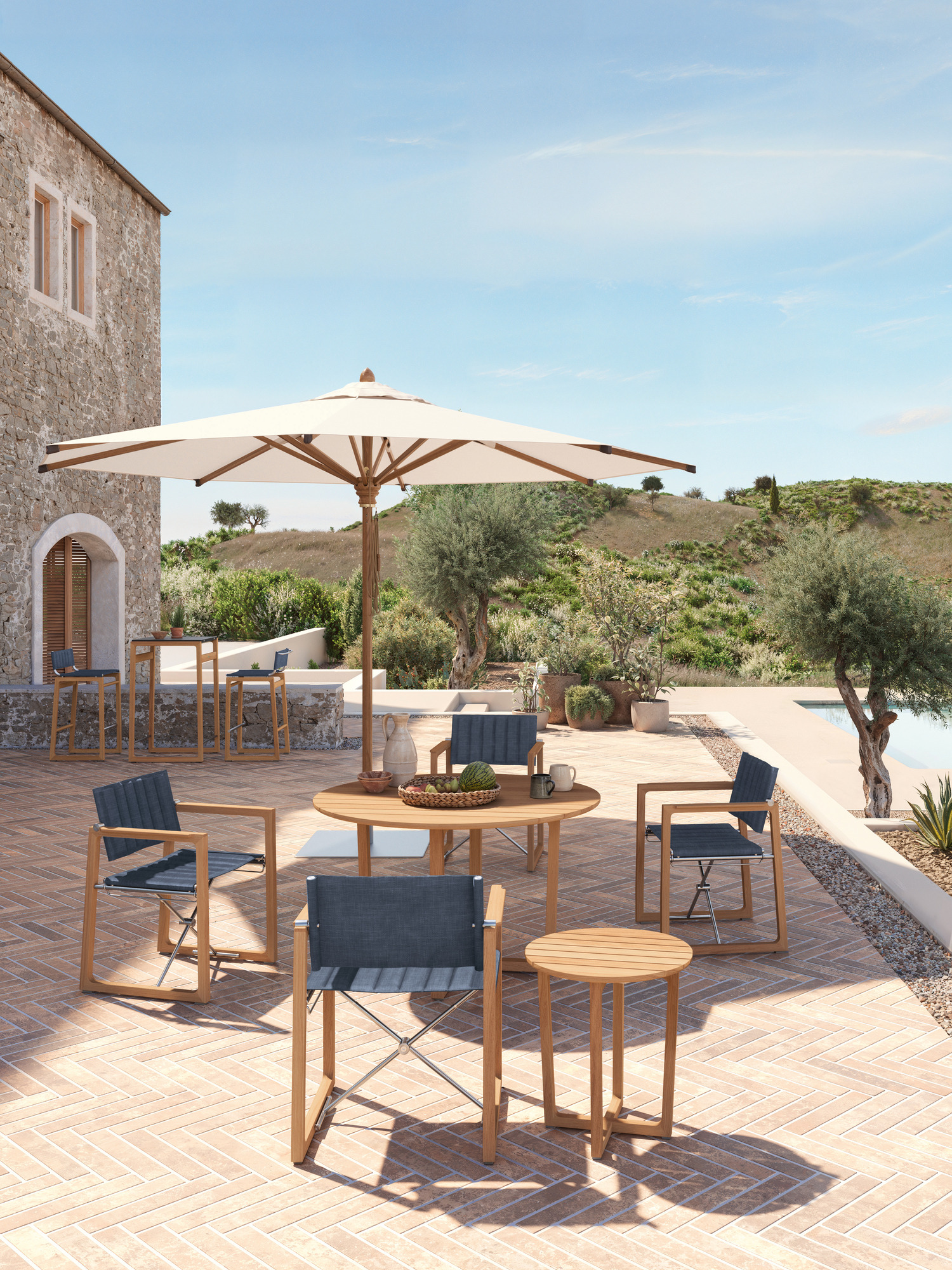 Teakholzwangen und Edelstahlkreuz prägen auch das Design der Benton Tische, deren Leisten an der Unterseite geschmeidig gerundet sind, was optisch und haptisch für einen angenehmen Effekt sorgt. Die eleganten Tische aus massivem und aufwendig verarbeitetem Plantagenteakholz sind in vier verschiedenen Grössen und in runder oder eckiger Form erhältlich.