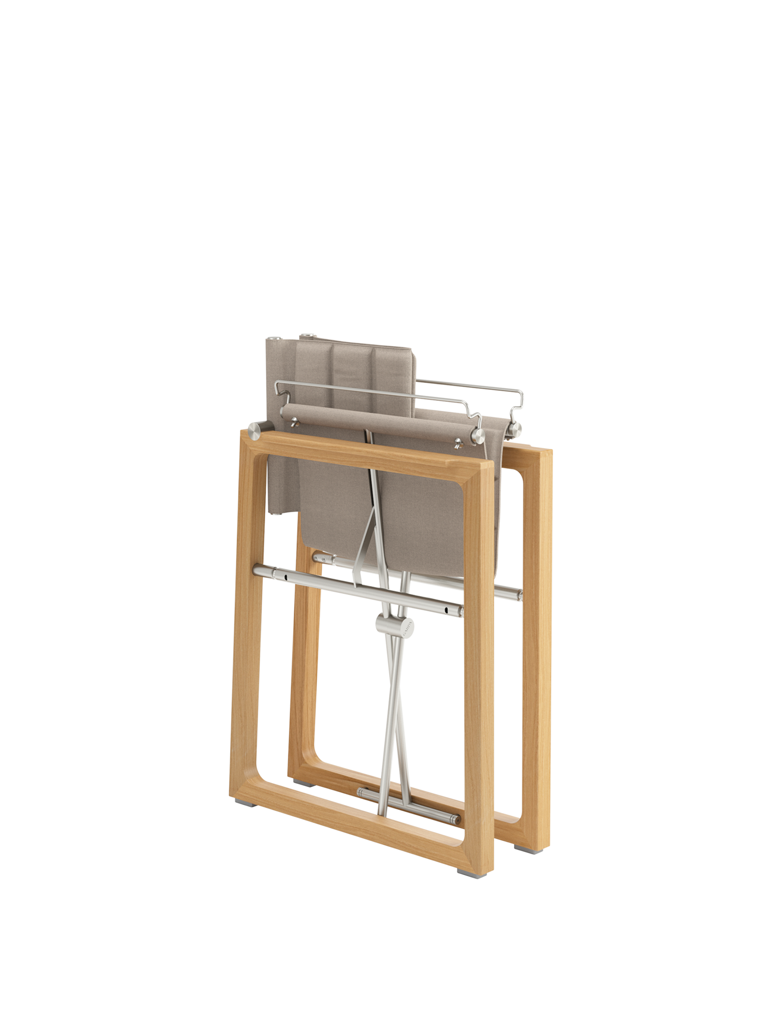 Arretiert werden die klappbaren Armlehnstühle mit schmalen Bügeln seitlich der Sitze; zusammengeklappt beanspruchen sie wenig Platz.