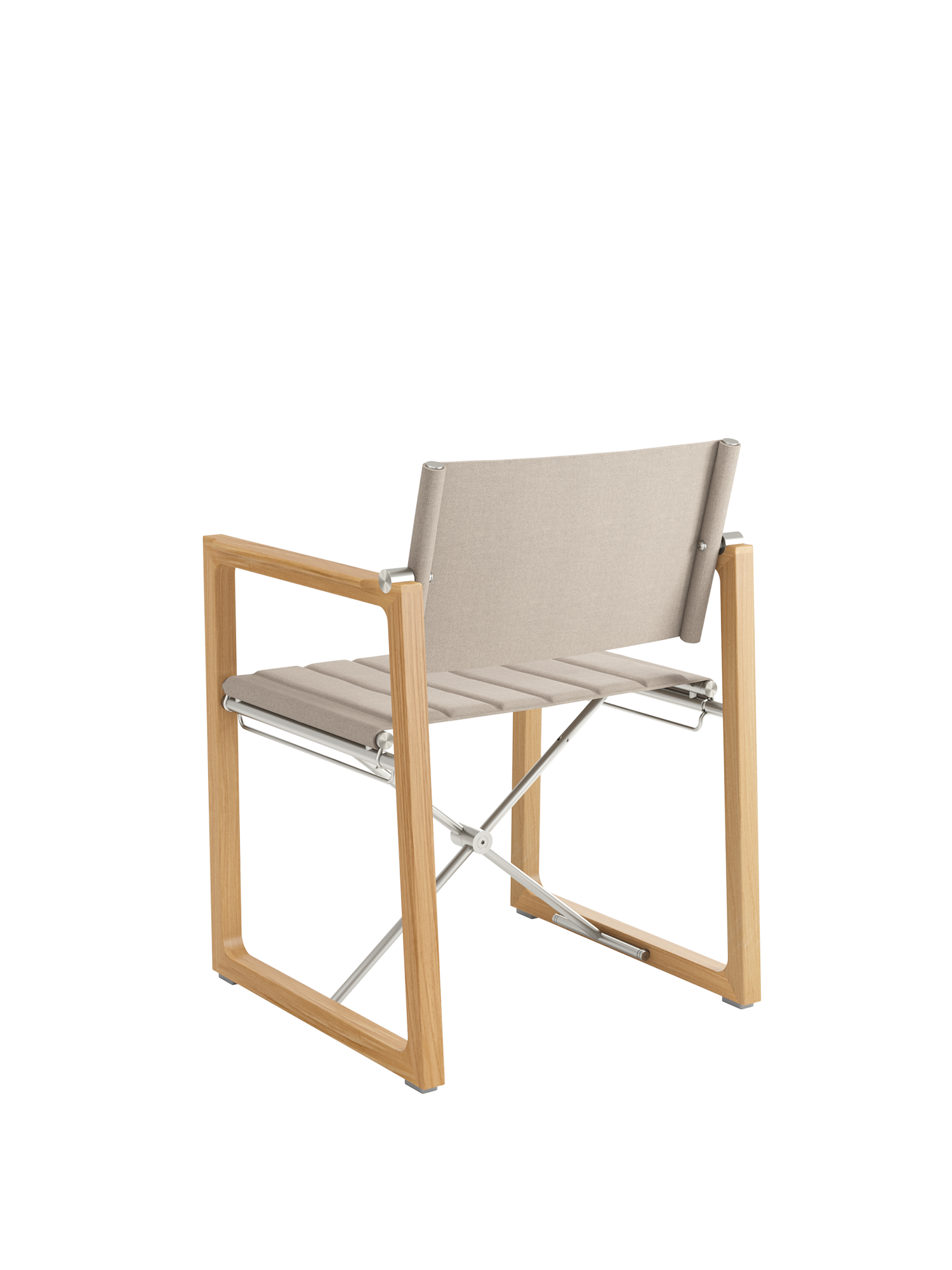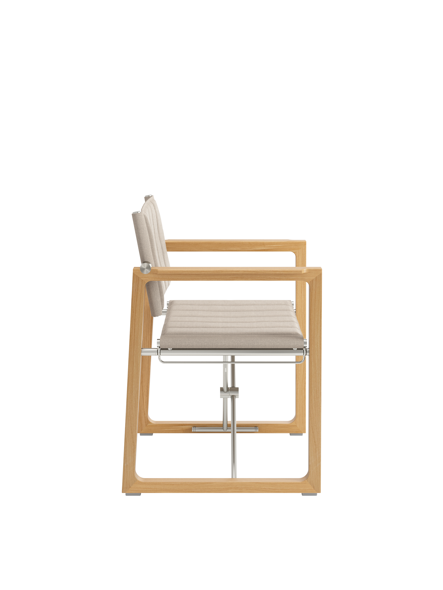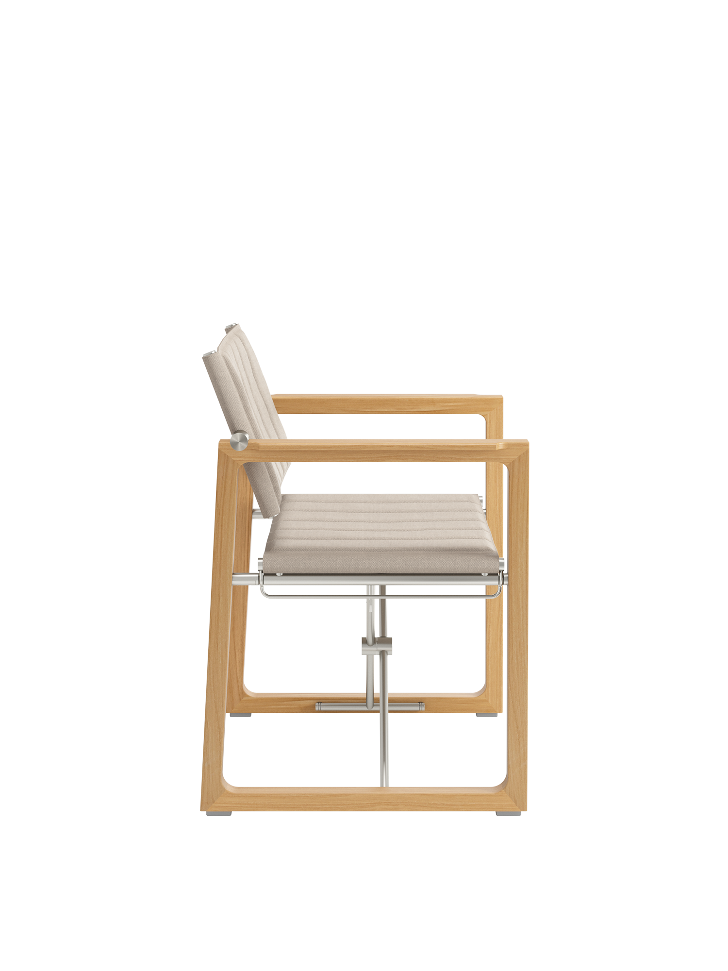 Die modernen Armlehnstühle verbreiten ein unbeschwertes Lebensgefühl. Geradlinige Teakholzwangen rahmen Sitz- und Rückenpolster; ein Edelstahlkreuz verbindet die puristische, dabei äusserst komfortable Konstruktion. Aus satiniertem Edelstahl sind auch die Gelenke, die die Rückenlehne in die bequemste Position bringen.