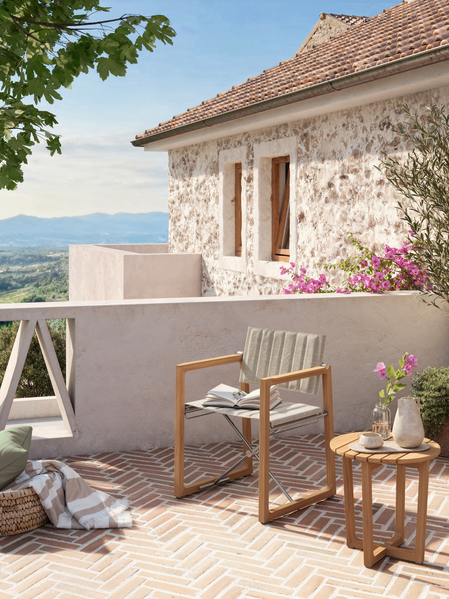 Benton ist klappbar oder als feste Variante erhältlich. Die Stühle lassen angenehm viel Beinfreiheit und erfüllen höchste Ansprüche an Komfort. Ihre gesteppten Sitzflächen und Rückenlehnen aus Polymergewebe in den Farbtönen Steingrau oder Rauchblau sind angenehm anschmiegsam, pflegeleicht und nach einem Regenschauer schnell wieder trocken.
