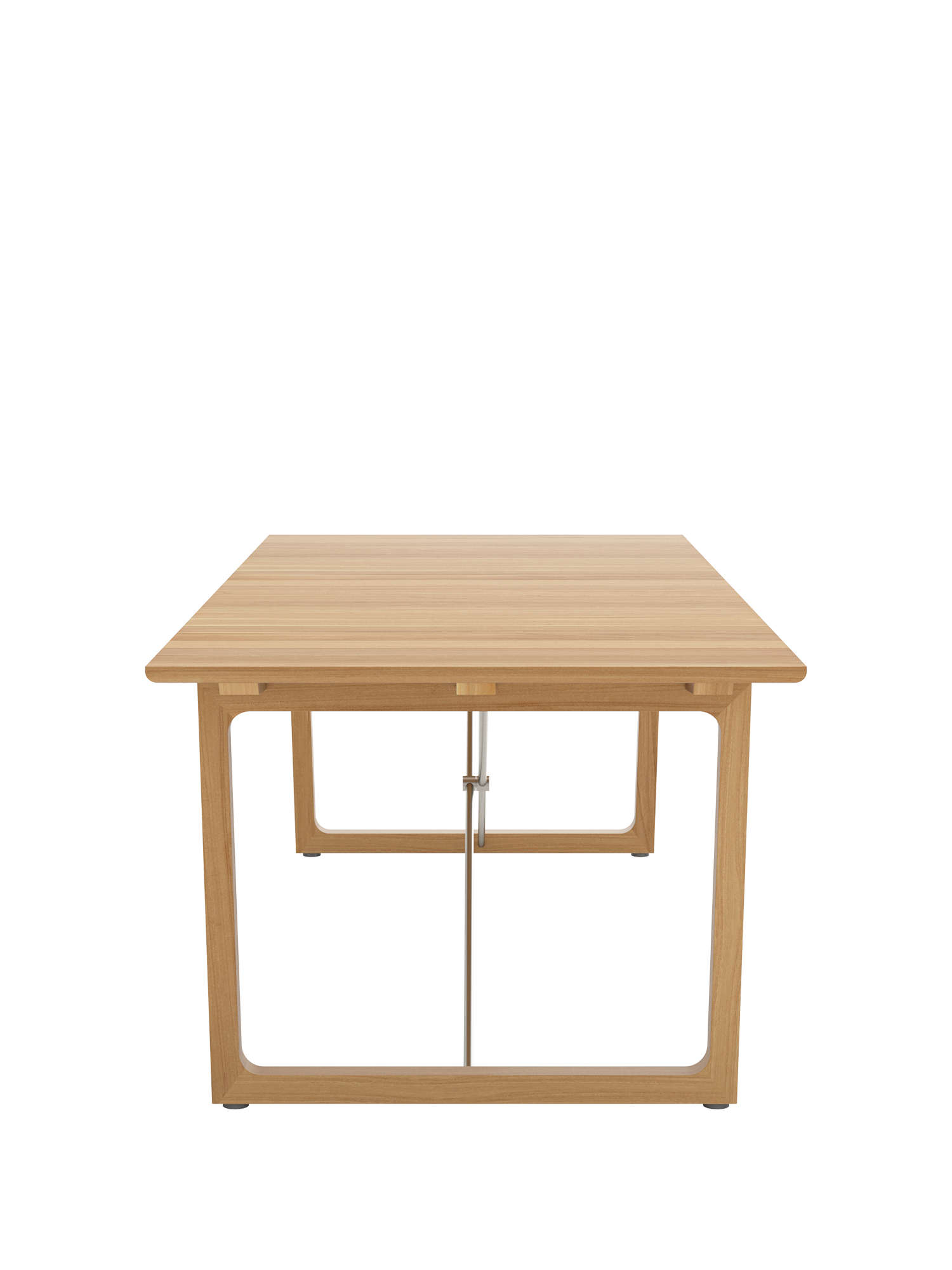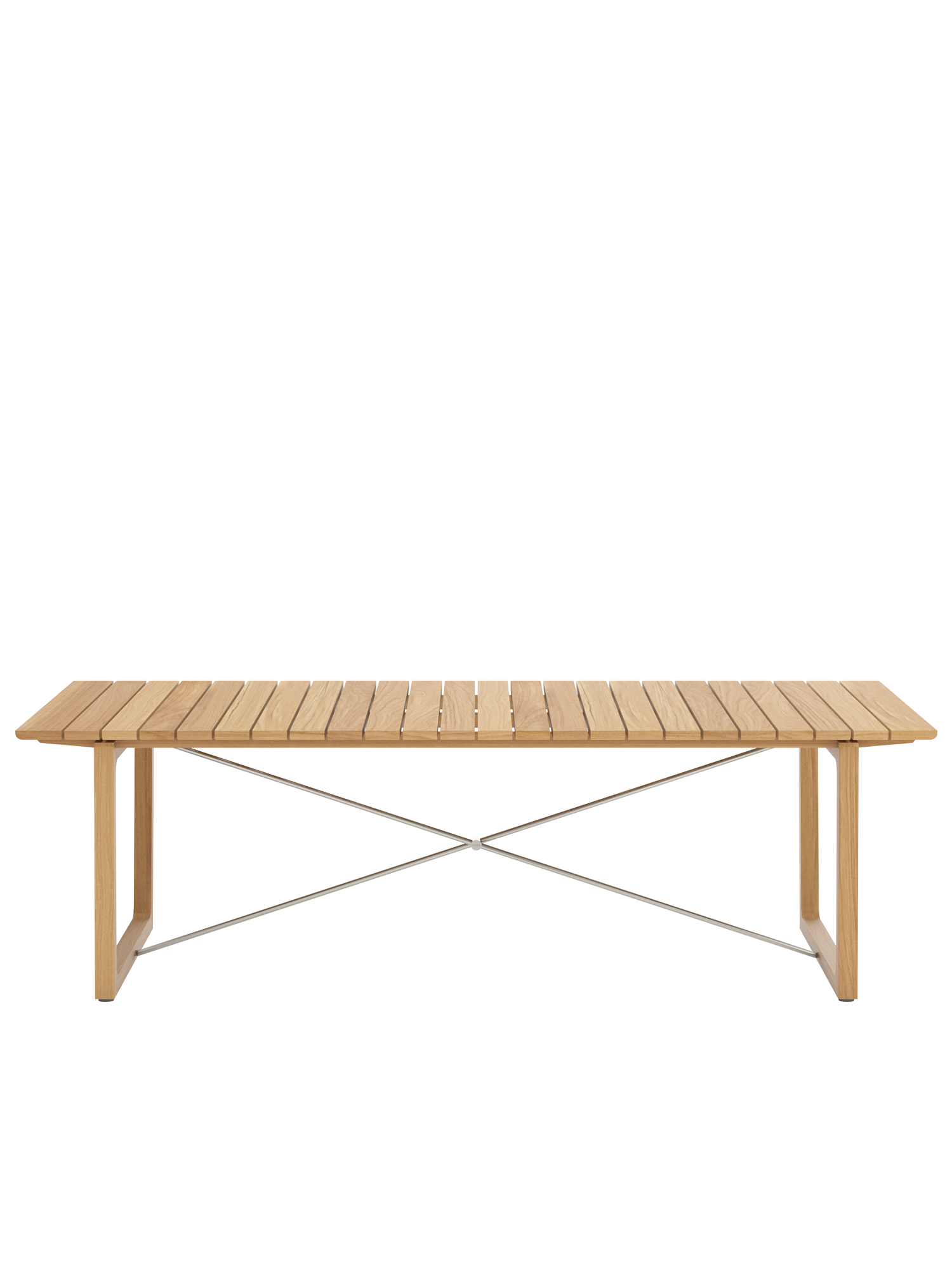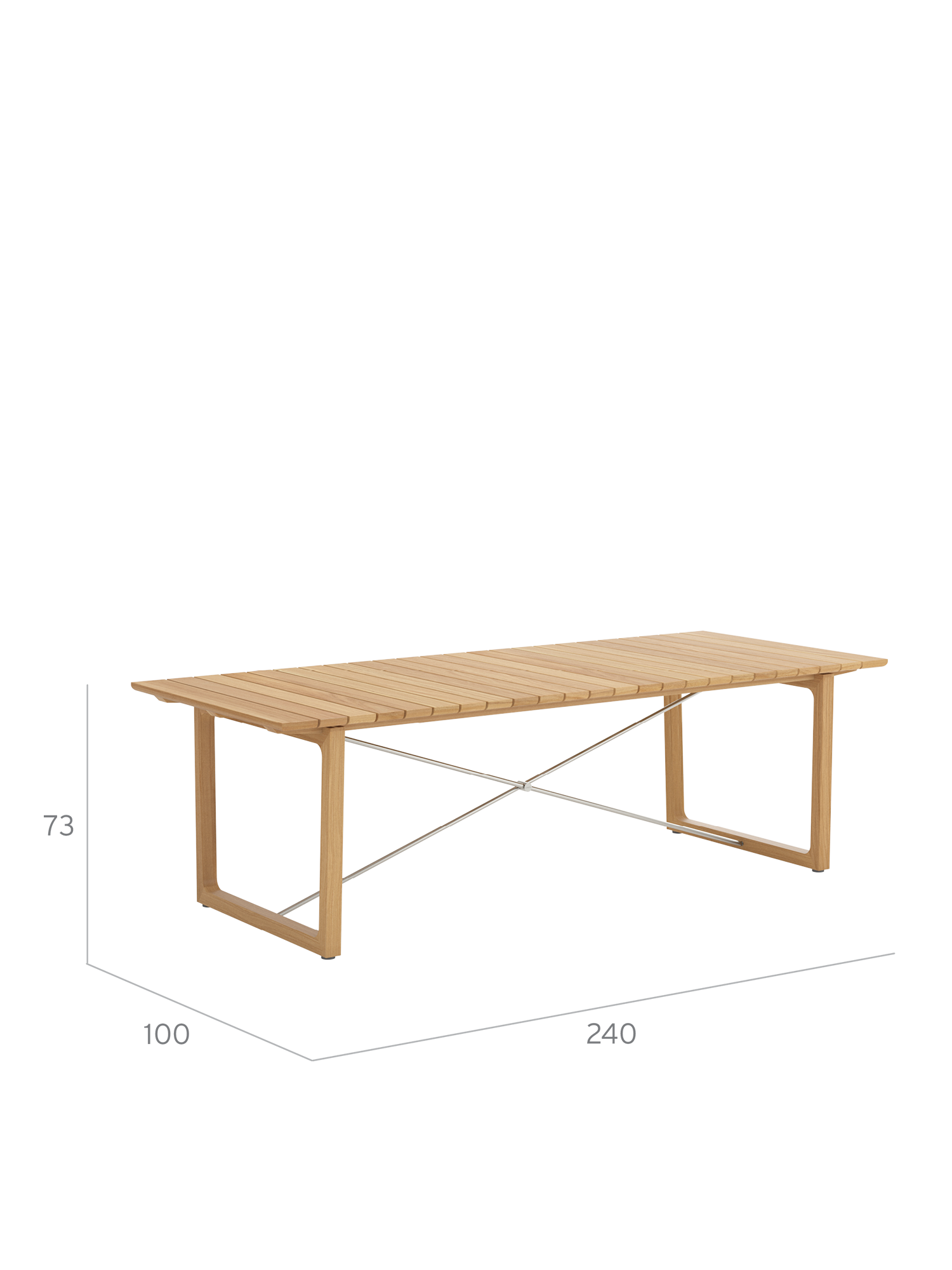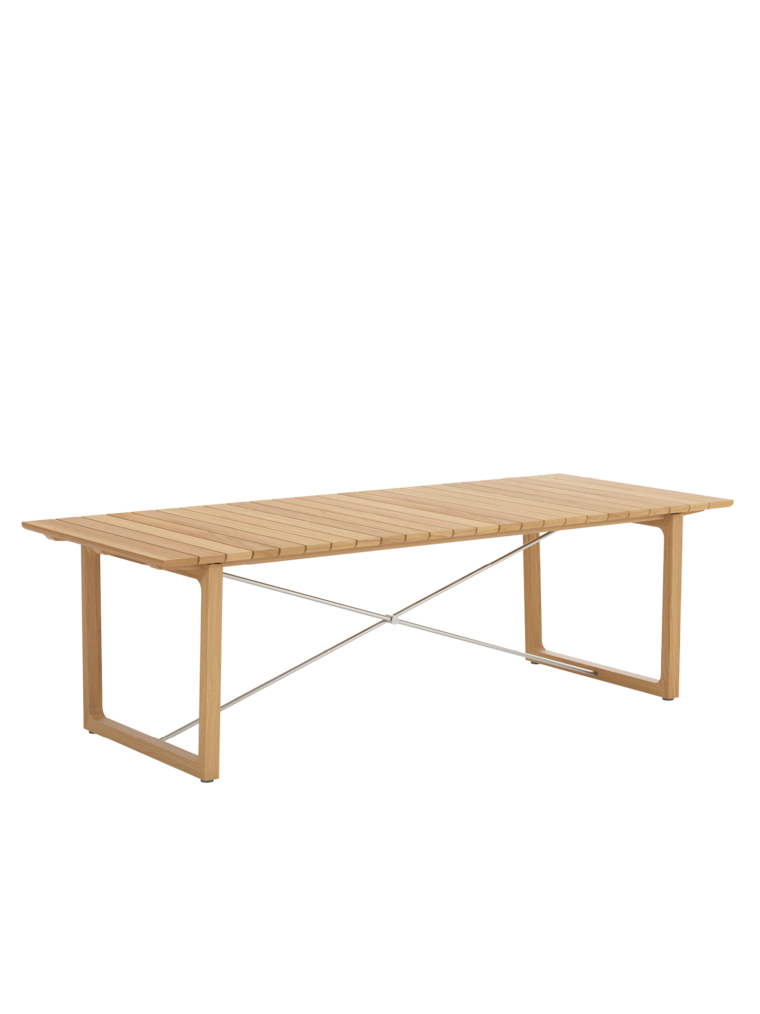 Teakholzwangen und Edelstahlkreuz prägen das Design der rechteckigen Benton Tische, deren Leisten an der Unterseite geschmeidig gerundet sind, was optisch und haptisch für einen angenehmen Effekt sorgt. Die eleganten Tische aus massivem und aufwendig verarbeitetem Plantagenteakholz sind in zwei verschiedenen Grössen erhältlich.