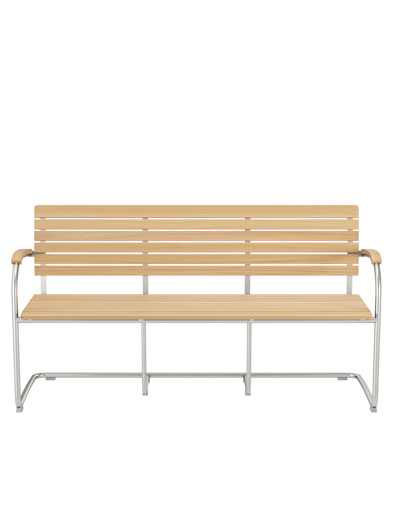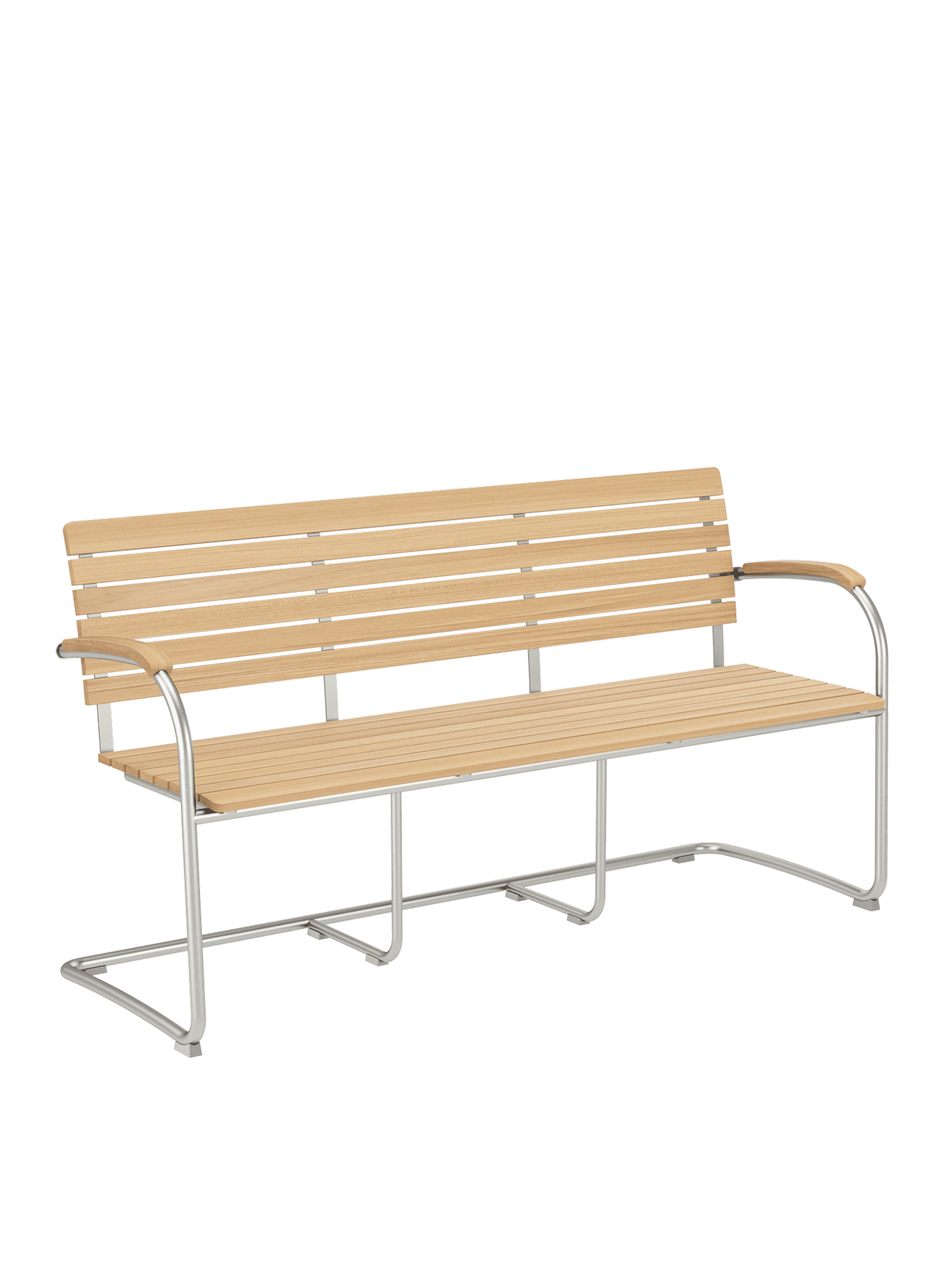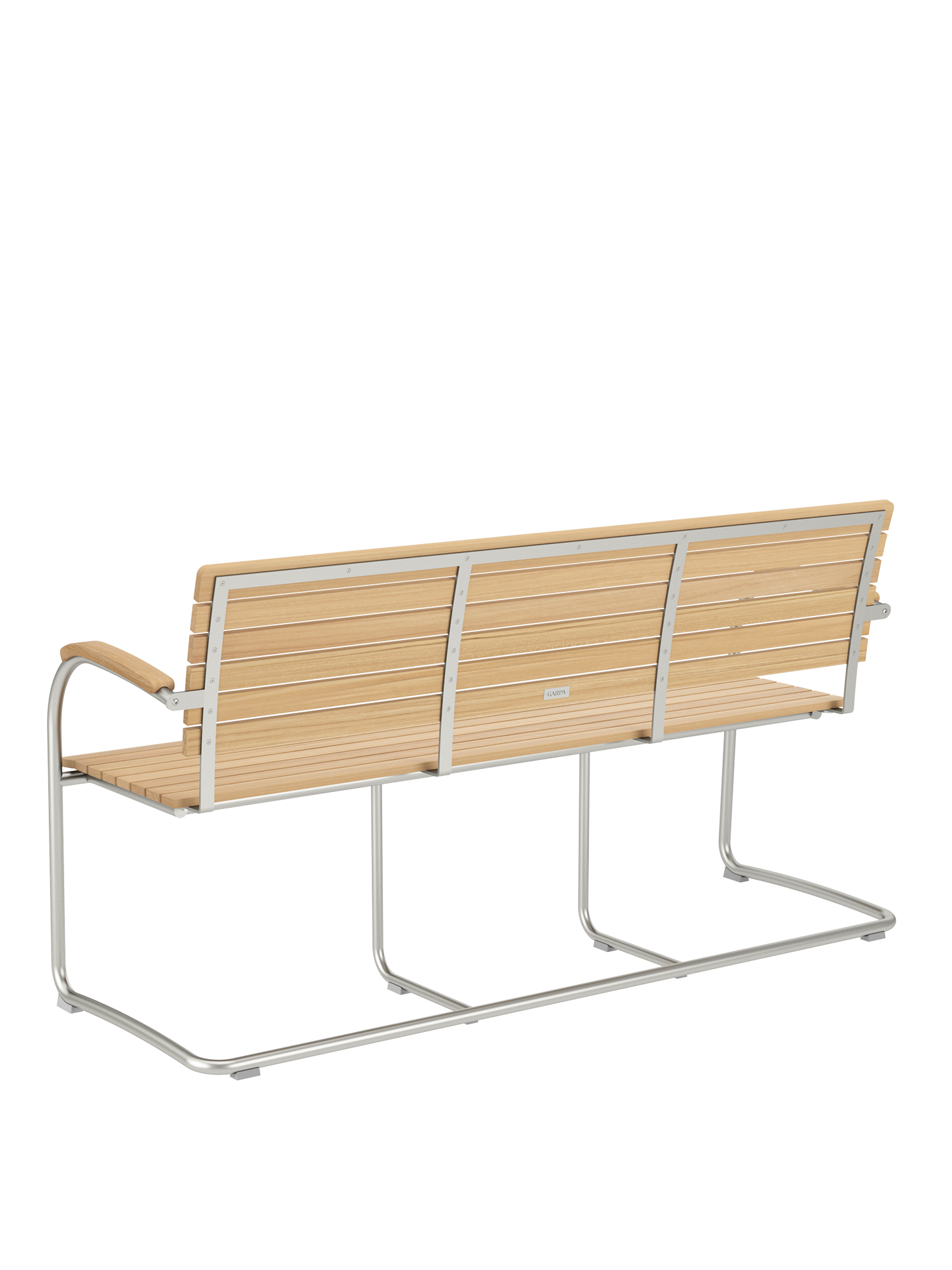 Für die Befestigung von Sitz- und Rückenflächen wurde statt eines Rundrohrs ein flacher Edelstahlrahmen gewählt. Er schmiegt sich den breiten Teakleisten an und hält sie selbst bei grossen Schwingungen dauerhaft fest. Unter dem Gestell befinden sich auswechselbare Gleiter aus Kunststoff, die empfindliche Böden schützen.