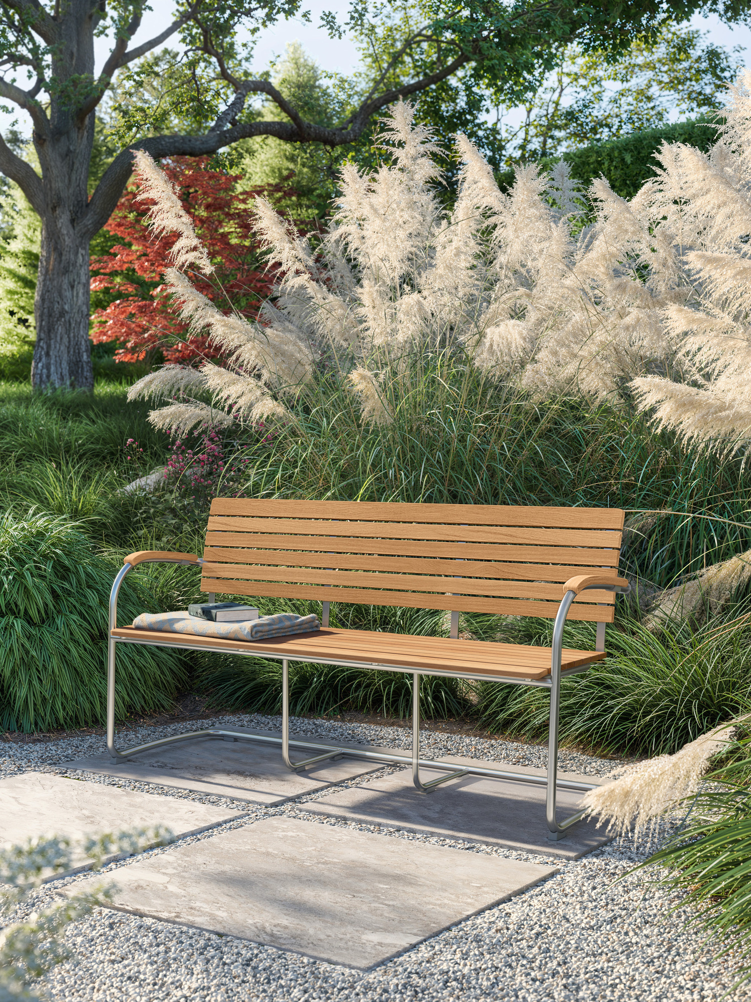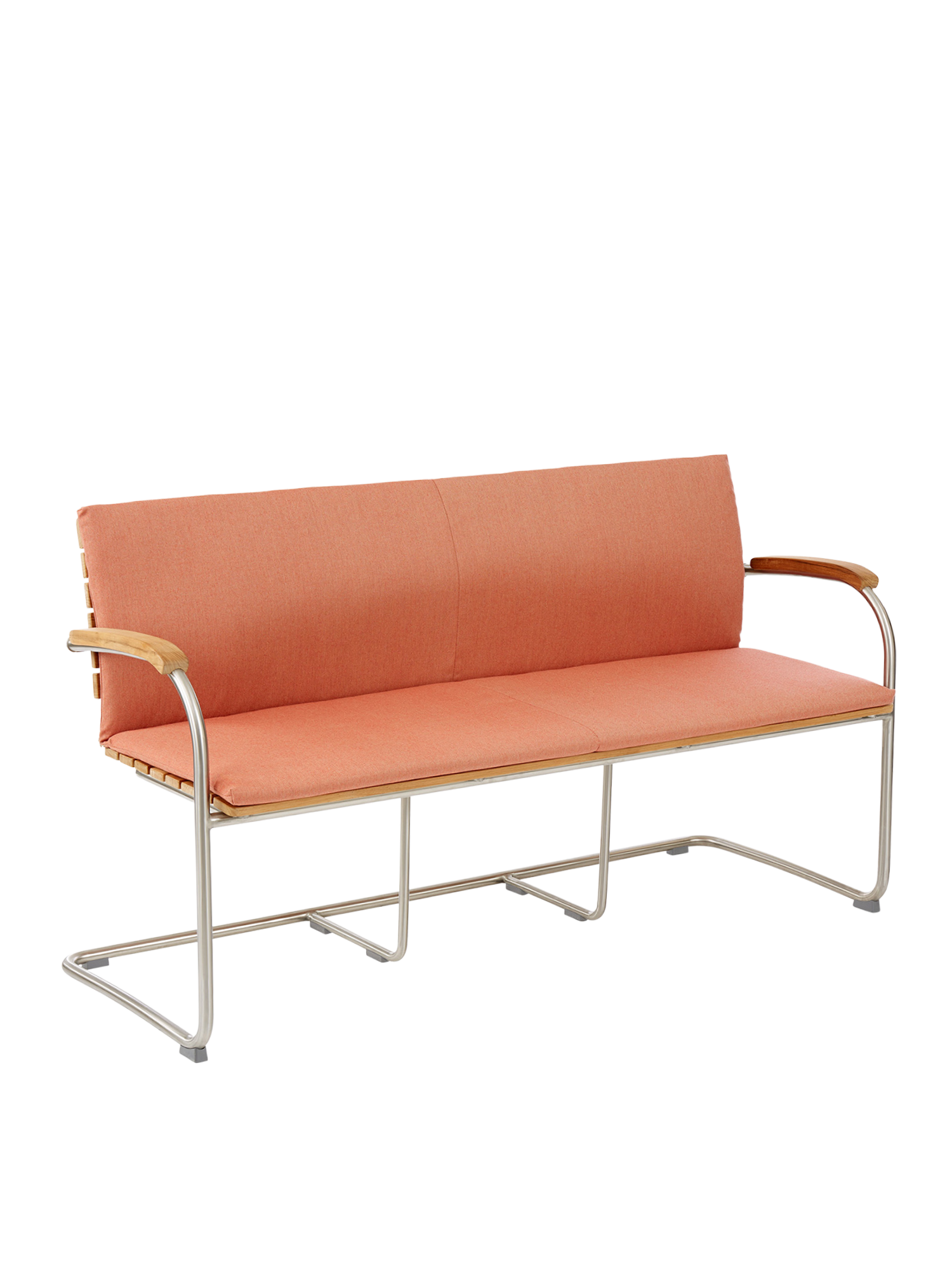 In den vom Bauhaus inspirierten Möbeln der Serie Bolero ergänzen sich edles Metall und warmes Teakholz in idealer Weise. Sitz- und Rückenflächen der Bank aus Teak sind ergonomisch geformt und sorgen für besonderen Komfort. Das Rohrgestell aus satiniertem Edelstahl trotzt allen Wetterlaunen, die gewölbten Armlehnen aus Teak passen sich seinem Profil an und schmeicheln den Händen. Auflagen in verschiedenen Farbtönen erhöhen noch die Bequemlichkeit der Möbel und setzen feine Akzente.