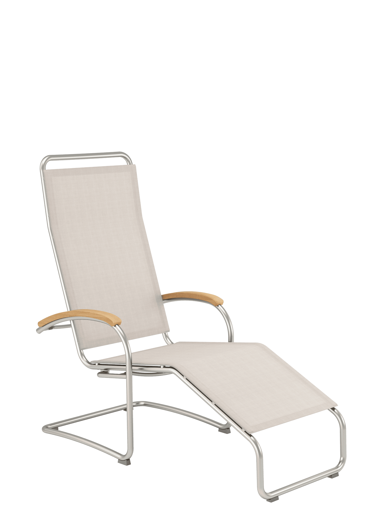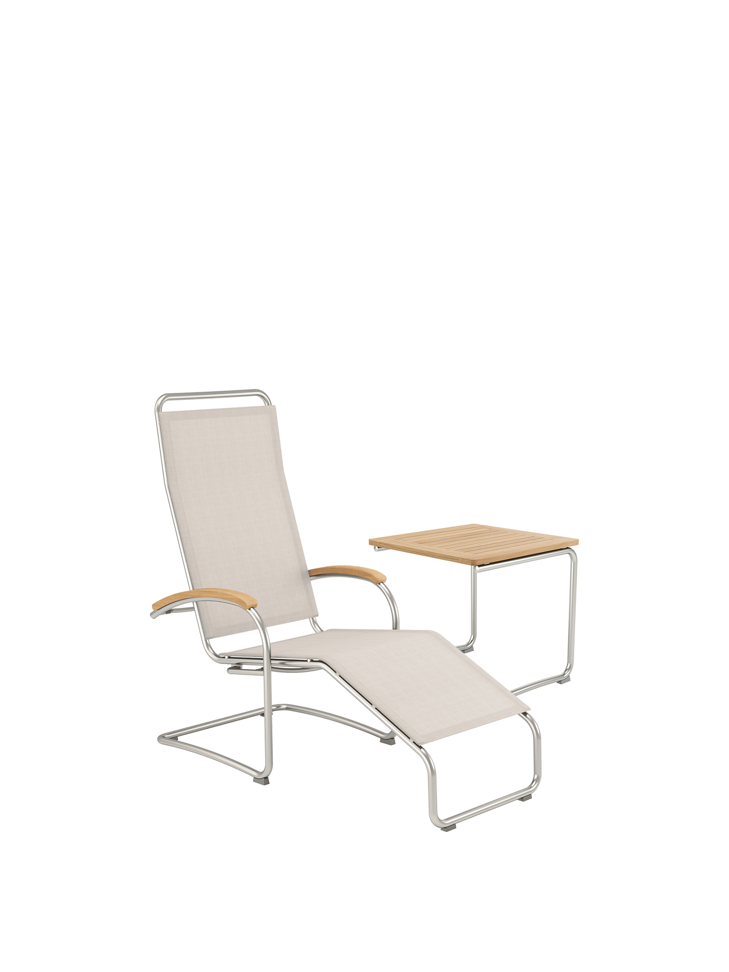 Ein Duo, das innere Balance verspricht: Der Beistelltisch hält Erfrischungen in Reichweite, der bequeme Liegesessel verwöhnt mit wohltuender Ergonomie. Durch einfache Gewichtsverlagerung gleitet man sanft von der Sitz- in die Liegeposition. Die Möbel kombinieren satinierten Edelstahl mit hochwertigem Polymergewebe (Liegesessel) bzw. mit Plantagenteak.