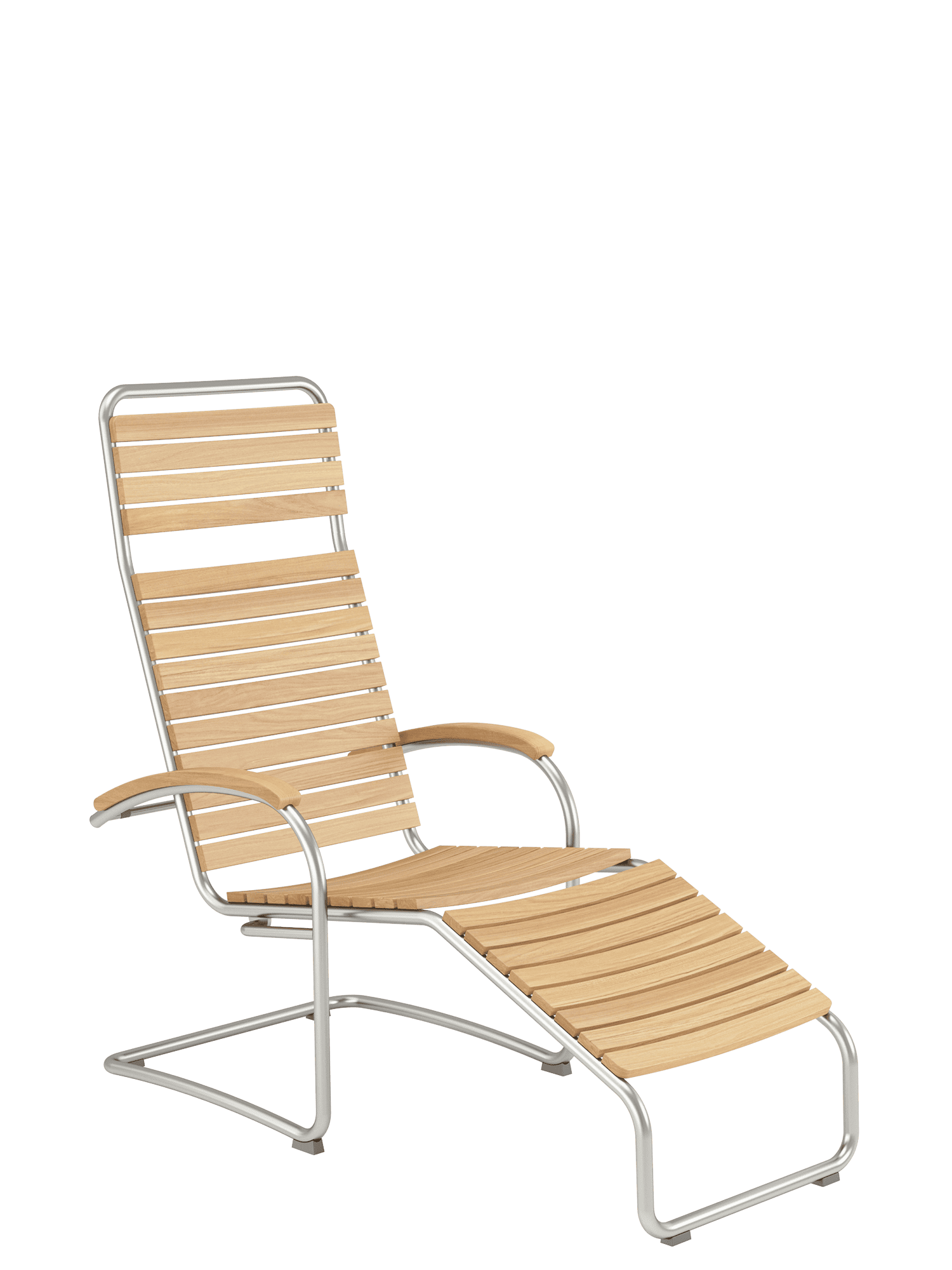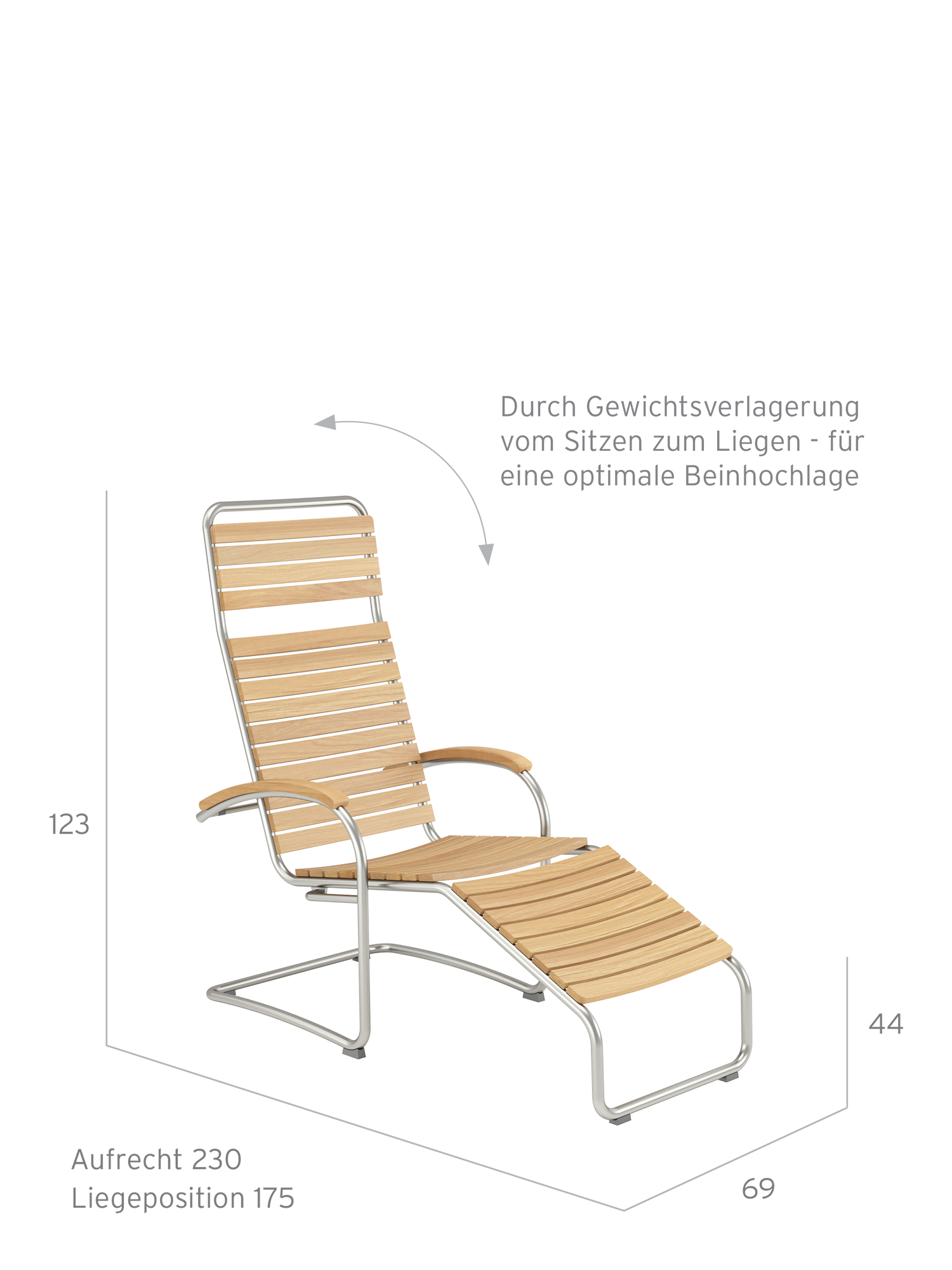Ein Duo, das innere Balance verspricht: Der Beistelltisch hält Erfrischungen in Reichweite, der bequeme Liegesessel verwöhnt mit wohltuender Ergonomie. Durch einfache Gewichtsverlagerung gleitet man sanft von der Sitz- in die Liegeposition. Die Möbel bestehen aus satiniertem Edelstahl und hochwertigem Plantagenteak.
