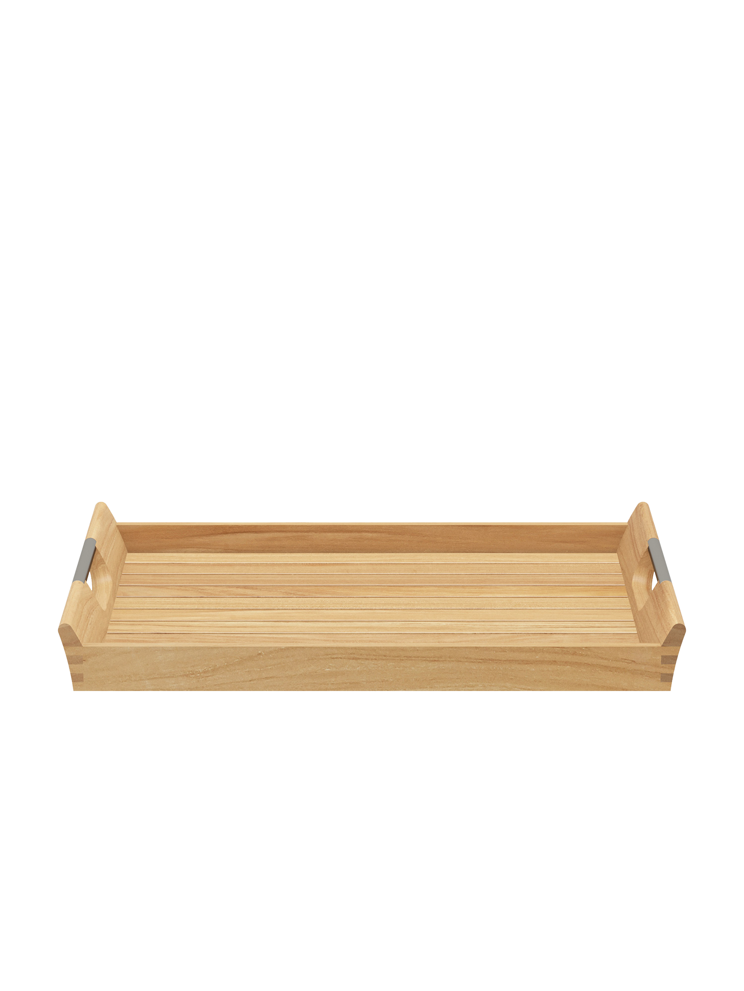 Auf dem klappbaren Gestell aus graphitfarben pulverbeschichtetem Edelstahl wartet das abnehmbare Tablett aus Teakholz auf seinen Einsatz.