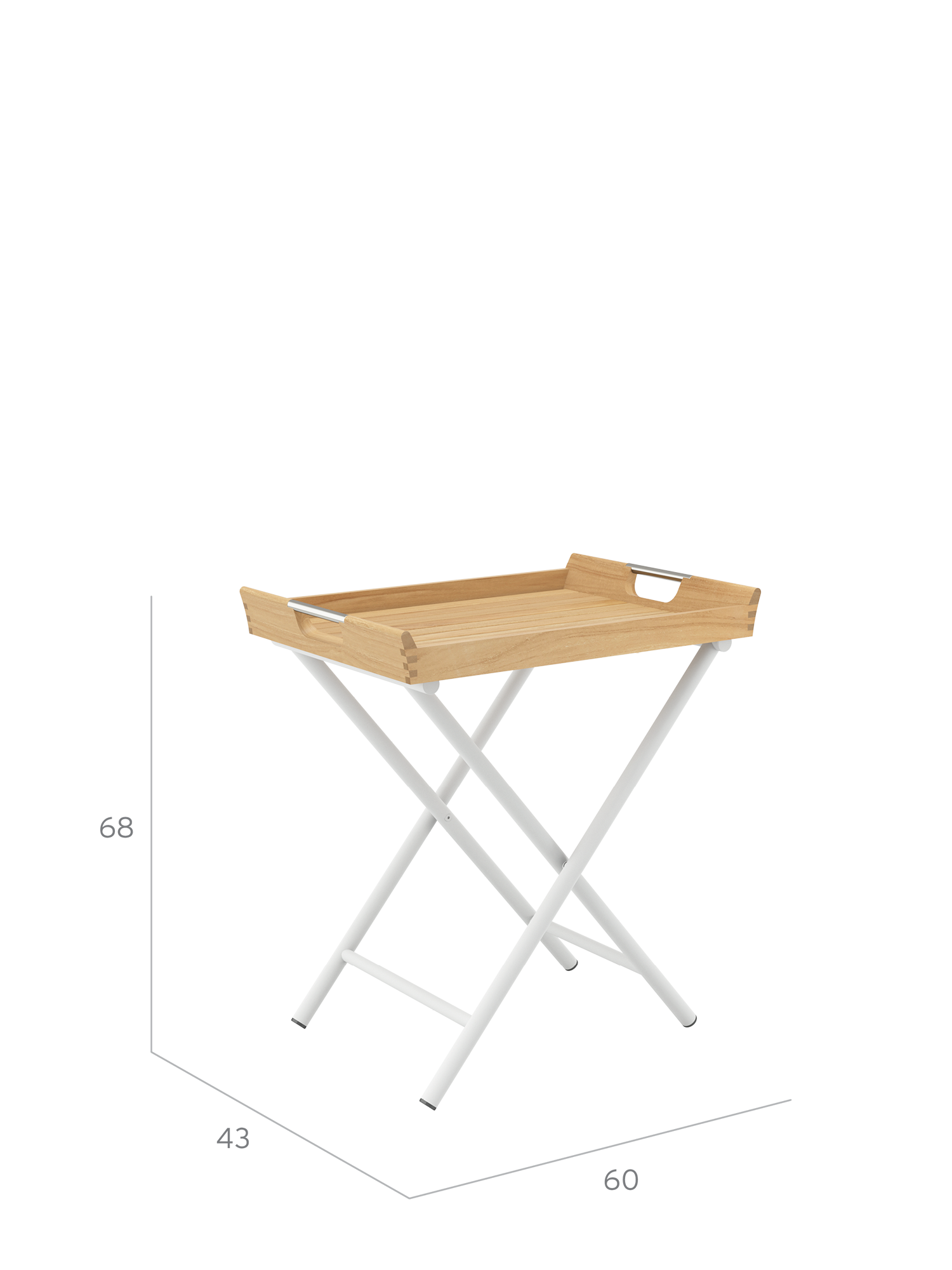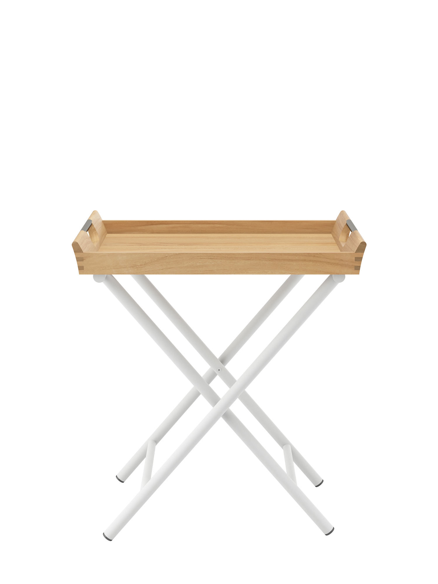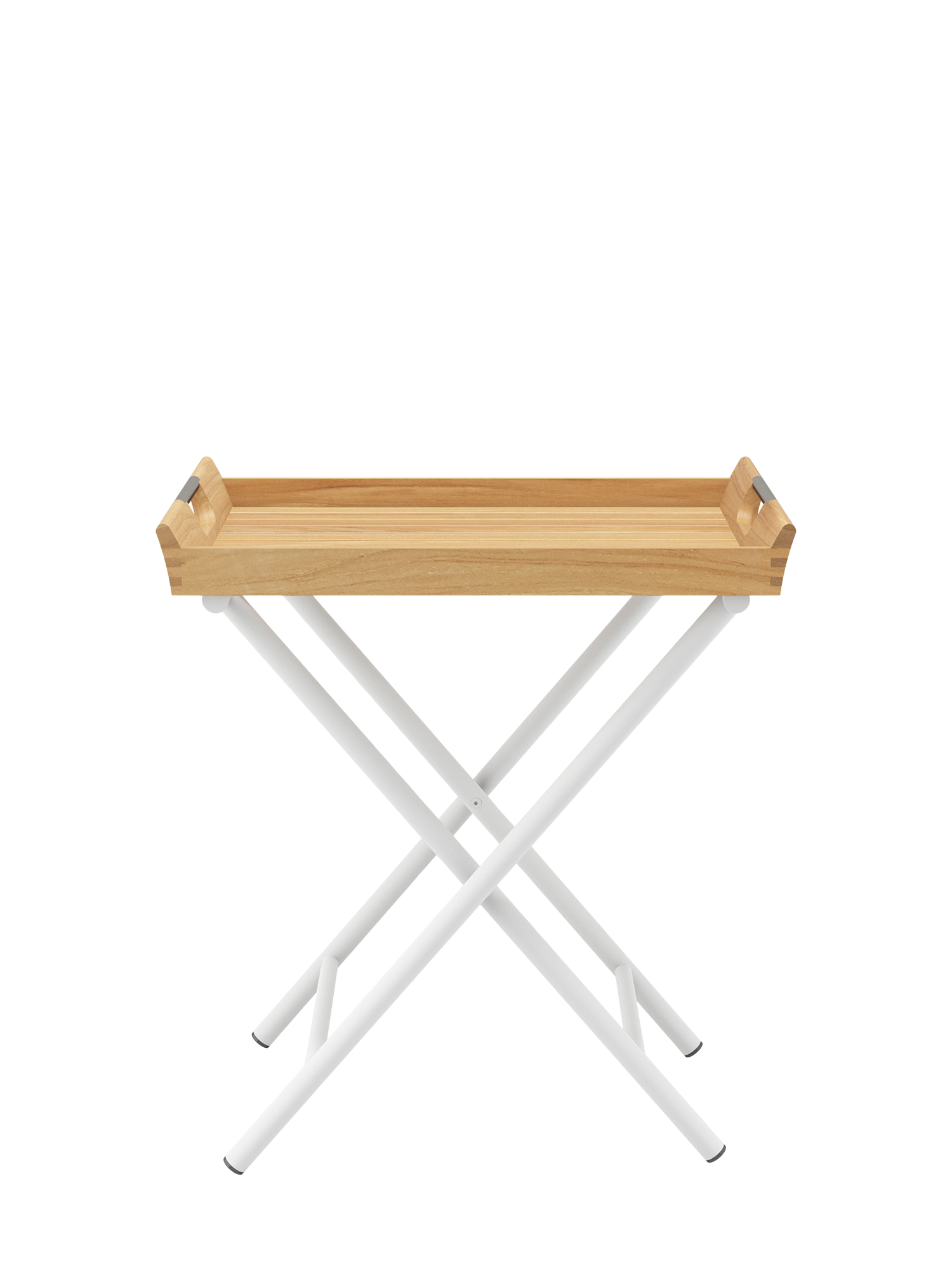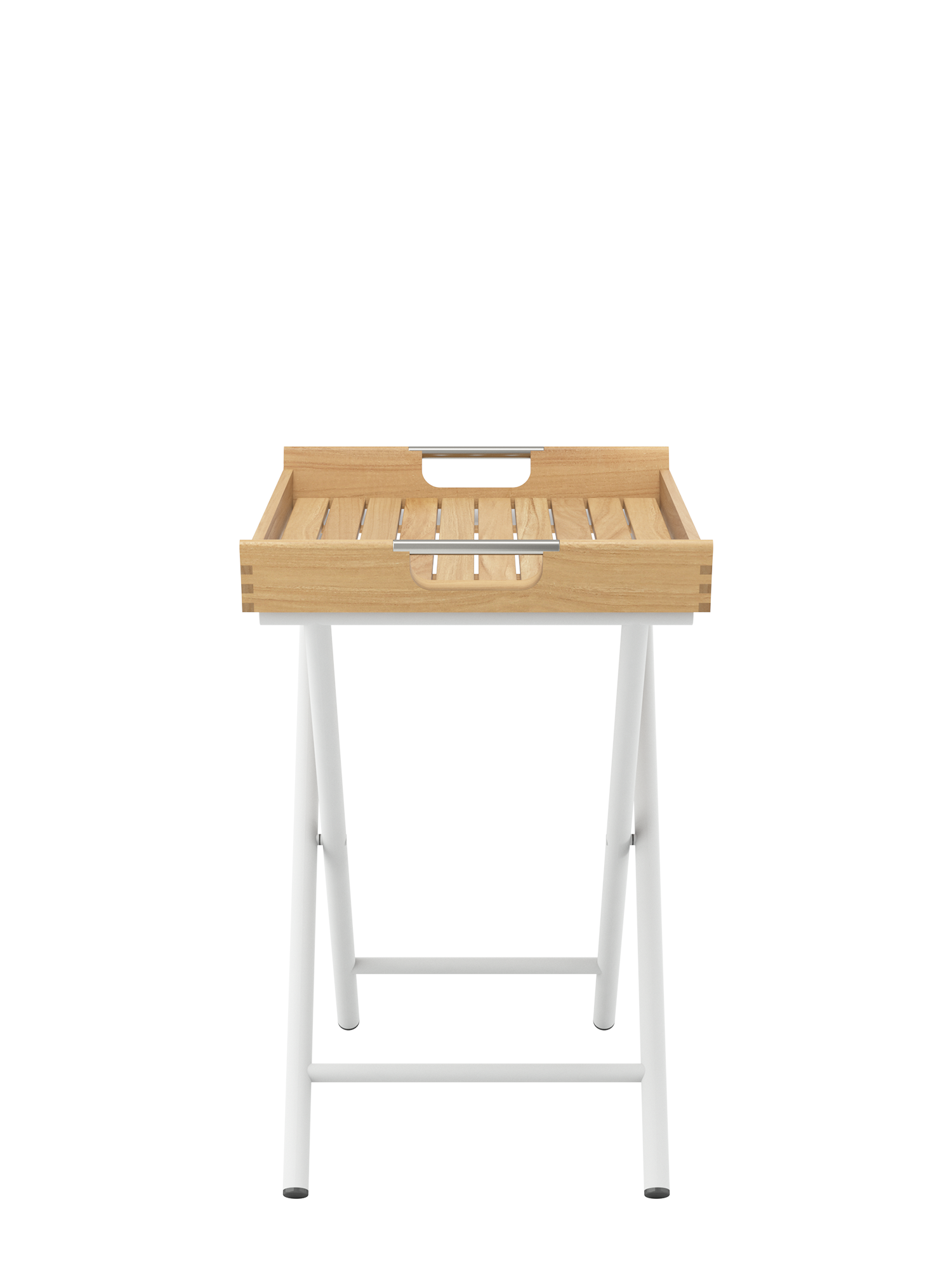 Auf dem klappbaren Gestell aus weiss pulverbeschichtetem Edelstahl wartet das abnehmbare Tablett aus Teakholz auf seinen Einsatz.