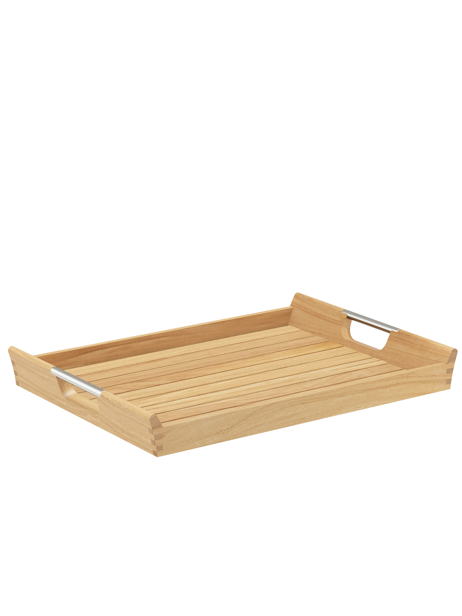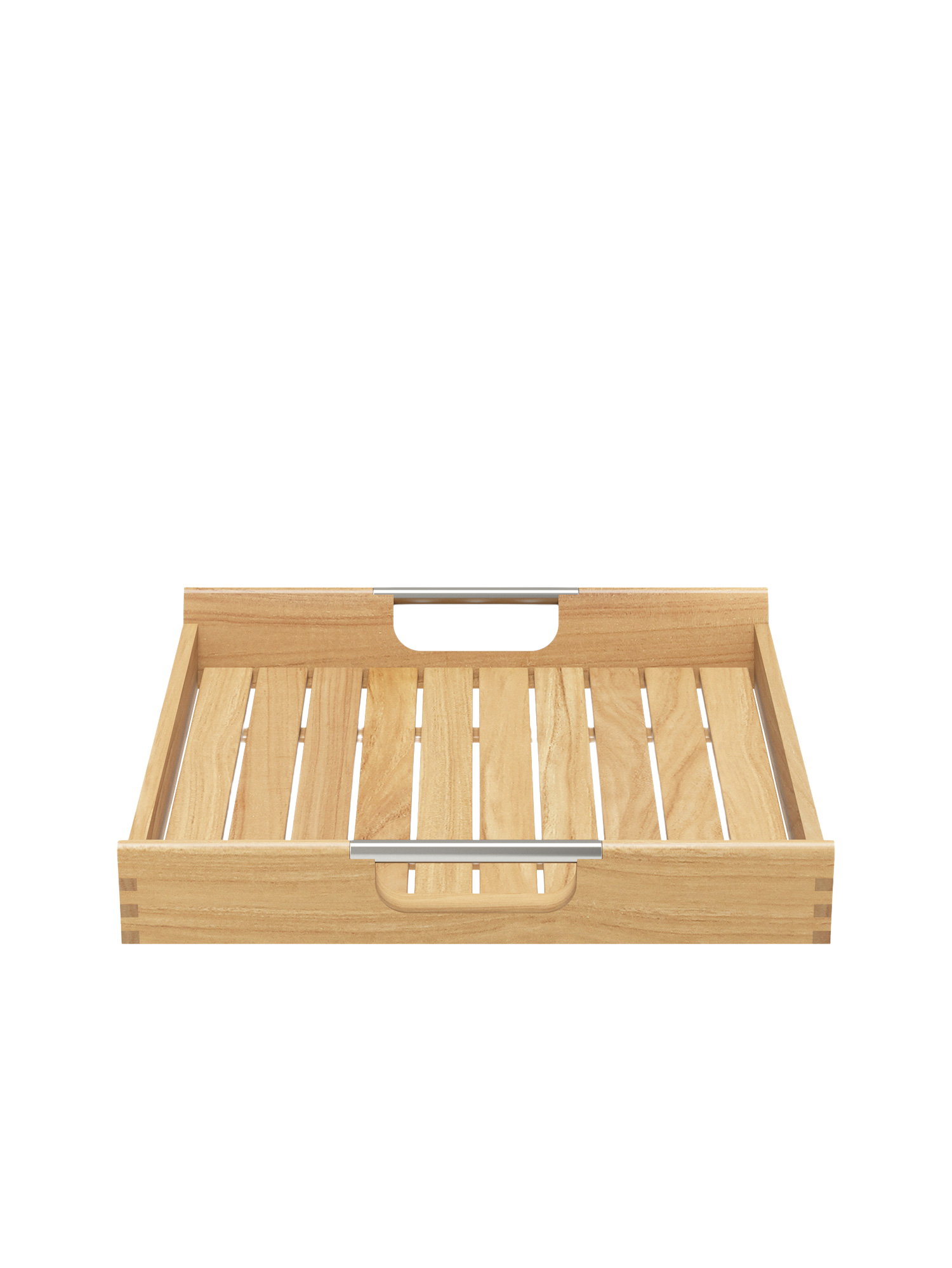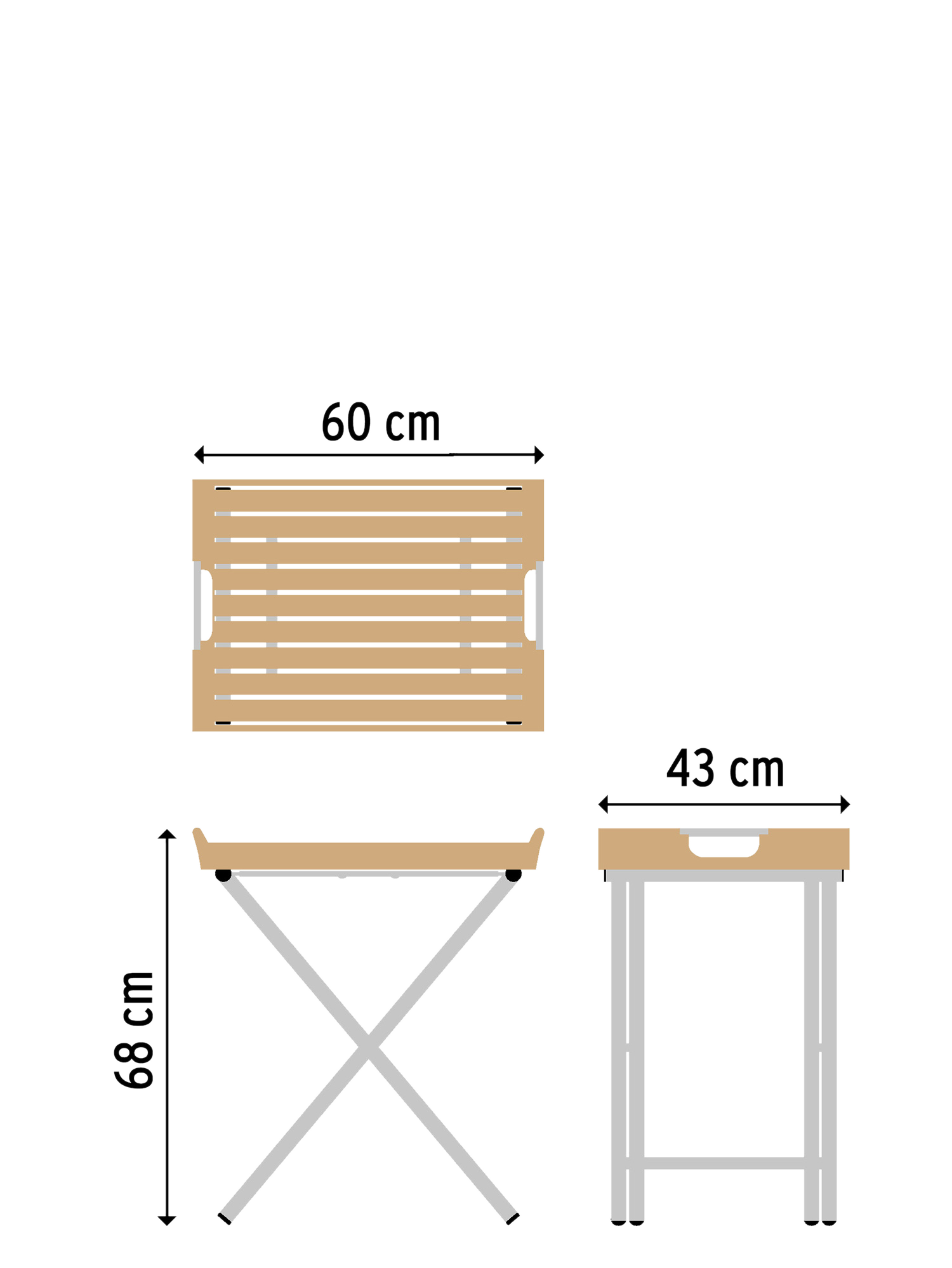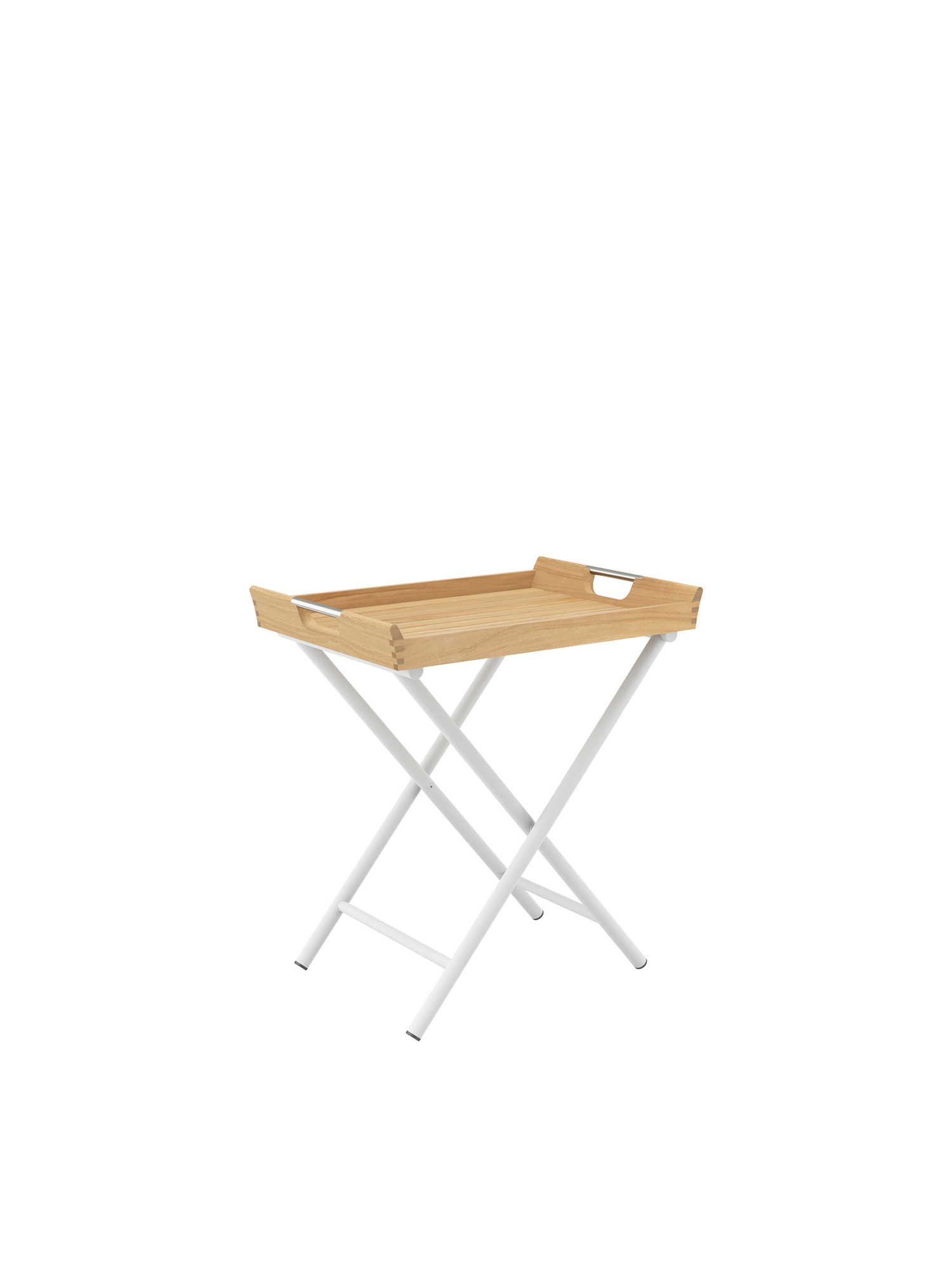 Auf dem klappbaren Gestell aus weiss pulverbeschichtetem Edelstahl wartet das abnehmbare Tablett aus Teakholz auf seinen Einsatz.