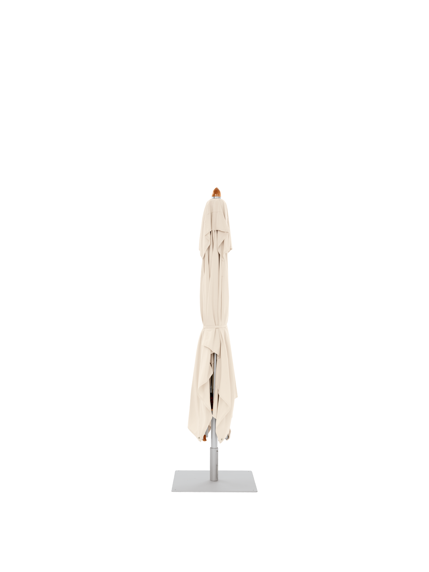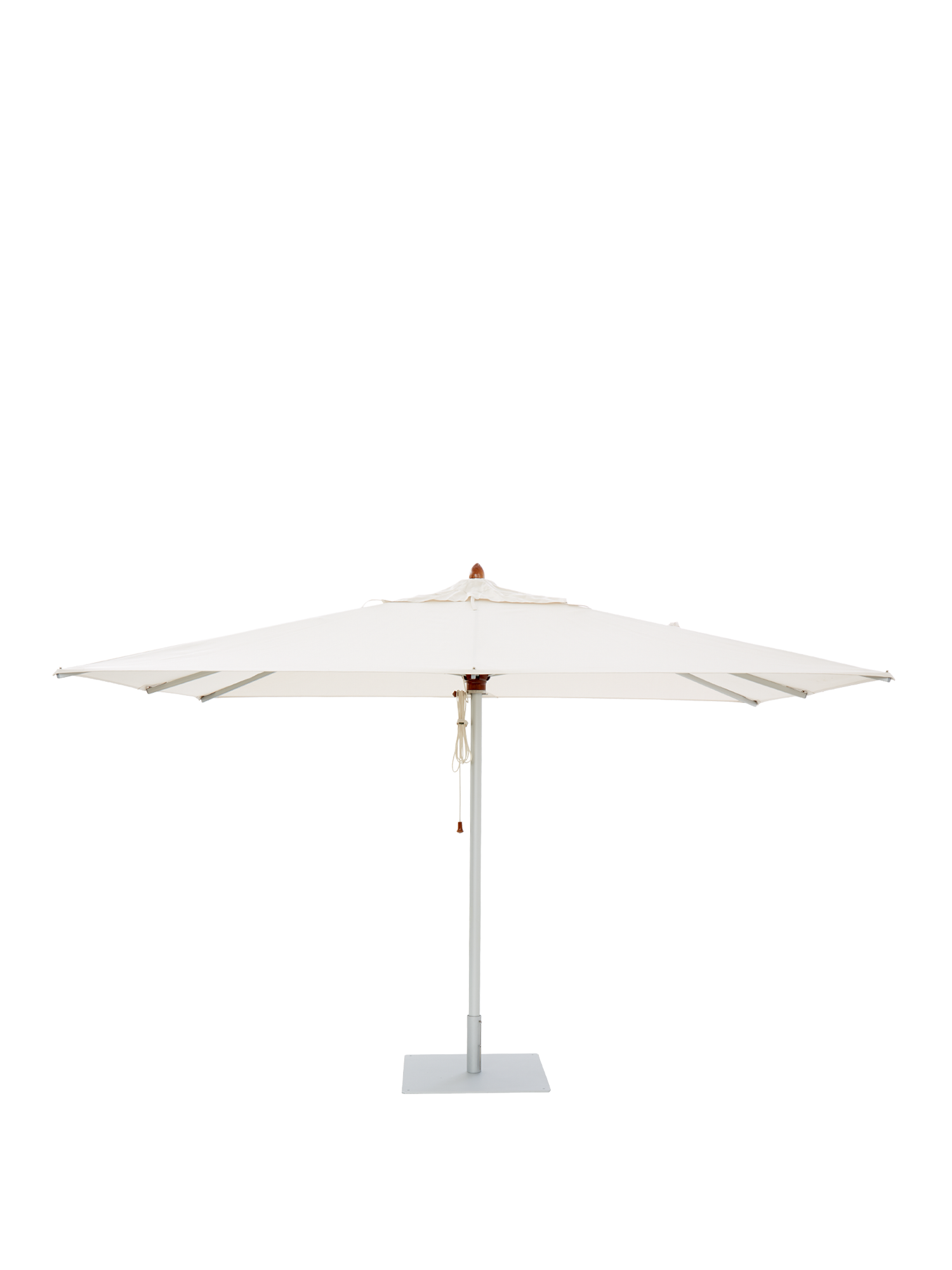 Mast, Gabel und Streben der Calabria Schirme bestehen aus eloxiertem, silberweissem Aluminium; Mastspitze, Krone und Schieber aus lackiertem Hartholz, das schlicht und fein gedrechselt ist.