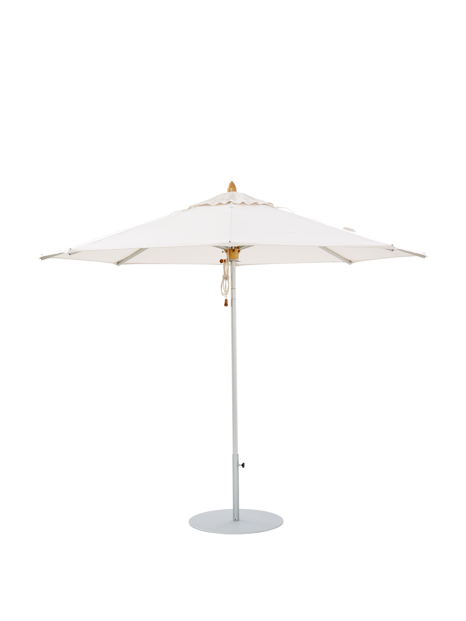 Der runde Schirm hat einen Durchmesser von 2,80 m und eignet sich besonders für kleine Sitzgruppen.