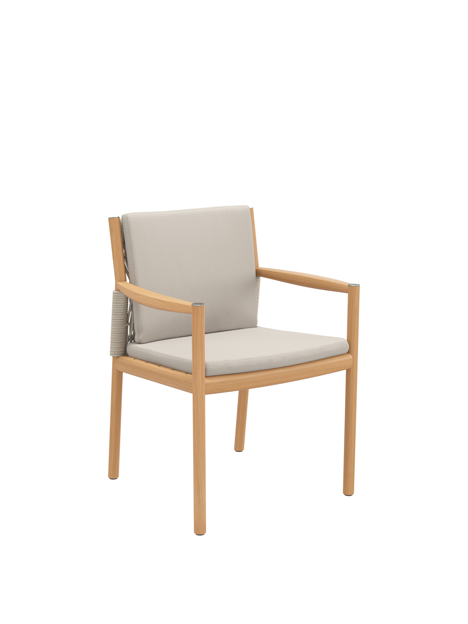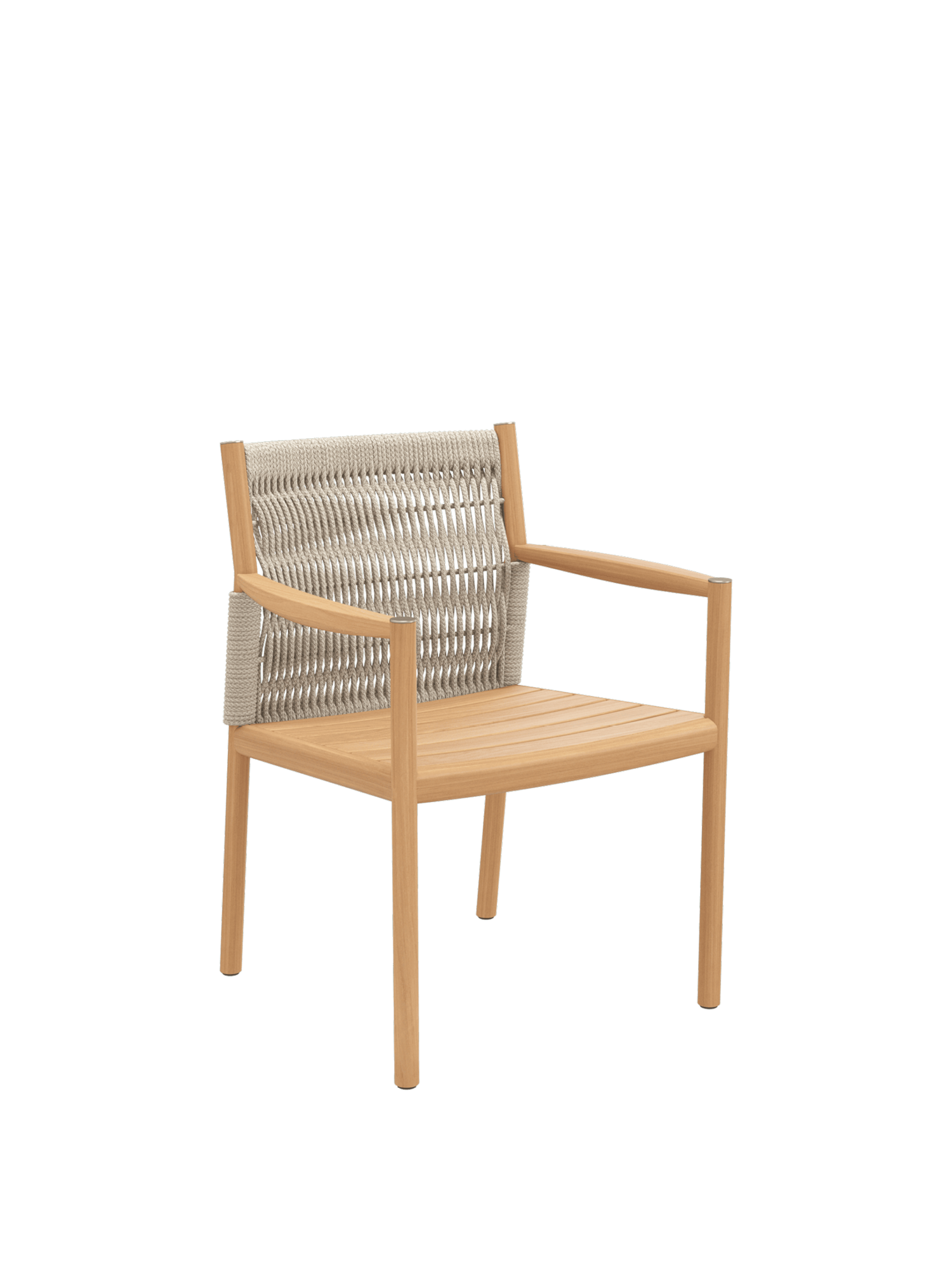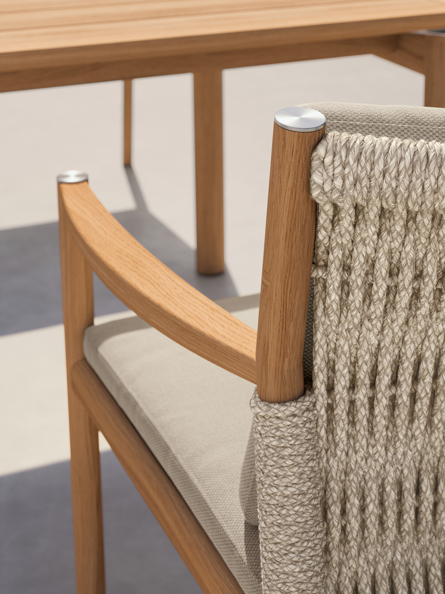 Im unverwechselbaren Design der behaglichen Cavo Kollektion laden die komfortablen Armlehnstühle zu Tisch. Gedrechseltes Plantagenteak bildet die elegante Basis für eine ergonomisch geformte Sitzfläche und sanft gerundete Armlehnen. Die hohe Rückenlehne der Dining Stühle aus anschmiegsamem Kordelgeflecht im Farbton Beige bietet Geborgenheit an langer Tafel oder in kleiner Runde. Feine Edelstahldetails setzen einen vertrauten Akzent. Optional erhältliche Auflagen in verschiedenen Dessins sorgen zusätzlich für Entspannung.