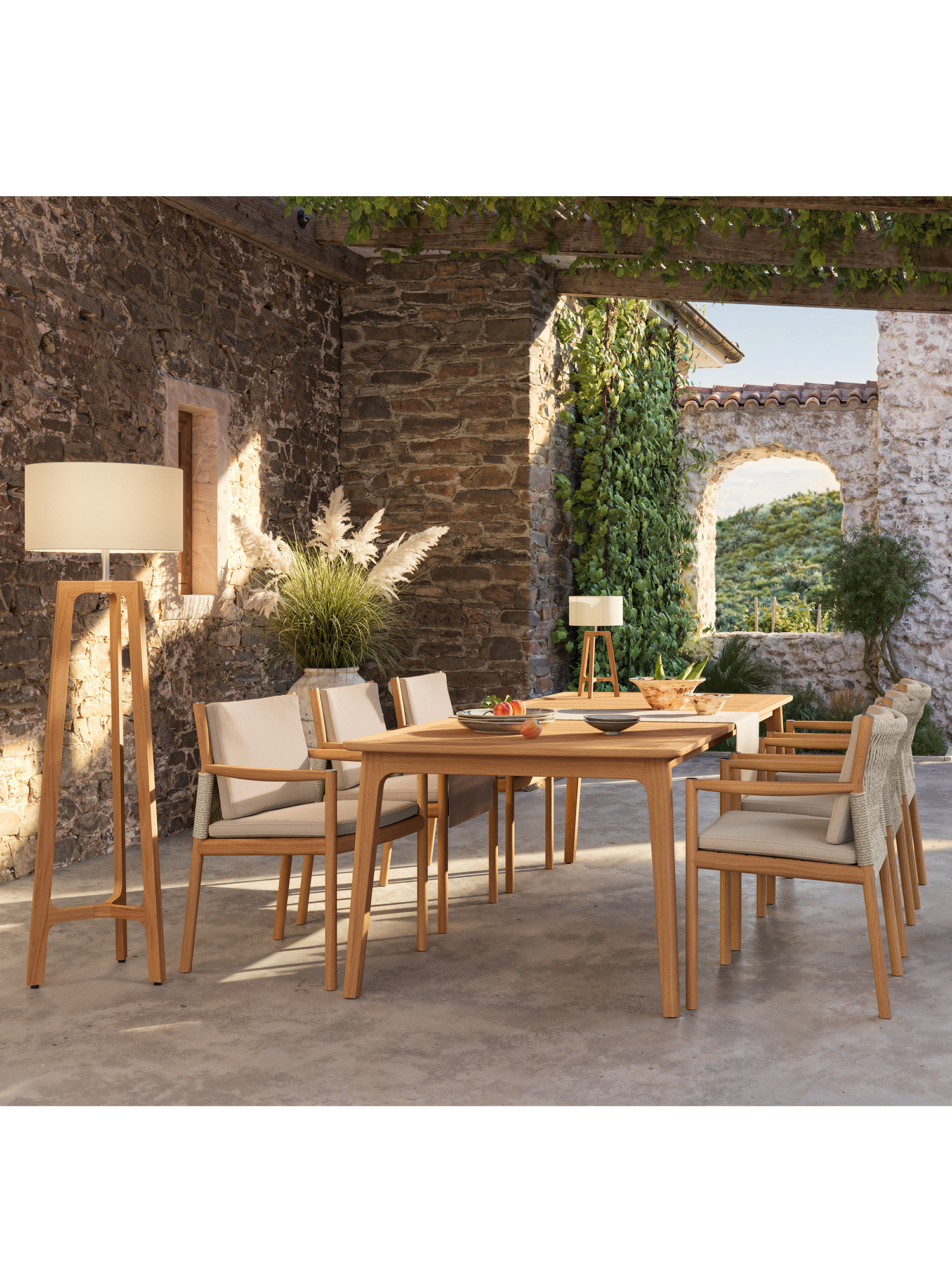 In der Kombination der Cavo Armlehnstühle mit den zeitlosen Preston Tischen der Garpa Kollektion setzt sich das Spiel mit spannenden Kontrasten fort. Die graue Keramikplatte der Tische hat eine fein marmorierte Maserung und wird in einen Rahmen aus Teakholz eingelegt. Nach dem Essen lassen sich die Cavo Armlehnstühle einfach unter die Tischplatte schieben. Die Tische sind in zwei Grössen erhältlich und bieten im grösseren Format bis zu 8 Personen Platz.