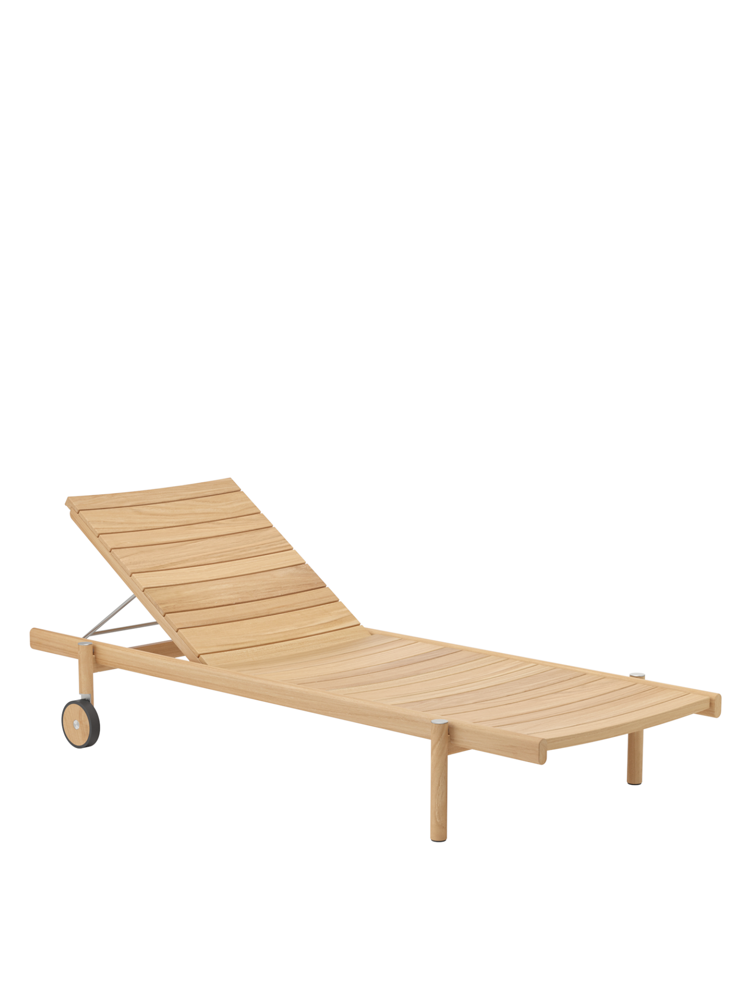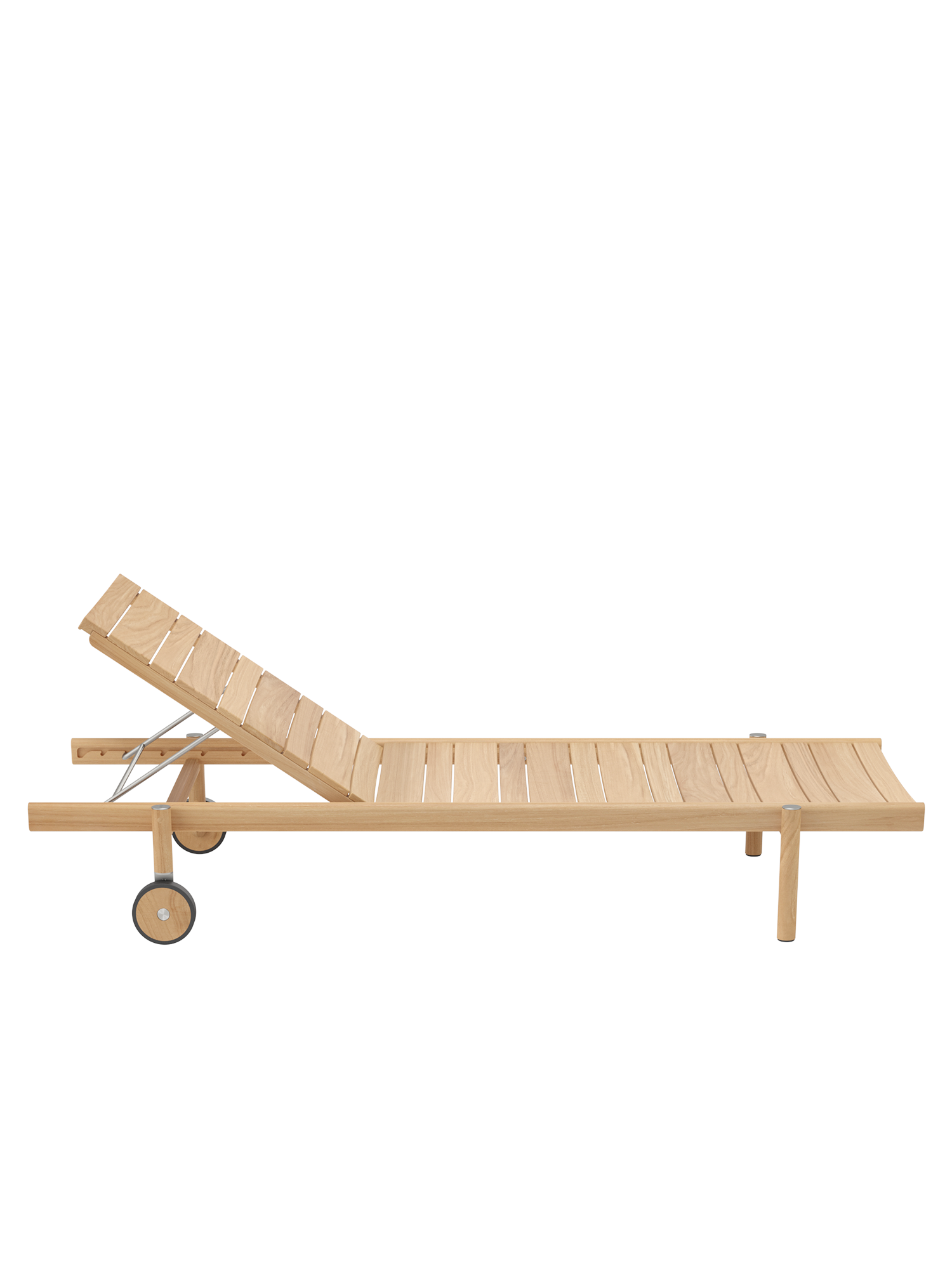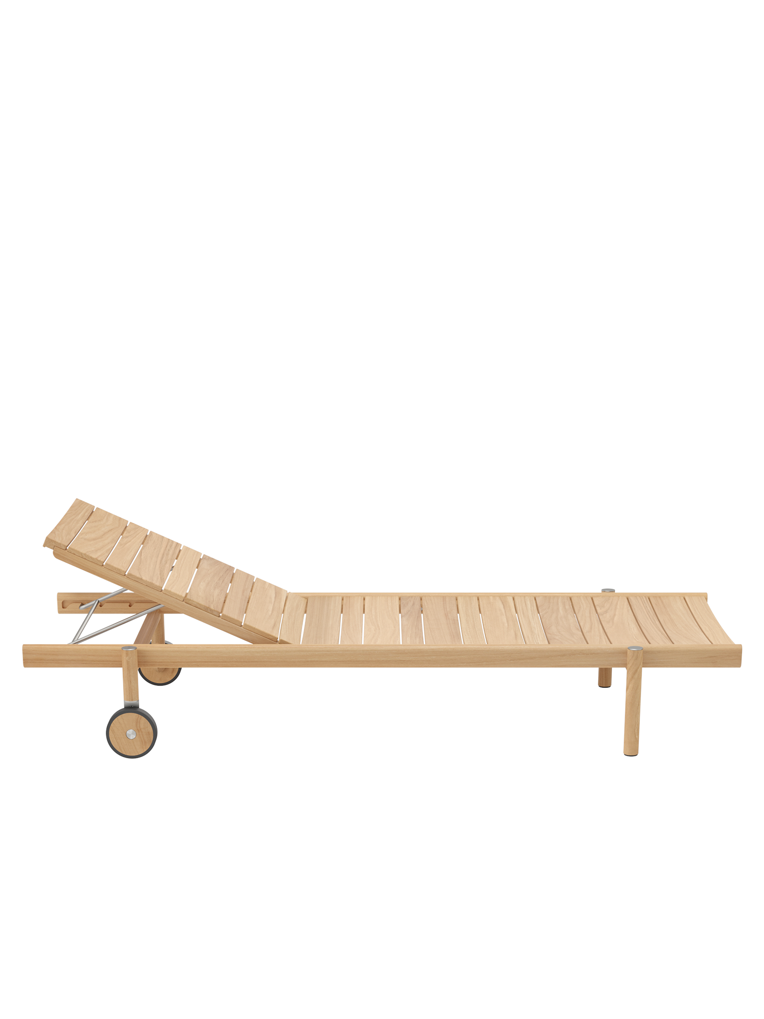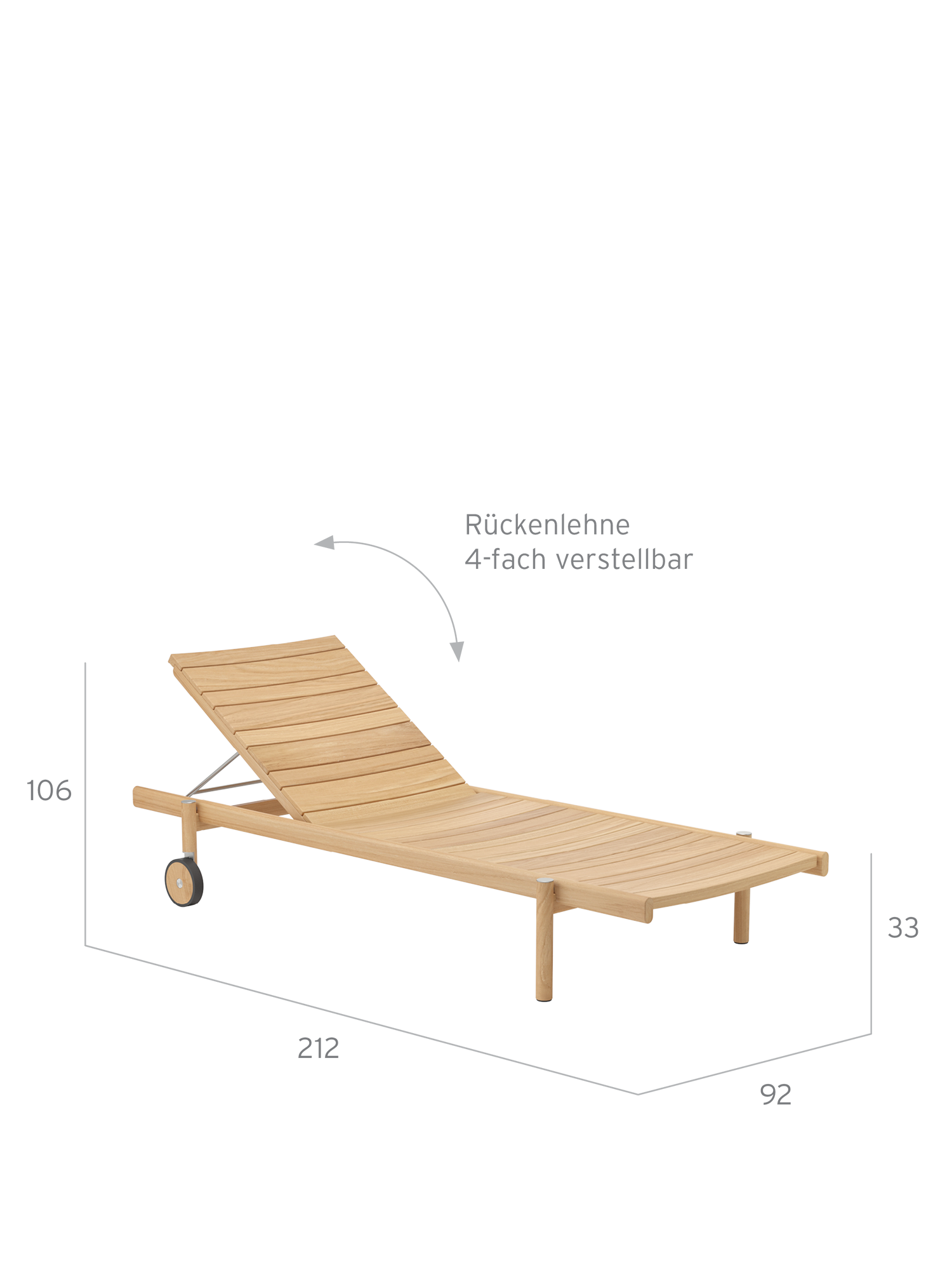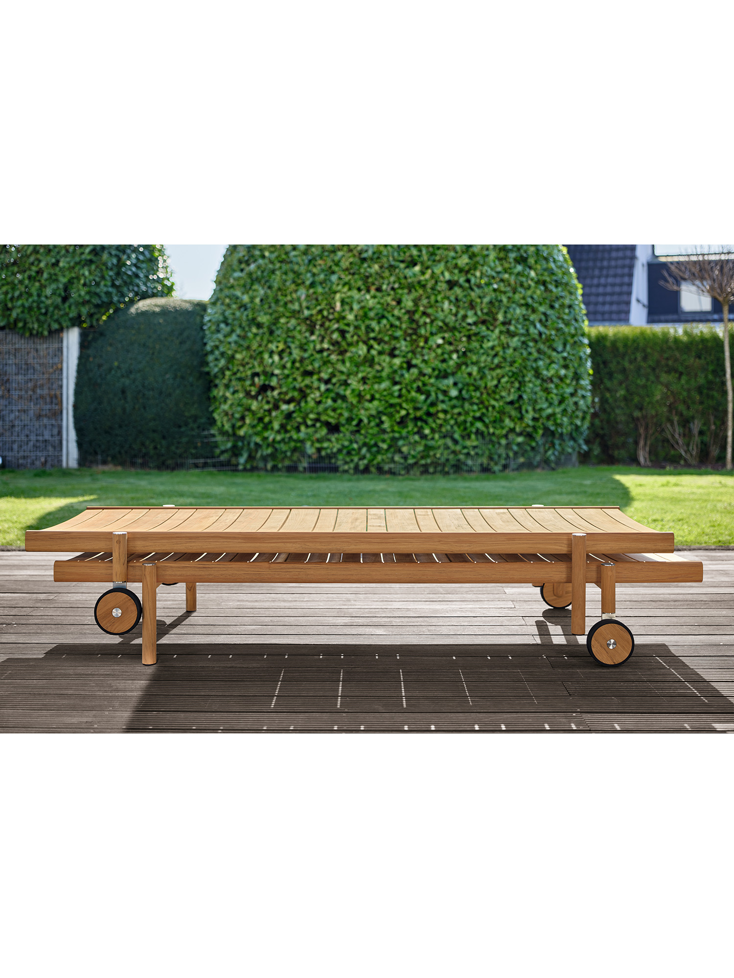 Die unterschiedlich breiten Teakleisten formen das gleichmässige Bild einer ausgesprochen grosszügigen Liegefläche. Plantagenteak in gewohnt hoher Garpa Qualität offeriert eine besonders angenehme Haptik. Das Rückenteil lässt sich vierfach verstellen.