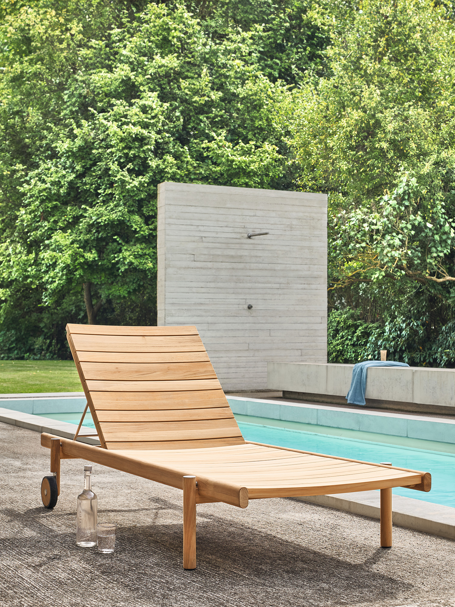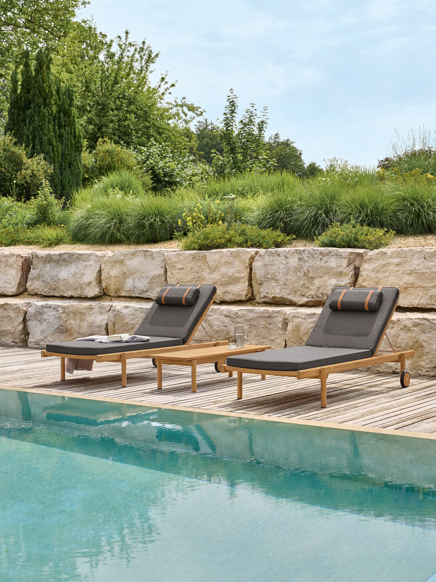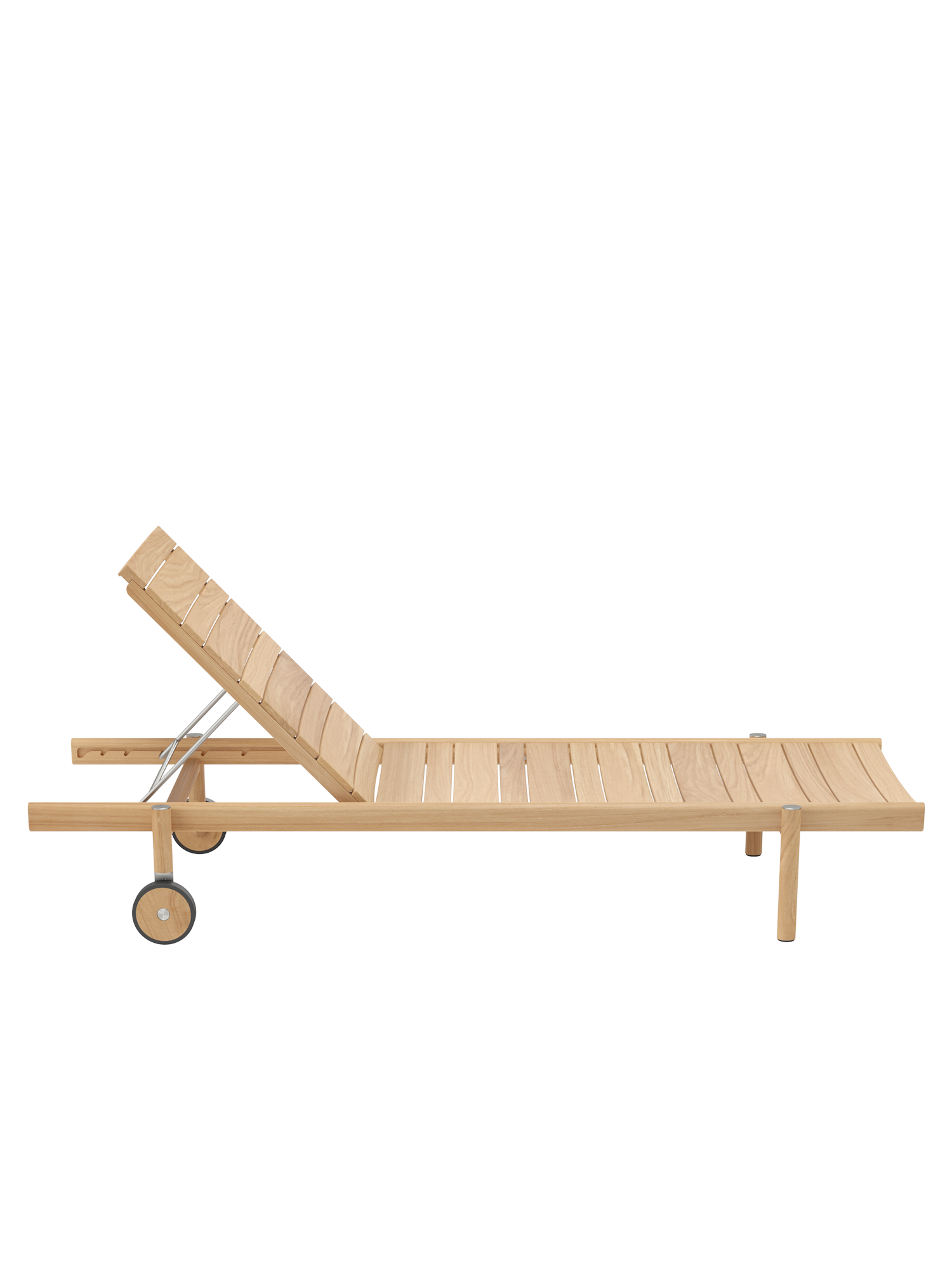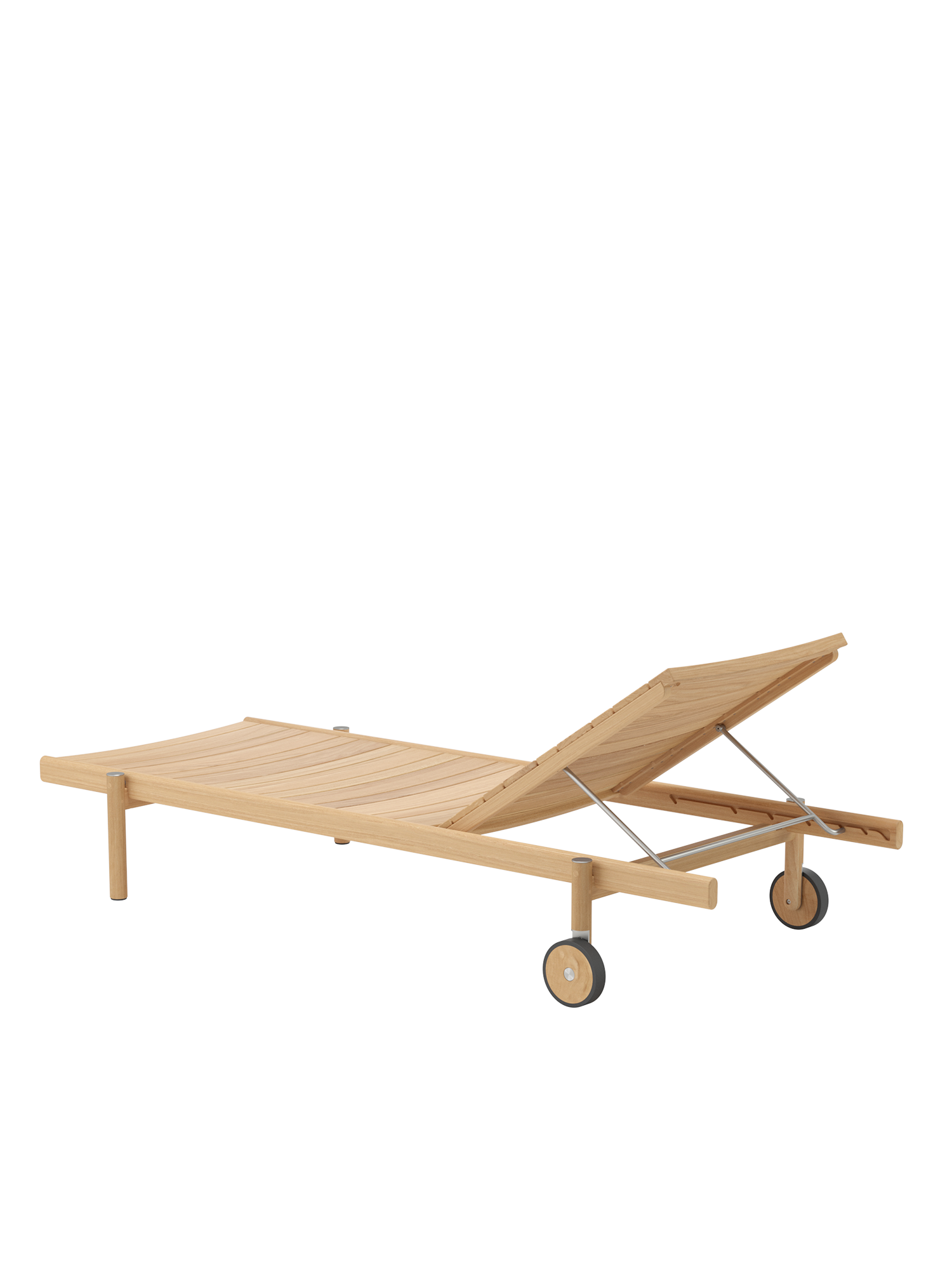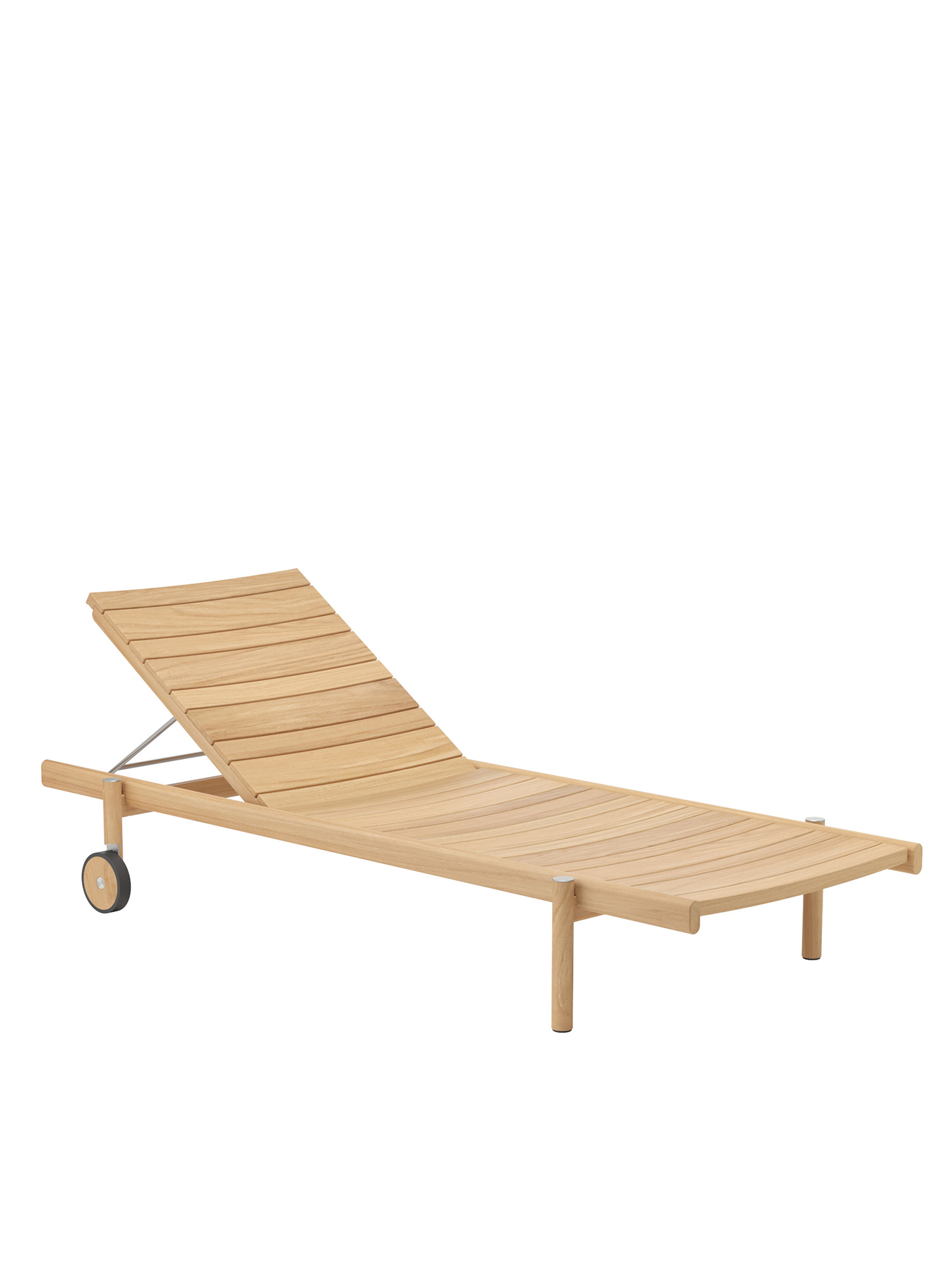 Die unterschiedlich breiten Teakleisten formen das gleichmässige Bild einer ausgesprochen grosszügigen Liegefläche. Plantagenteak in gewohnt hoher Garpa Qualität offeriert eine besonders angenehme Haptik. Das Rückenteil lässt sich vierfach verstellen.