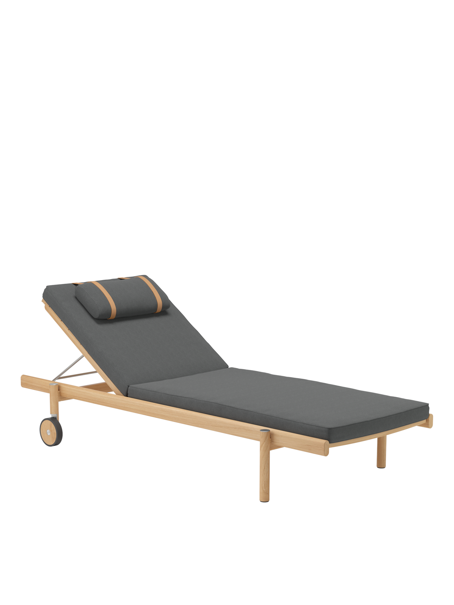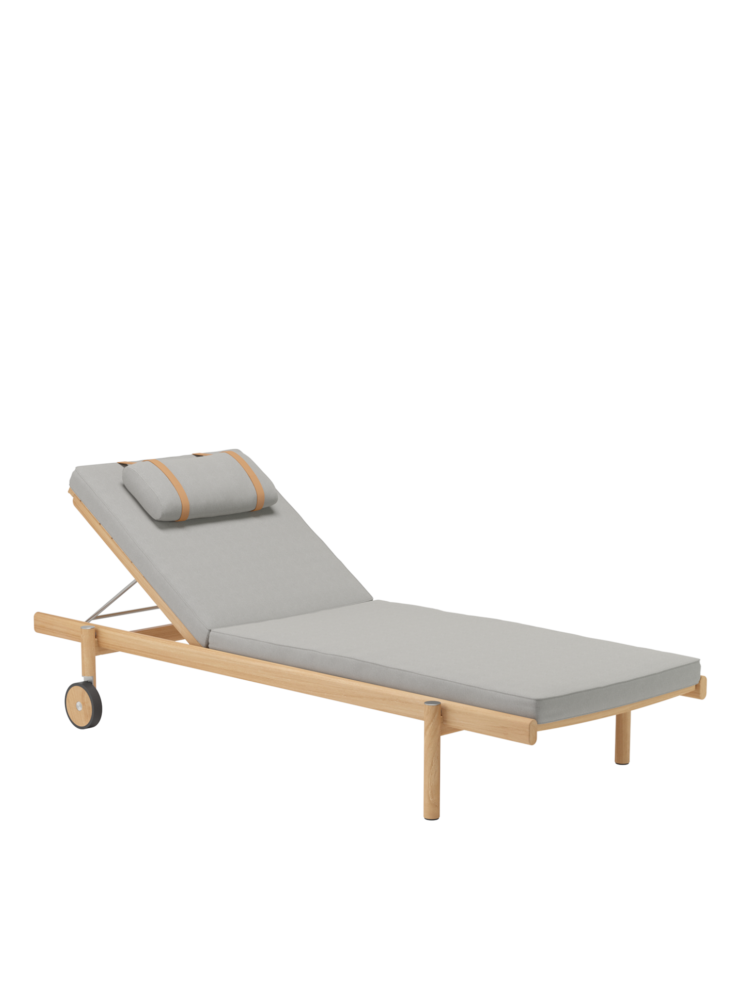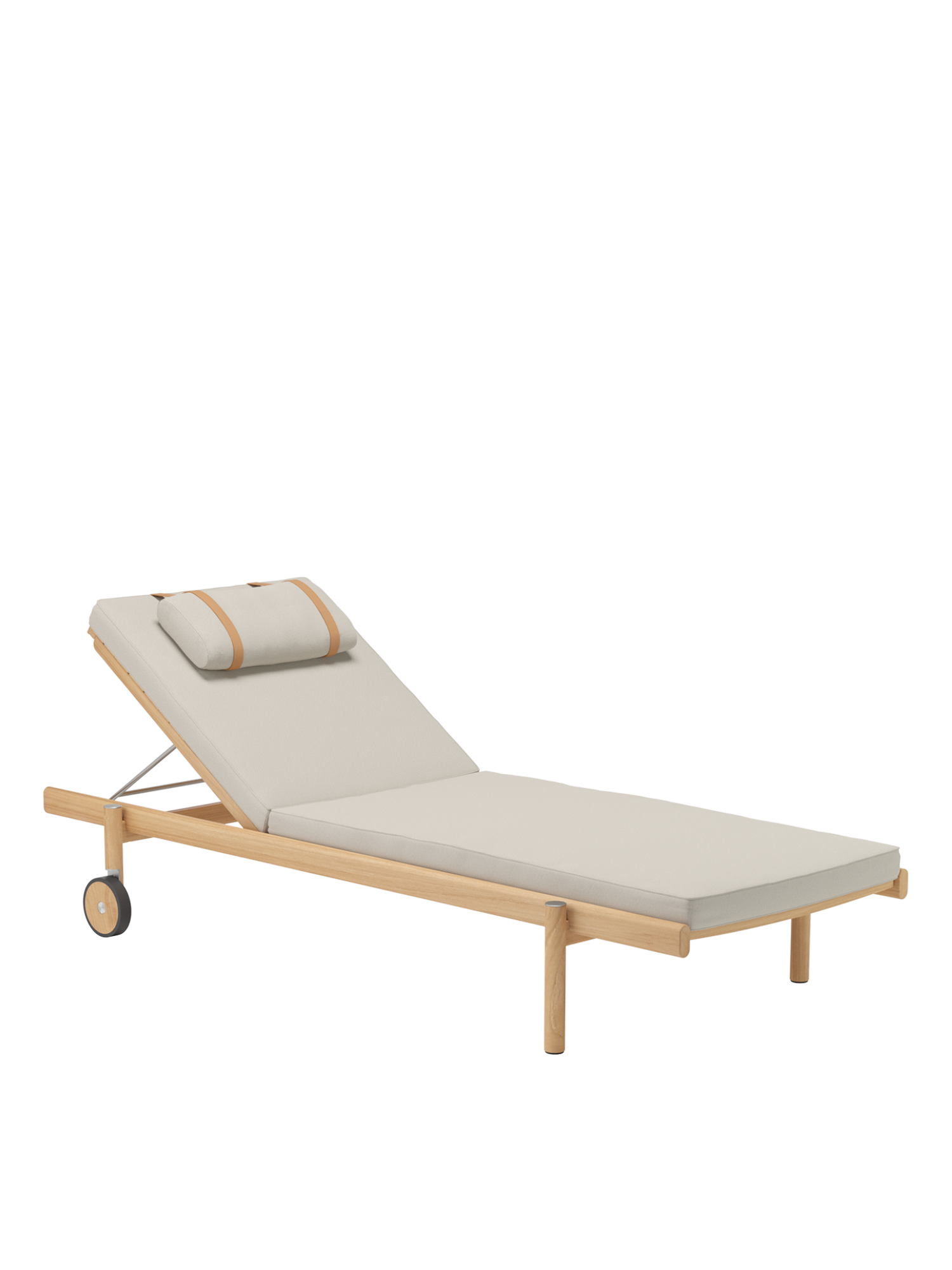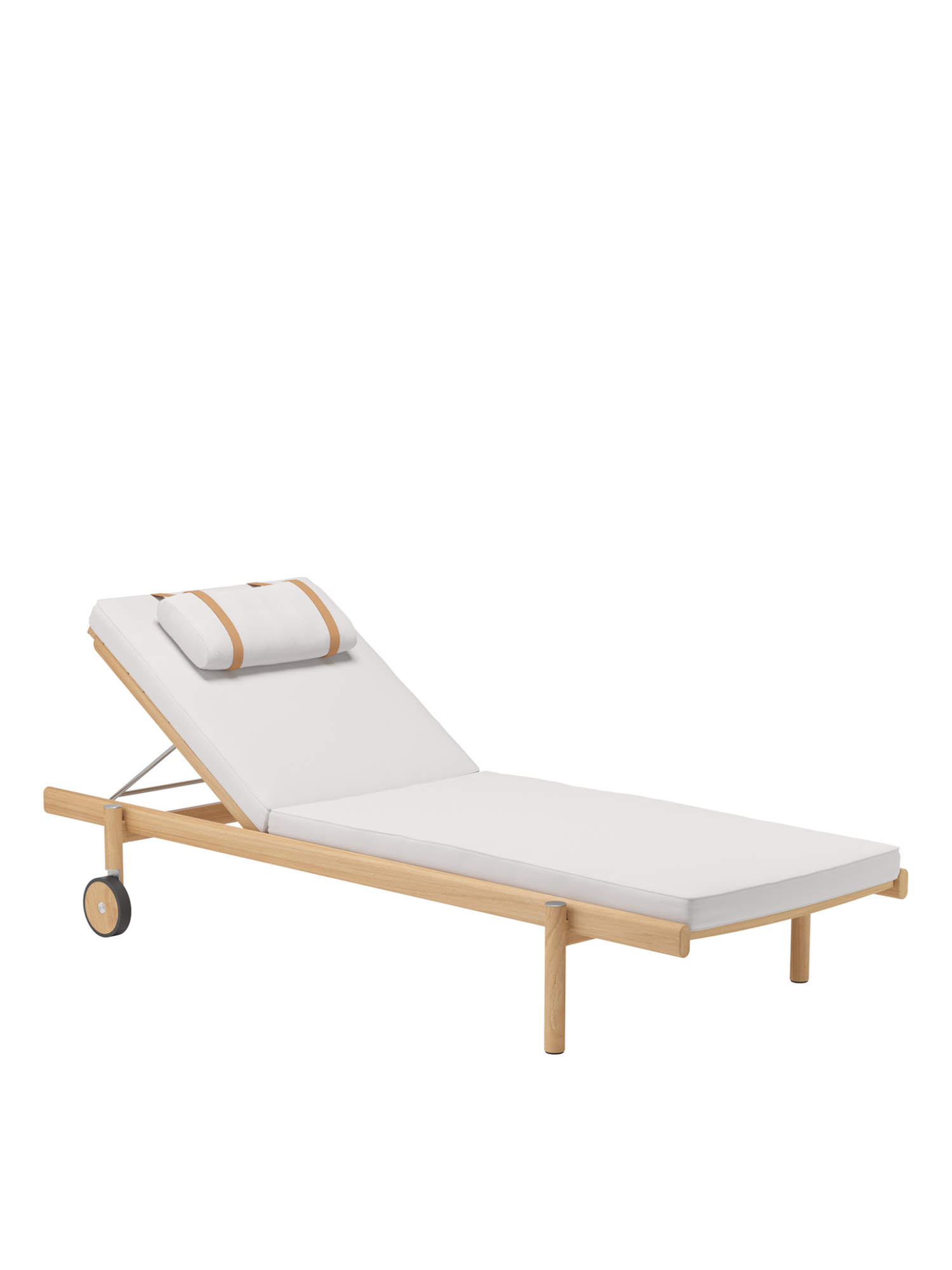 Handwerkliche Präzision und durchdachtes Design finden sich überall an der Cavo Liege: Die Rasterung für das Rückenteil ist exakt in das Teakholz gefräst, Lederschlaufen halten das Kopfkissen für den Ruhenden an Ort und Stelle. An Achsabdeckungen und Verkleidung der Radläufe finden sich Elemente aus gebürstetem Edelstahl.