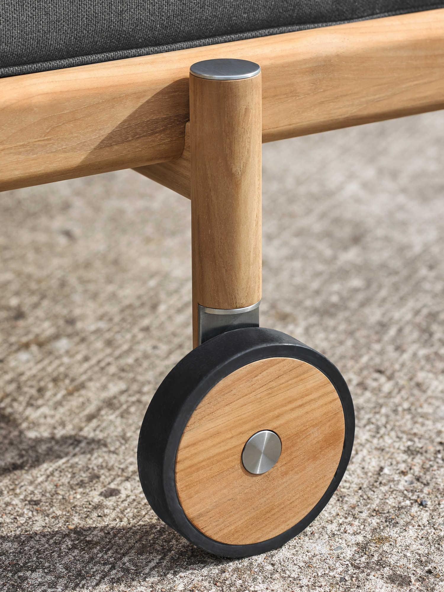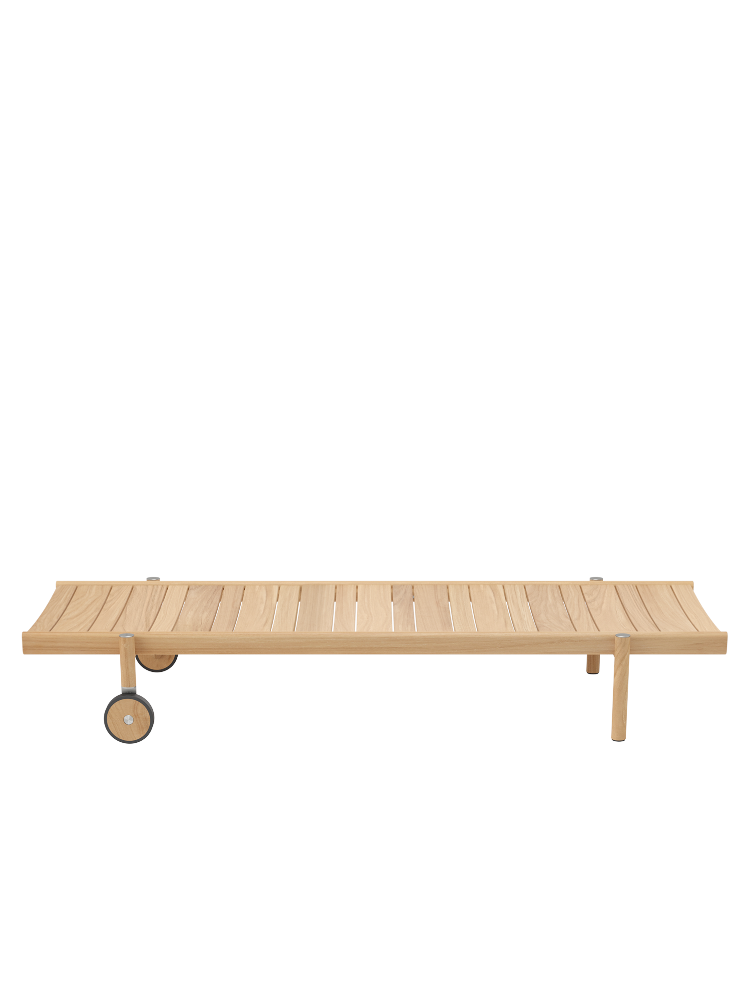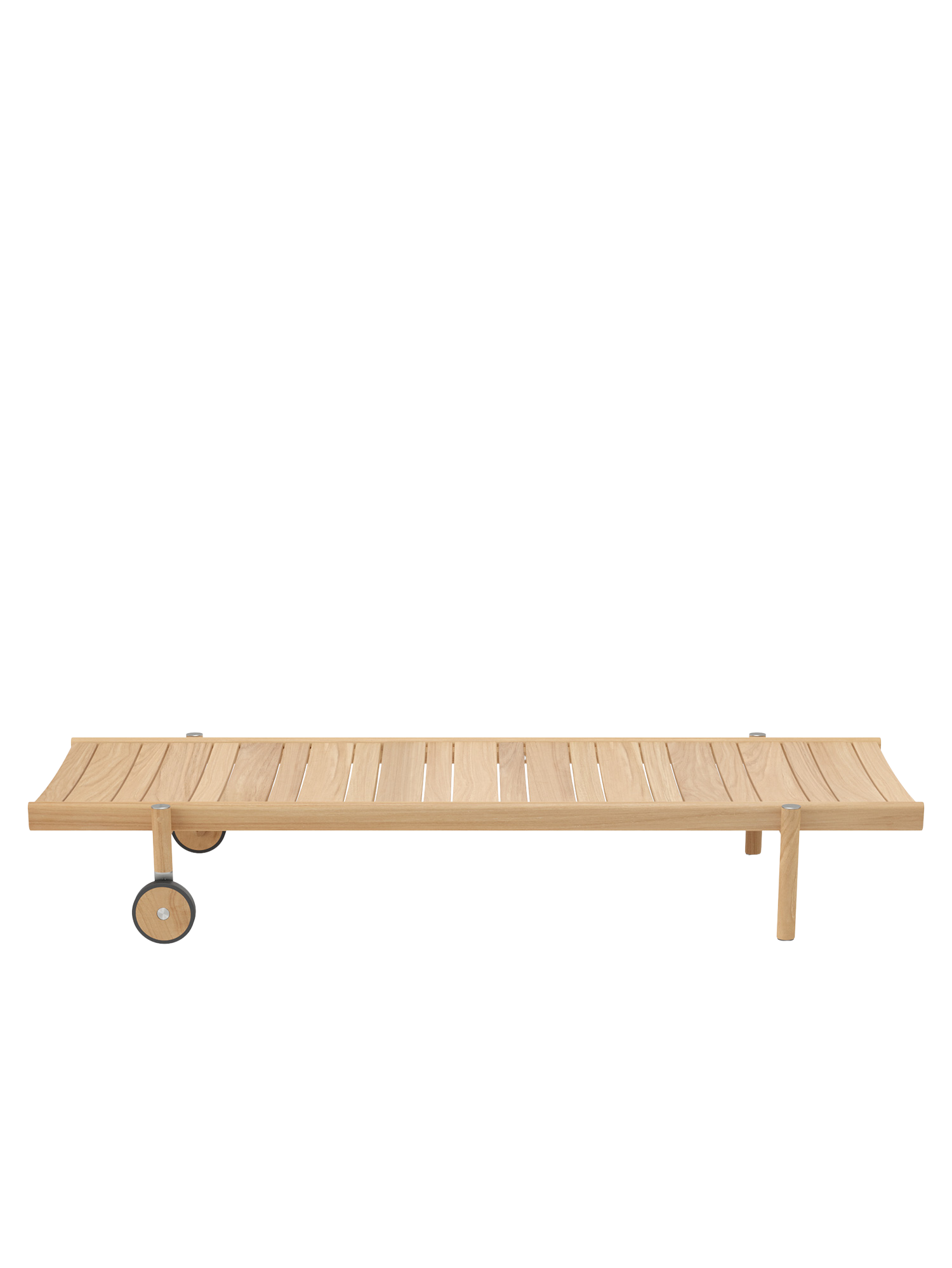 Die aussen stehenden Beine aus gedrechseltem Teakholz räumen der breiten Liegefläche luftigen Überhang ein. So fügt sich das puristische Design der stapelbaren Cavo Liege in den Stil der Serie ein.