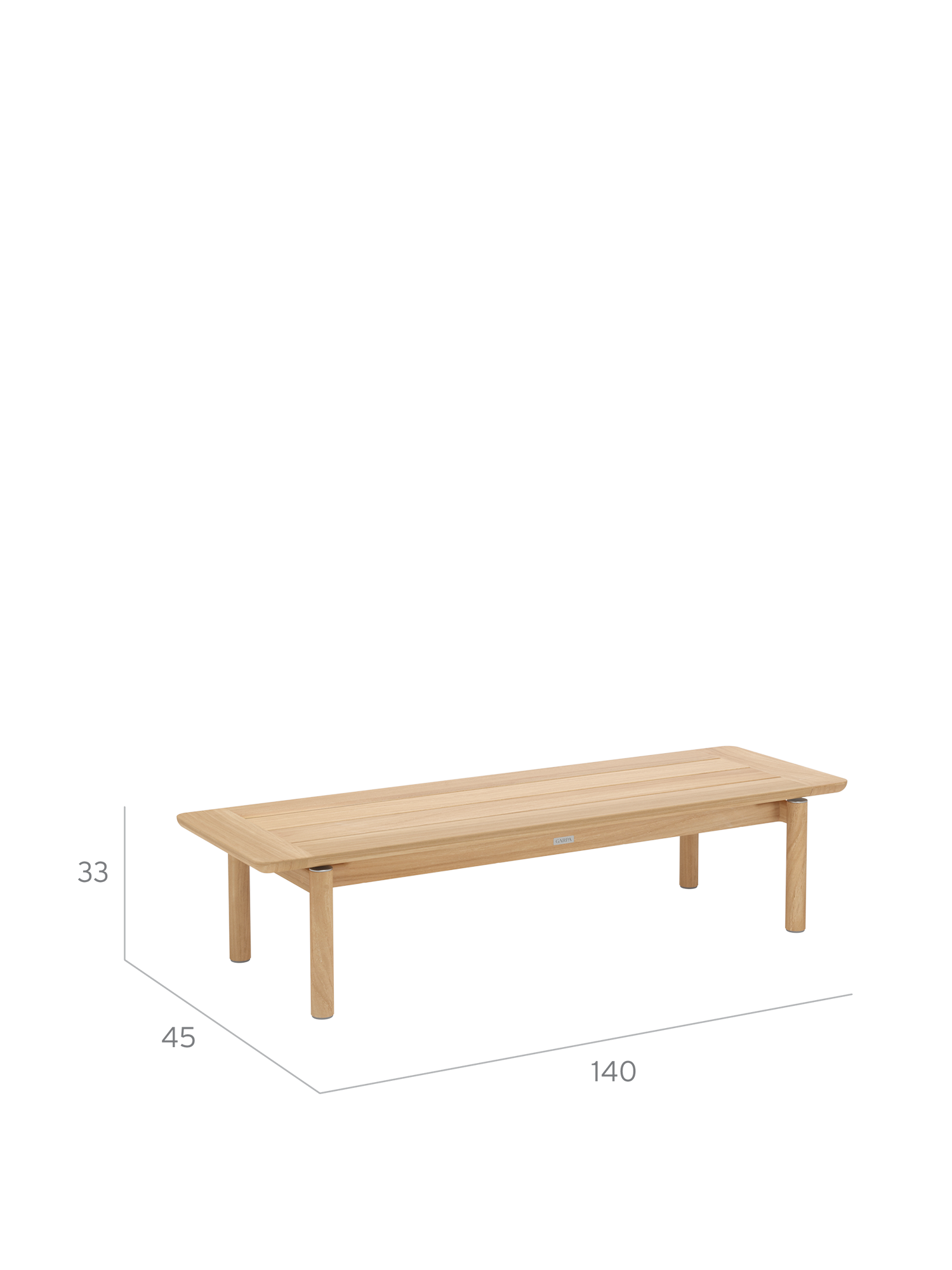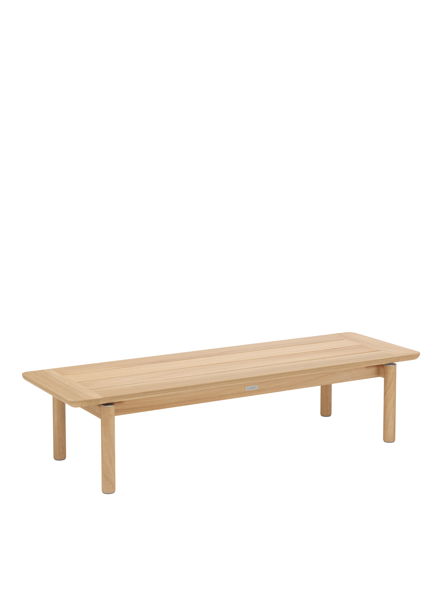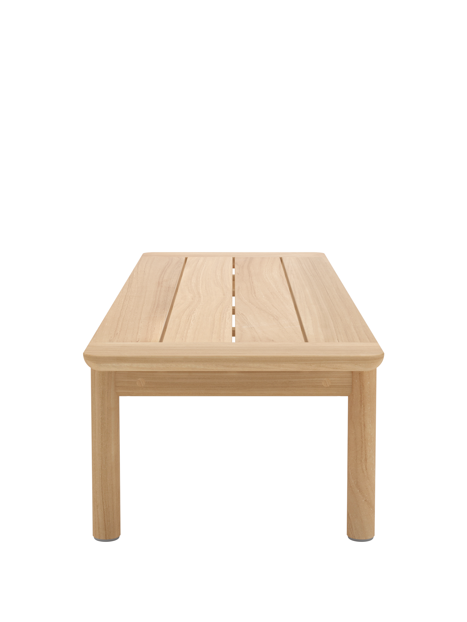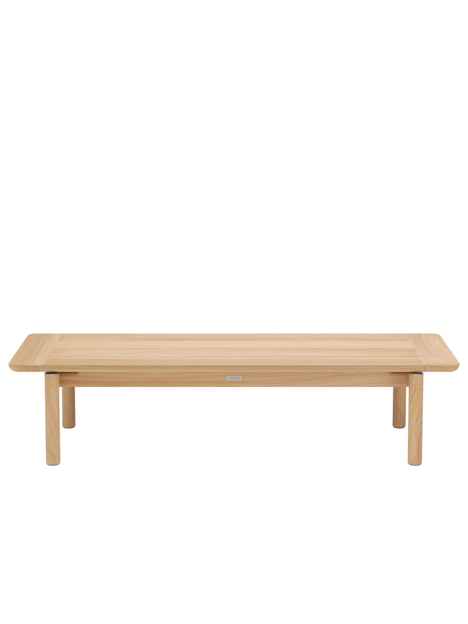 Die passenden niedrigen Tische der Cavo Serie setzen eigene Akzente. Durch ihre individuelle Formgebung scheinen die Platten aus wetterfestem Plantagenteak über den Tischbeinen zu schweben. Abschlusselemente aus gebürstetem Edelstahl unterstreichen das schlichte Design.