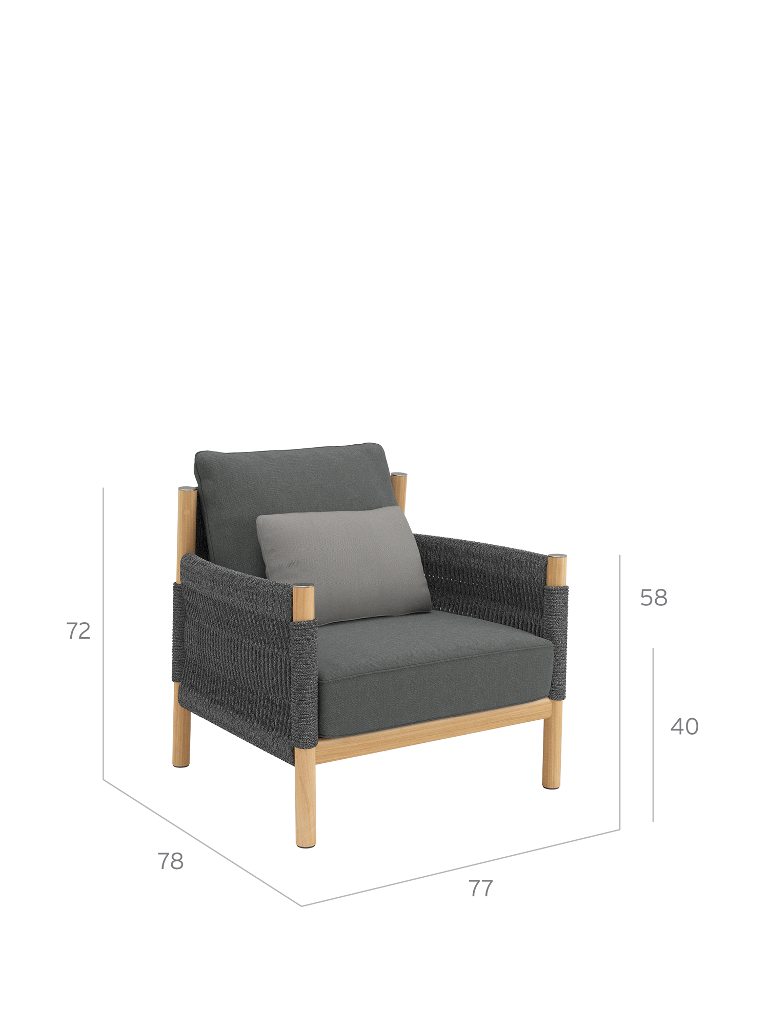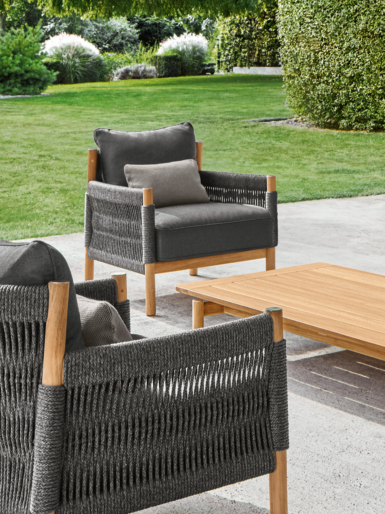 Teakholz übernimmt den klassischen Part in fein gedrechselter Gestalt. Matt gebürstete Edelstahlkappen setzen dazu schlichte Akzente. Eine wetterfeste Kordel in edlem Anthrazit, die von Hand zu einem so markanten wie anschmiegsamen Geflecht verarbeitet wird, schafft innovative Eleganz. Das hochwertige Material besteht aus Polypropylen mit einem Polyesterkern.