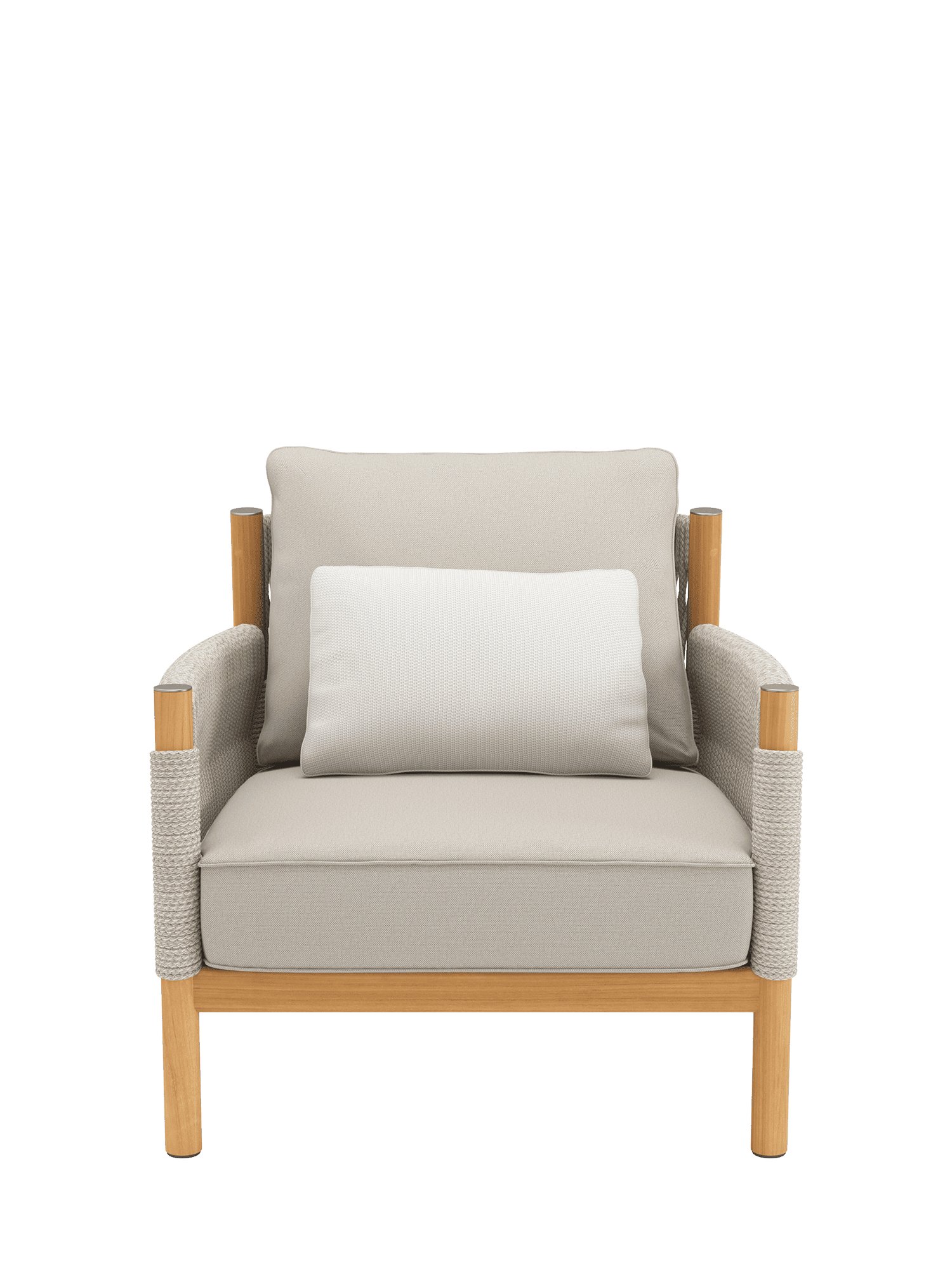 Einladend weiche Polster und Kissen vollenden den Komfort. Zum behaglichen Sessel der Serie gehört ein Zusatzkissen im Dessin "Woven Sand" im Format 45 x 30 cm. Optional erhältliche Zierkissen im Format 50 x 45 cm finden Sie unter "Zubehör" weiter unten auf dieser Seite.
