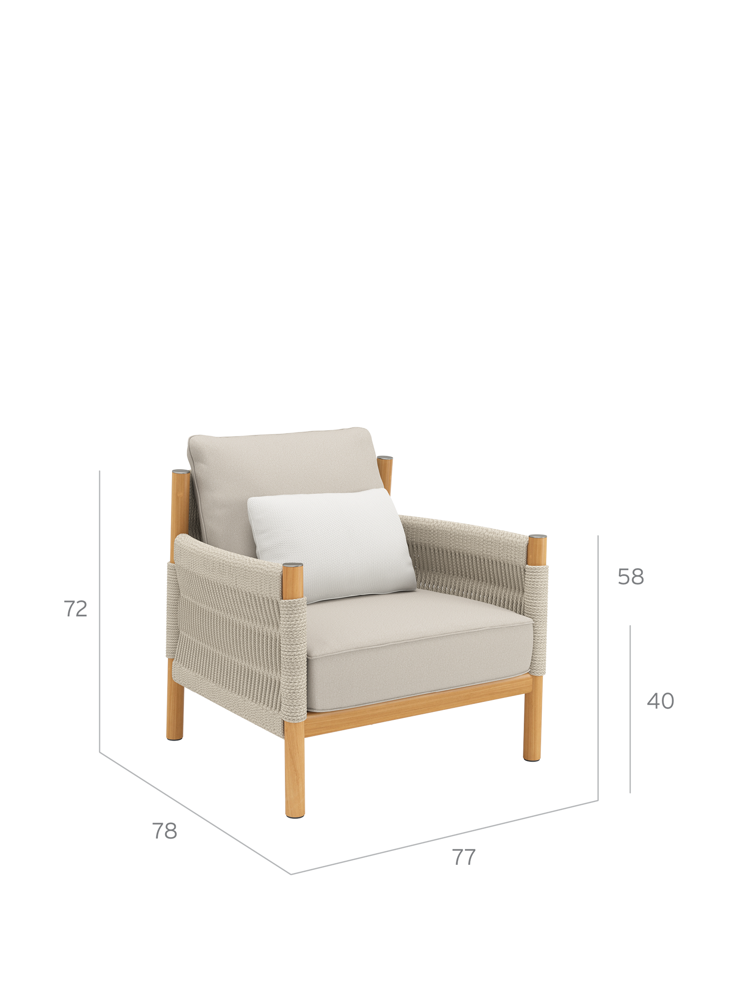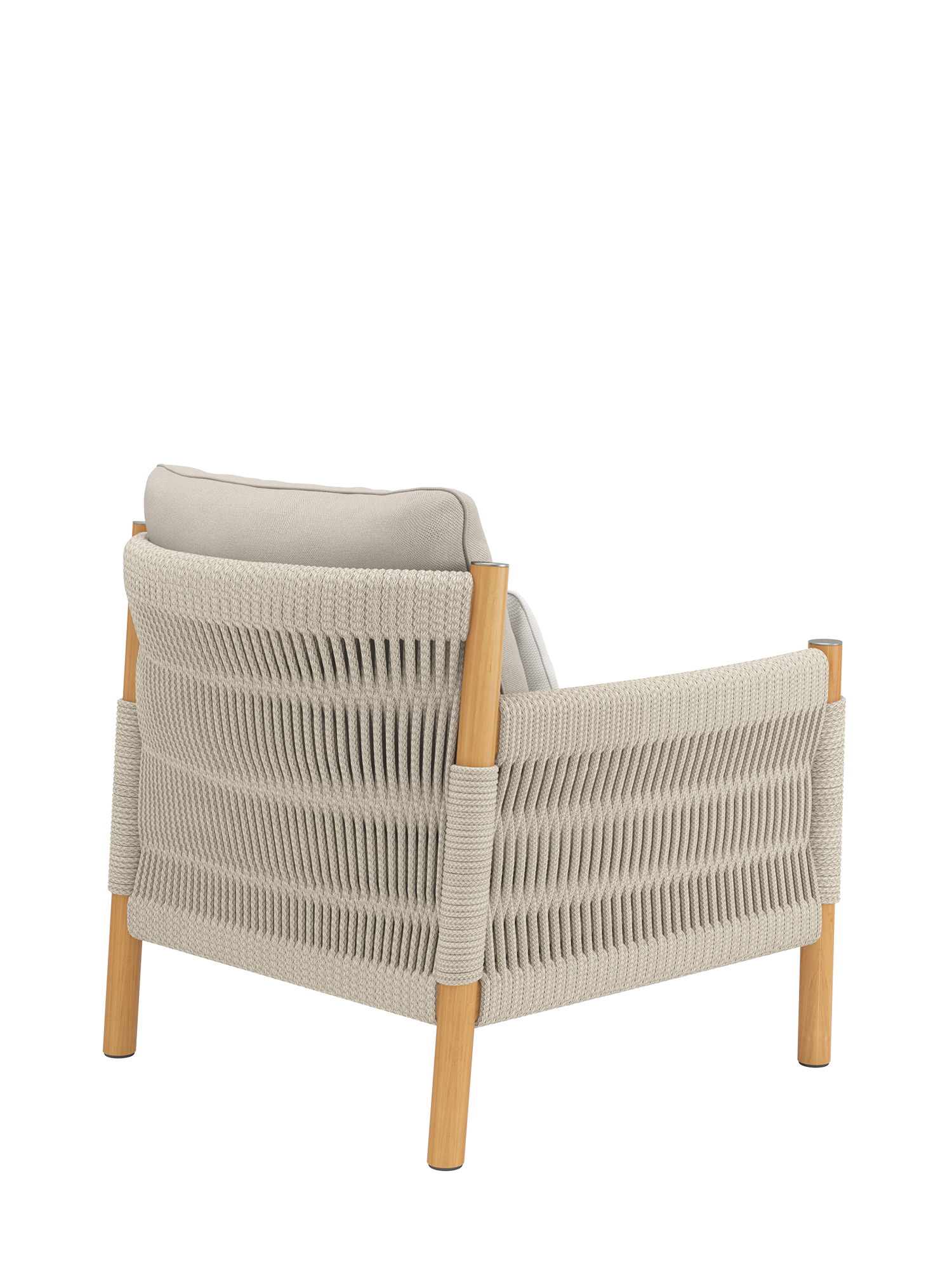 Teakholz übernimmt den klassischen Part in fein gedrechselter Gestalt. Matt gebürstete Edelstahlkappen setzen dazu schlichte Akzente. Eine wetterfeste Kordel in edlem Beige, die von Hand zu einem so markanten wie anschmiegsamen Geflecht verarbeitet wird, schafft innovative Eleganz. Das hochwertige Material besteht aus Polypropylen mit einem Polyesterkern.
