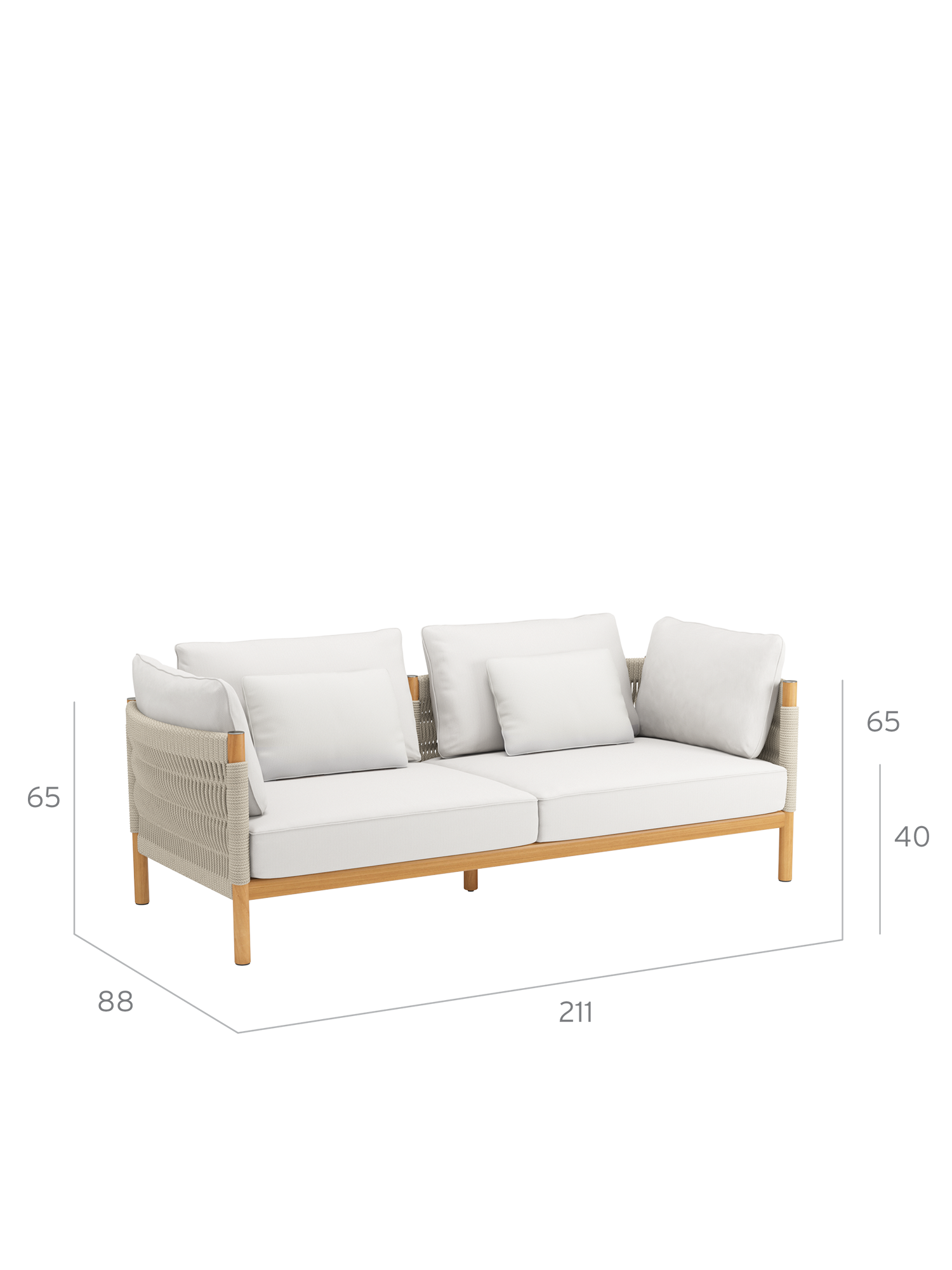 Teakholz übernimmt den klassischen Part in fein gedrechselter Gestalt. Matt gebürstete Edelstahlkappen setzen dazu schlichte Akzente. Eine wetterfeste Kordel in edlem Beige, die von Hand zu einem so markanten wie anschmiegsamen Geflecht verarbeitet wird, schafft innovative Eleganz. Das hochwertige Material besteht aus Polypropylen mit einem Polyesterkern.