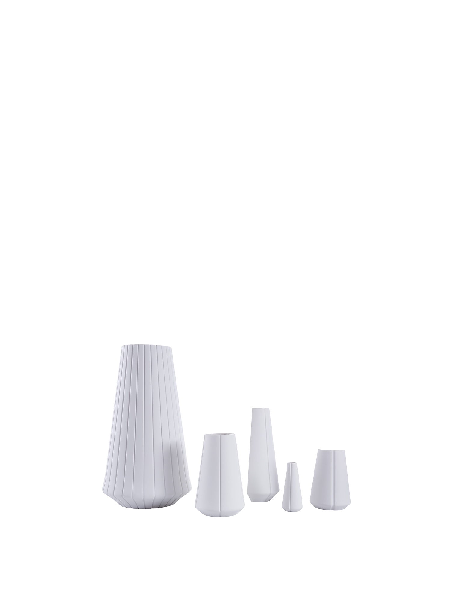 Aus derselben Manufaktur stammen die runden Exemplare. Die Oberflächen aller Vasen ziert ein feines Streifenrelief.