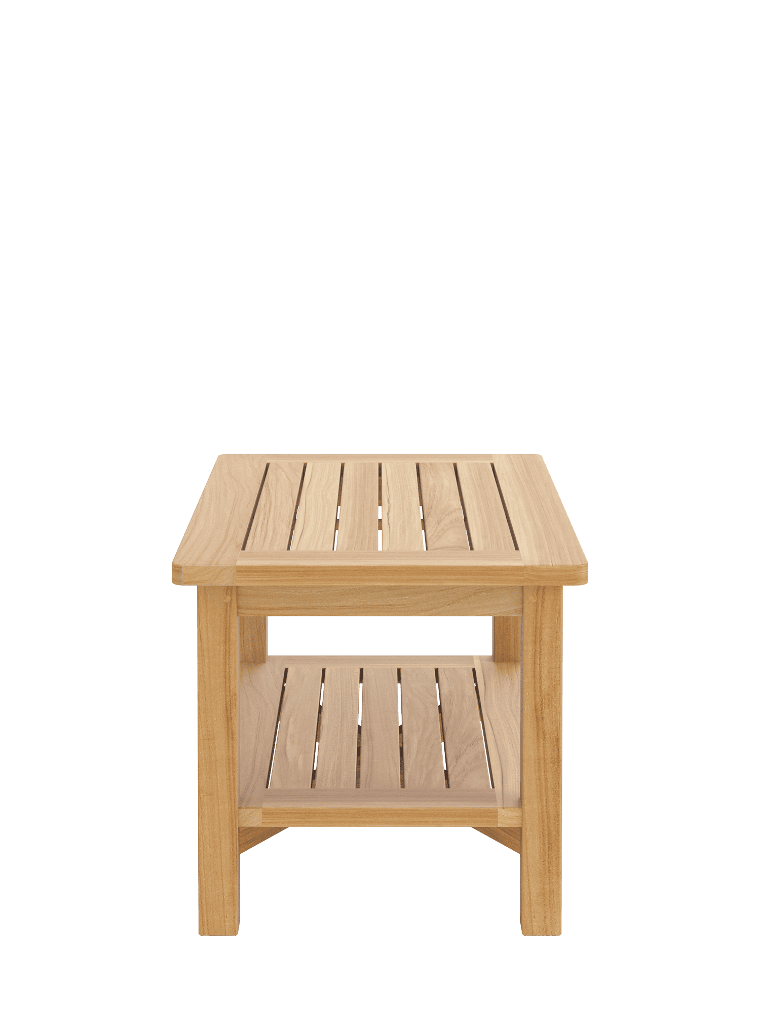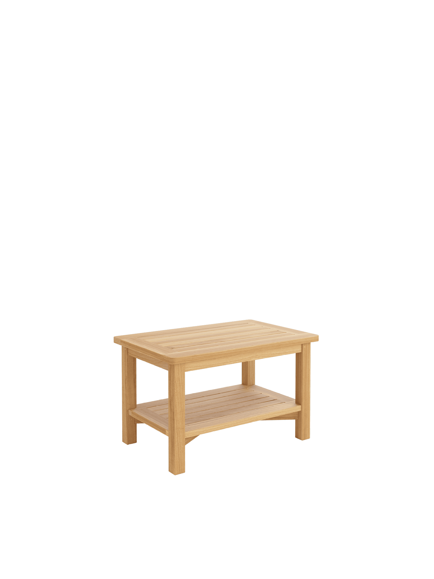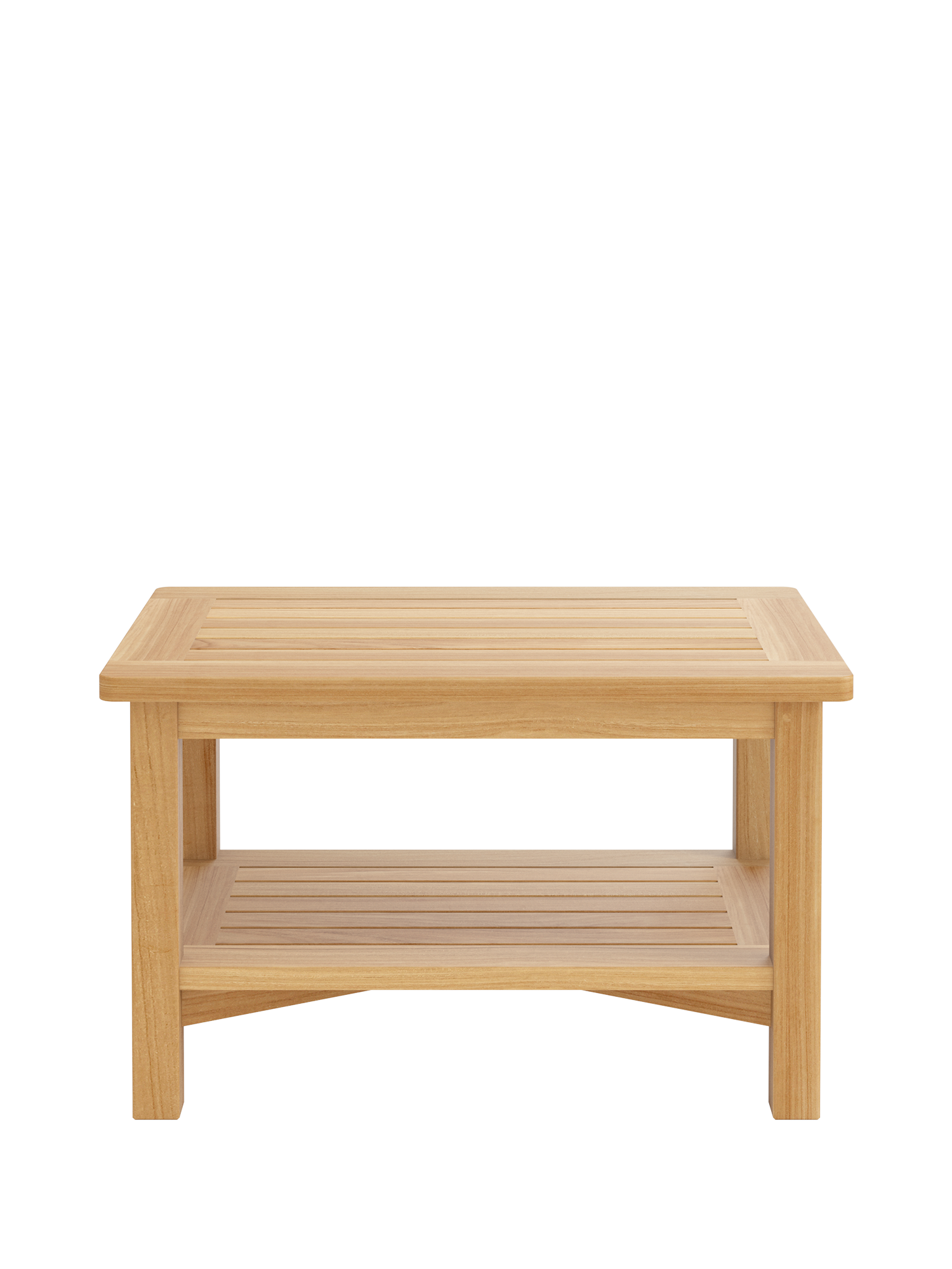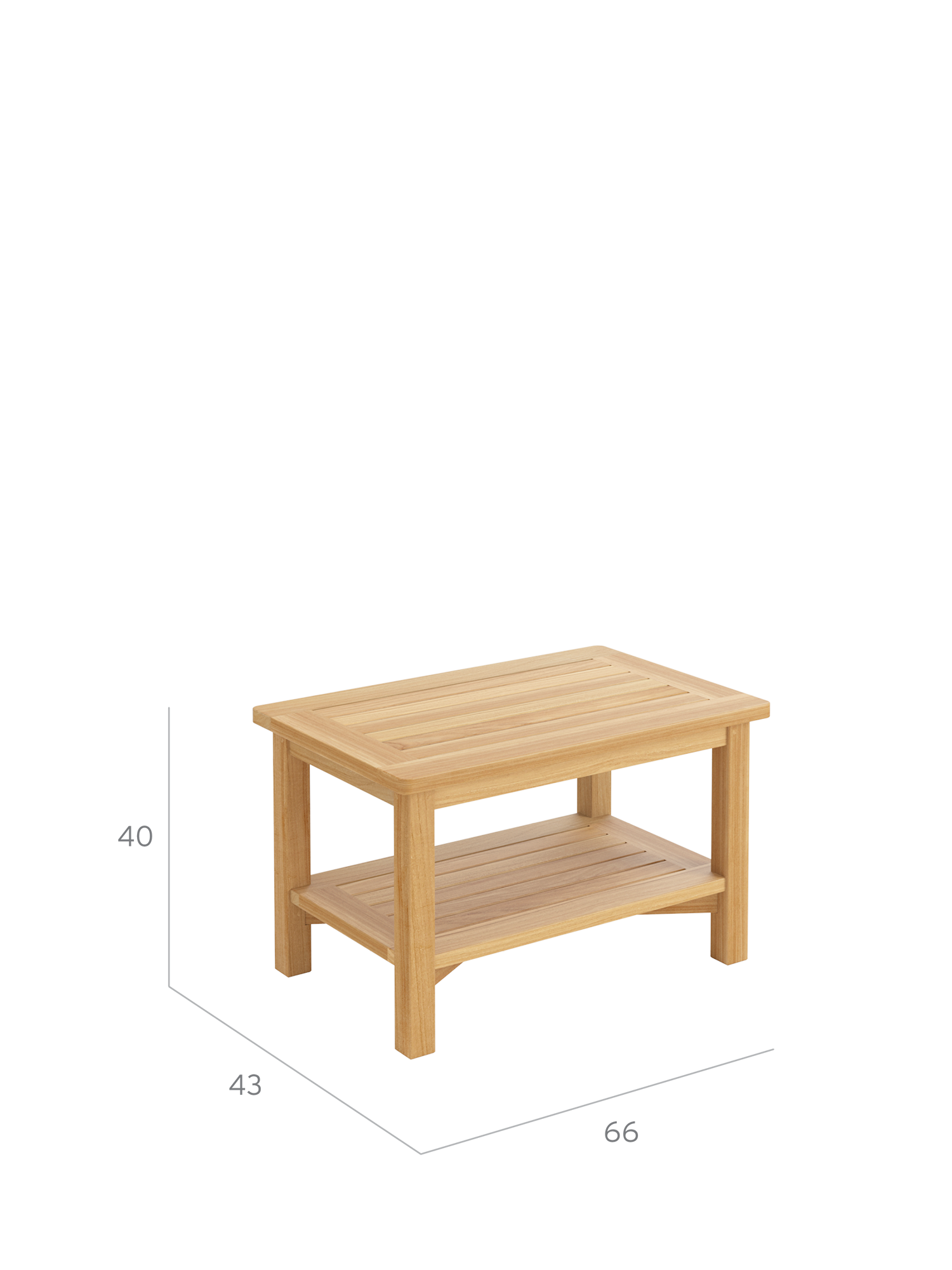 Der rechteckige Beistelltisch aus Teak bietet auf zwei Ebenen zusätzliche Abstellfläche.