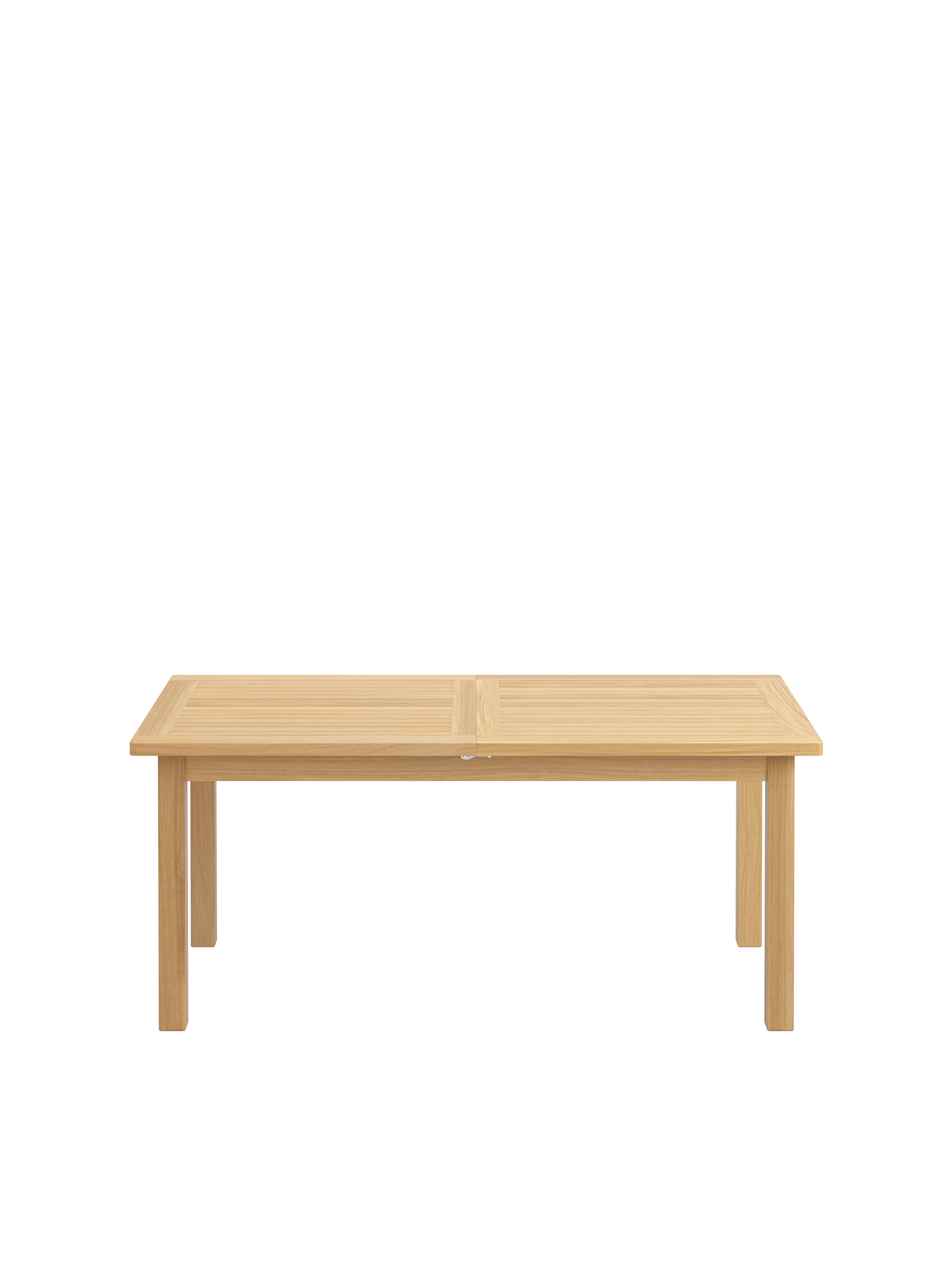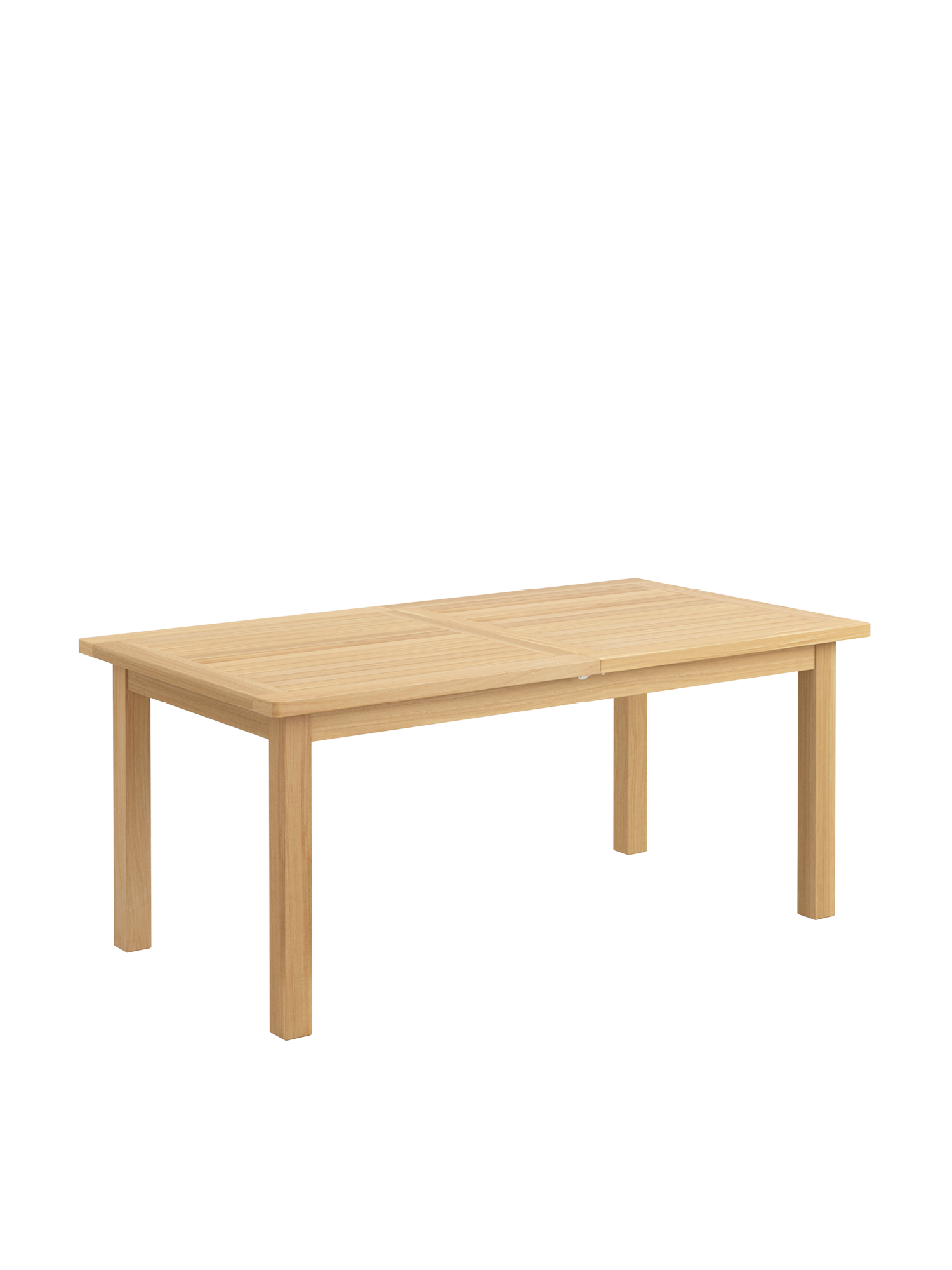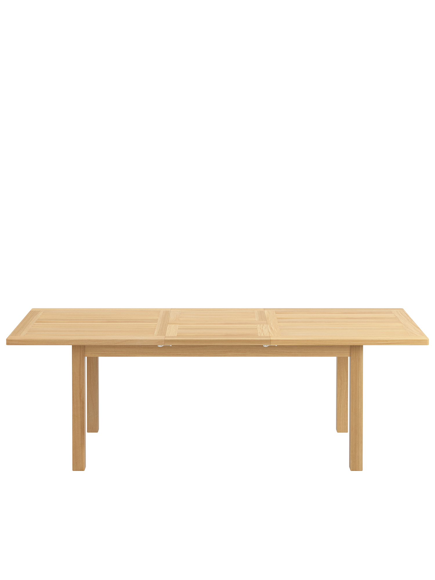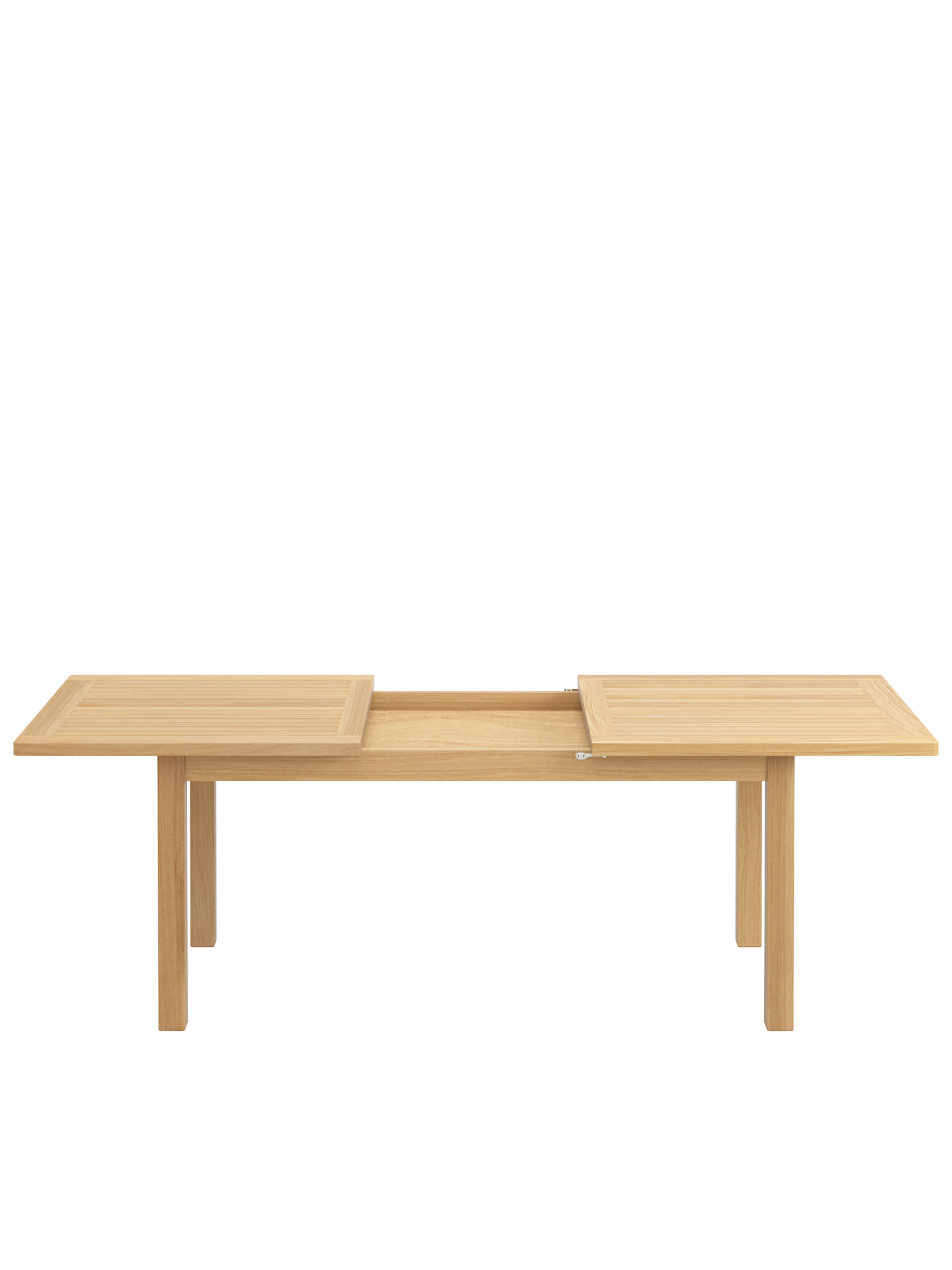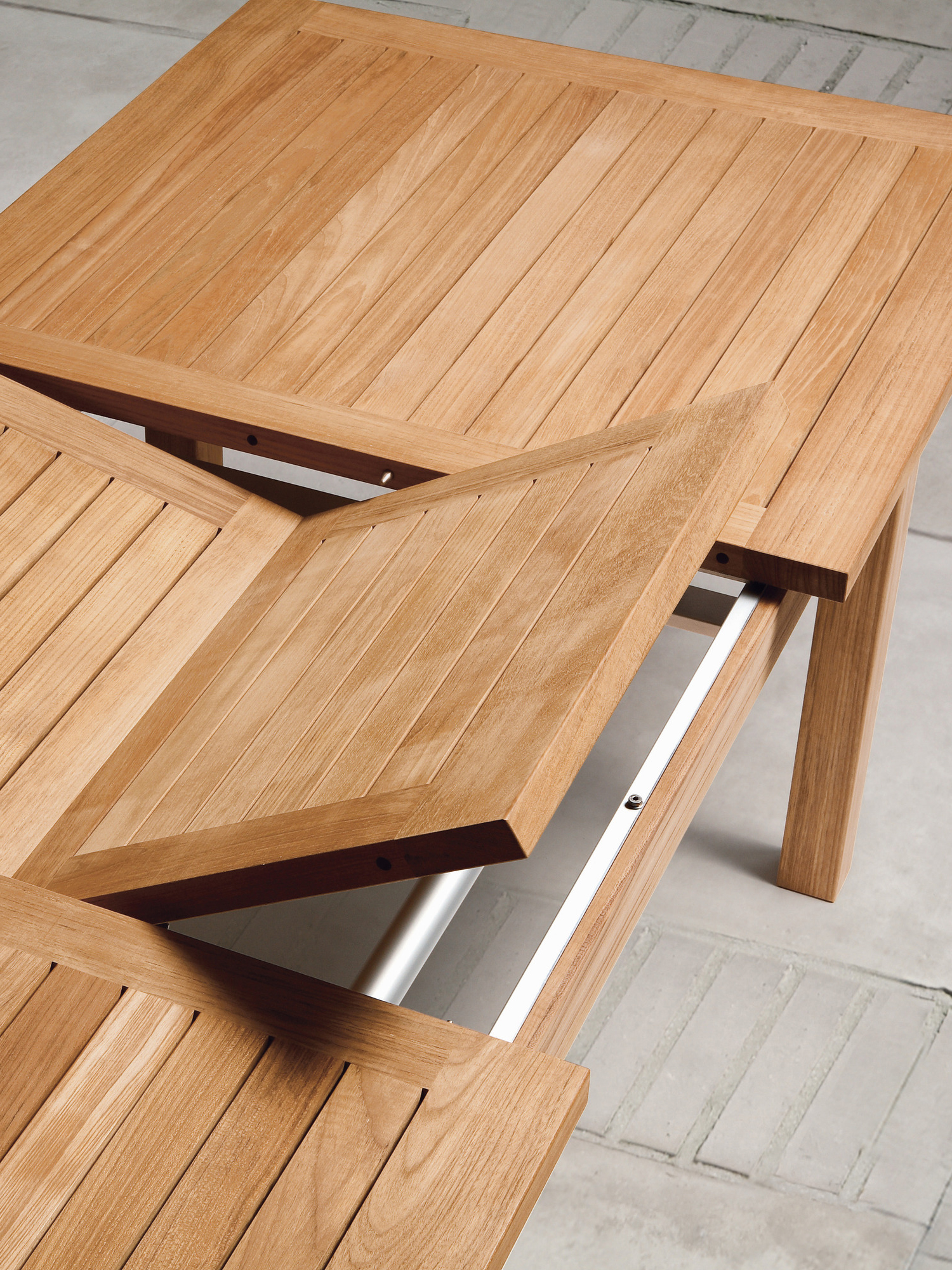 Bei allen Teak Ausziehtischen lässt sich das Mittelteil leichtgängig klappen. Wird es nicht benötigt, lagert es im Tisch. Beim Cornwall Tisch sind wartungsfreie Aluminiumteile aufwändig in das massive Teakholz eingearbeitet und halten so den Mechanismus zuverlässig in Form.