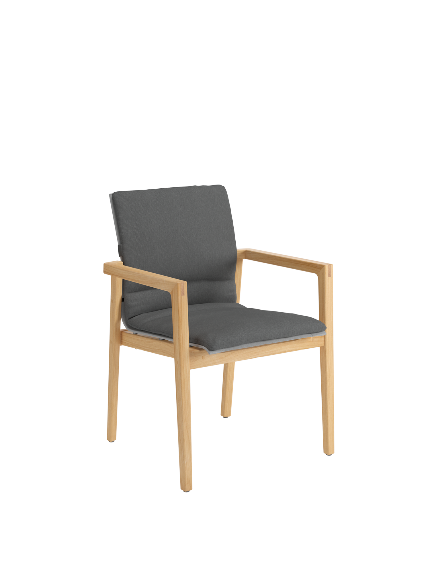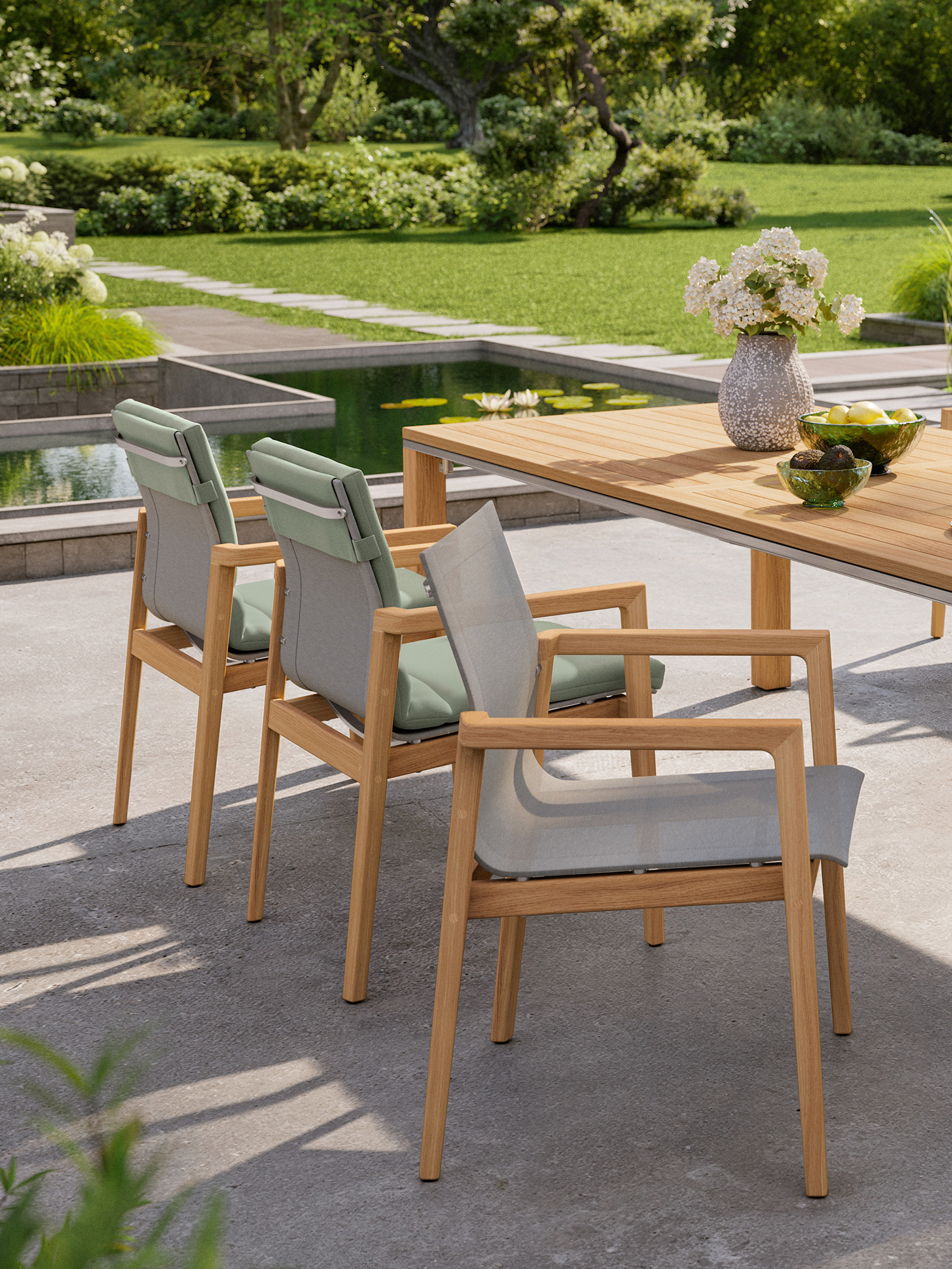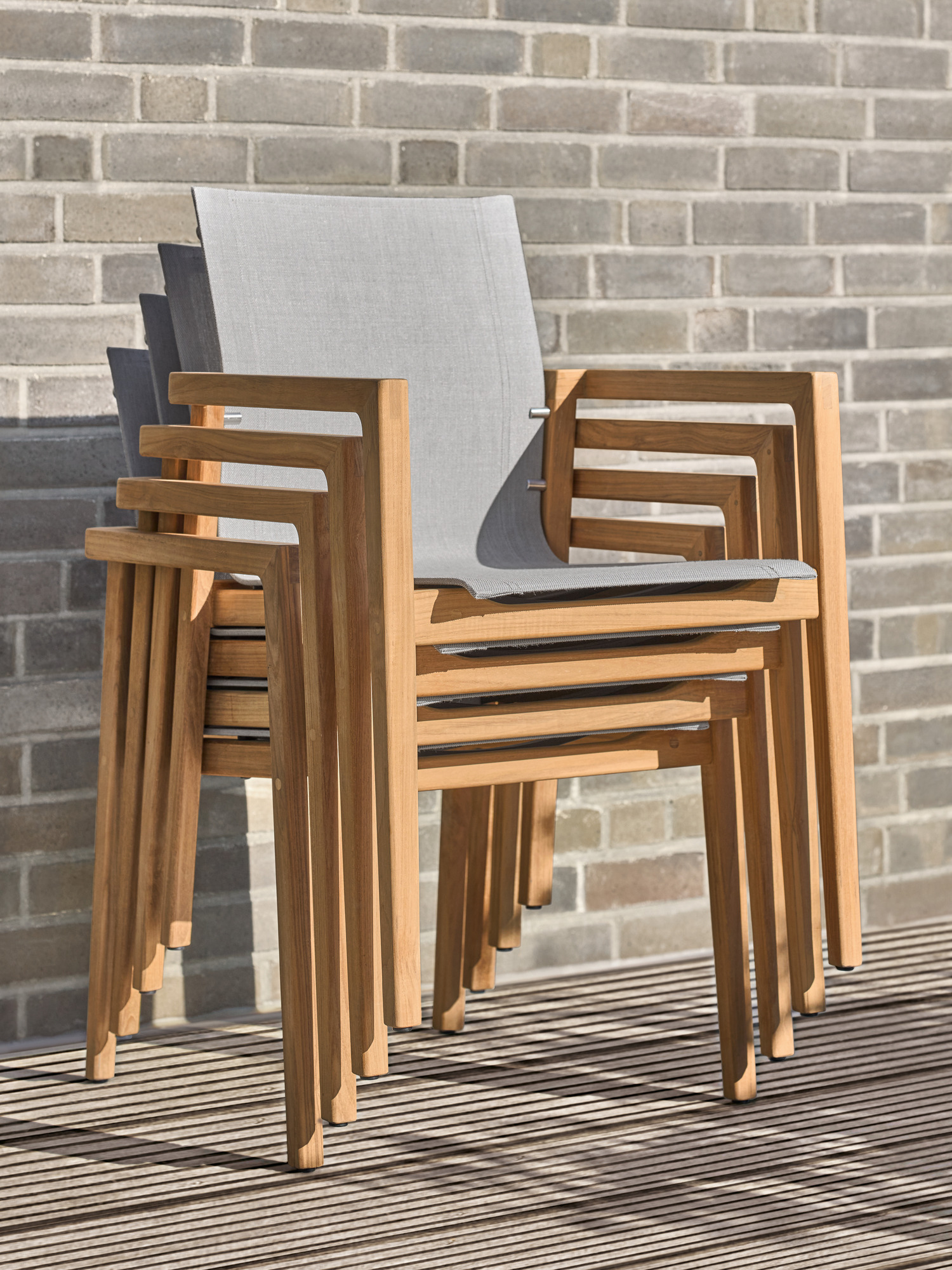 Auf der sonnengefluteten Terrasse kombinieren klassisches Teak und modernes Gewebe ihre Vorzüge: Derry Armlehnstühle mit grafisch anmutender Silhouette versprechen ein erhebendes Gefühl.