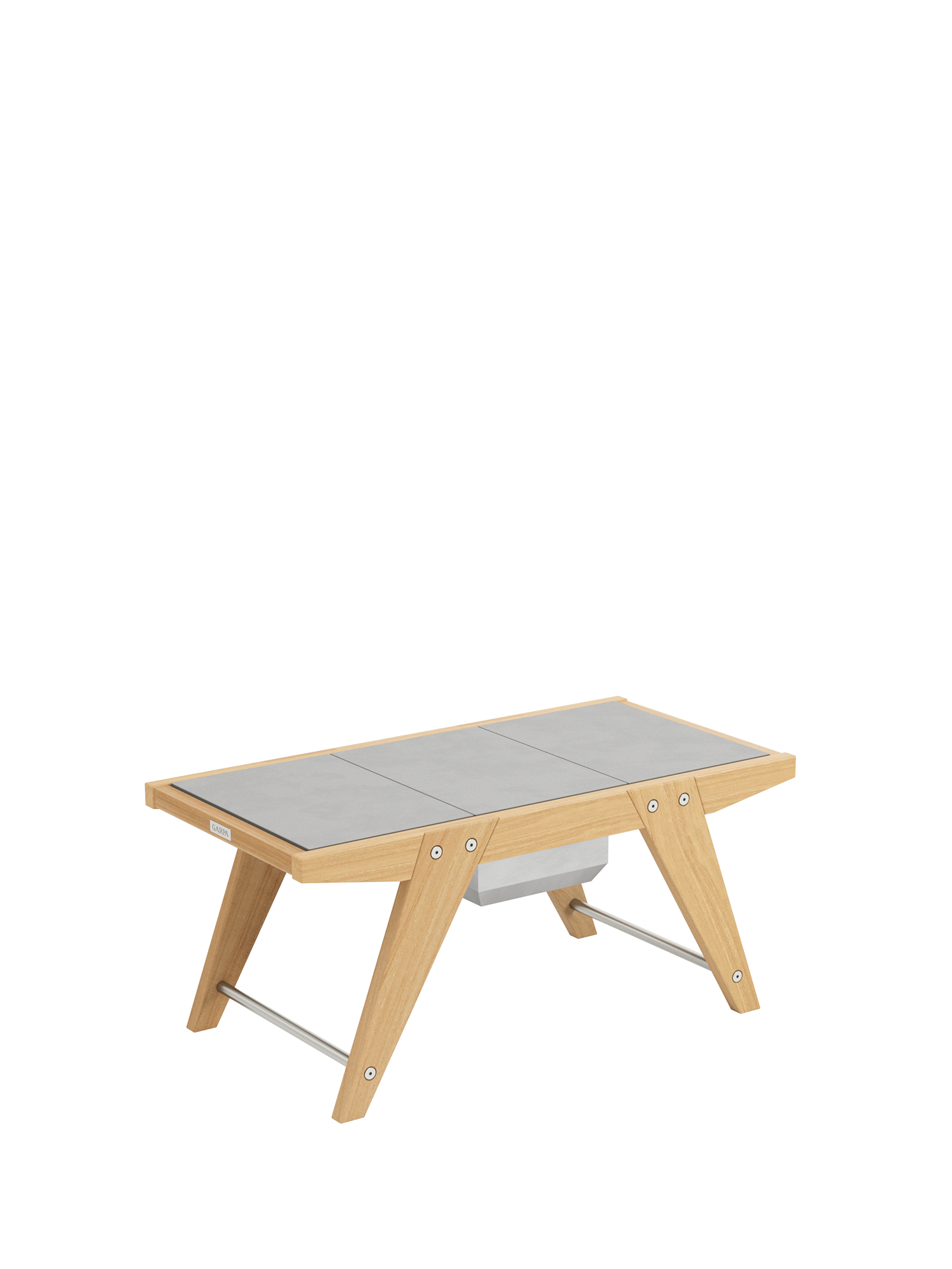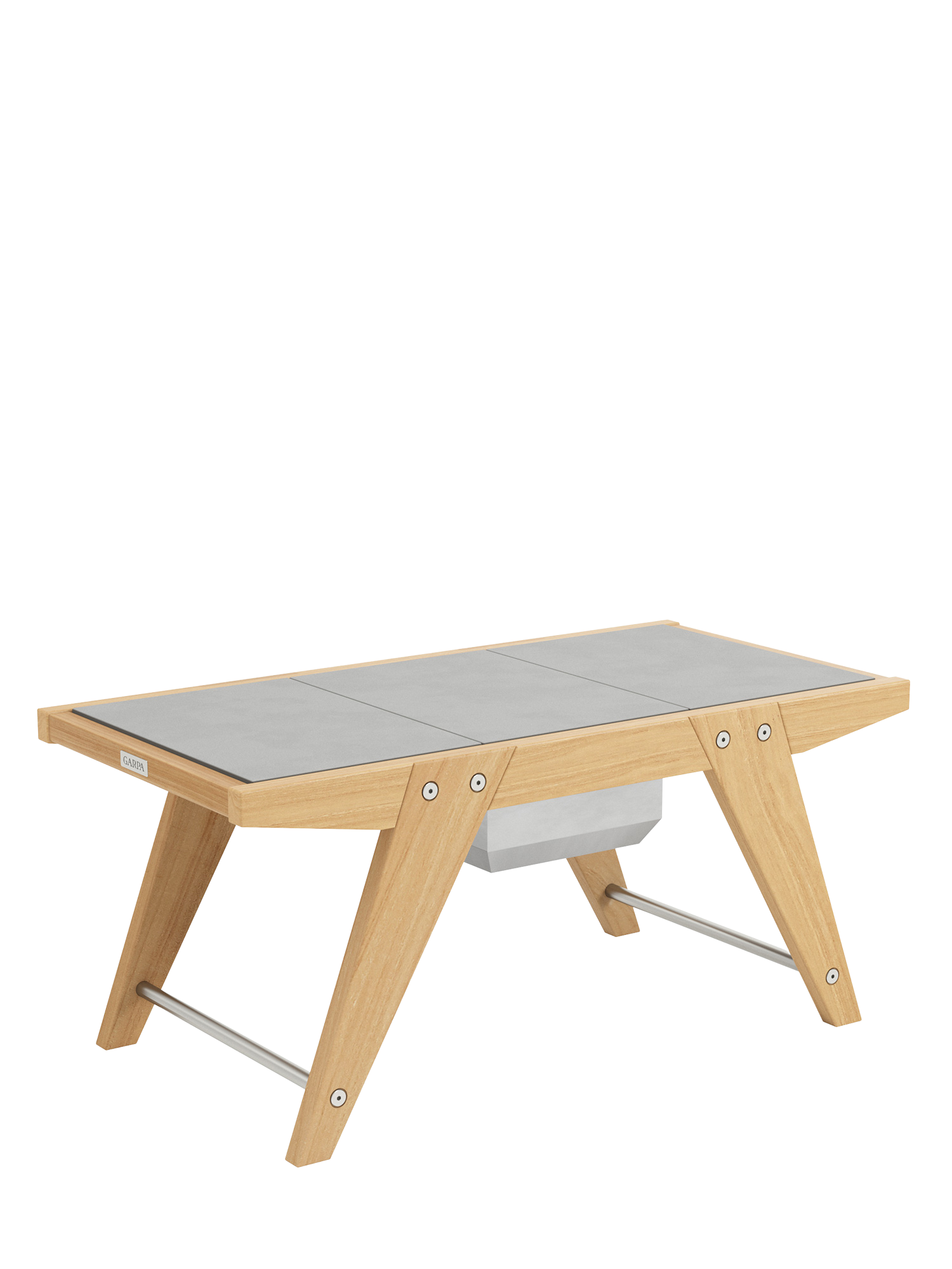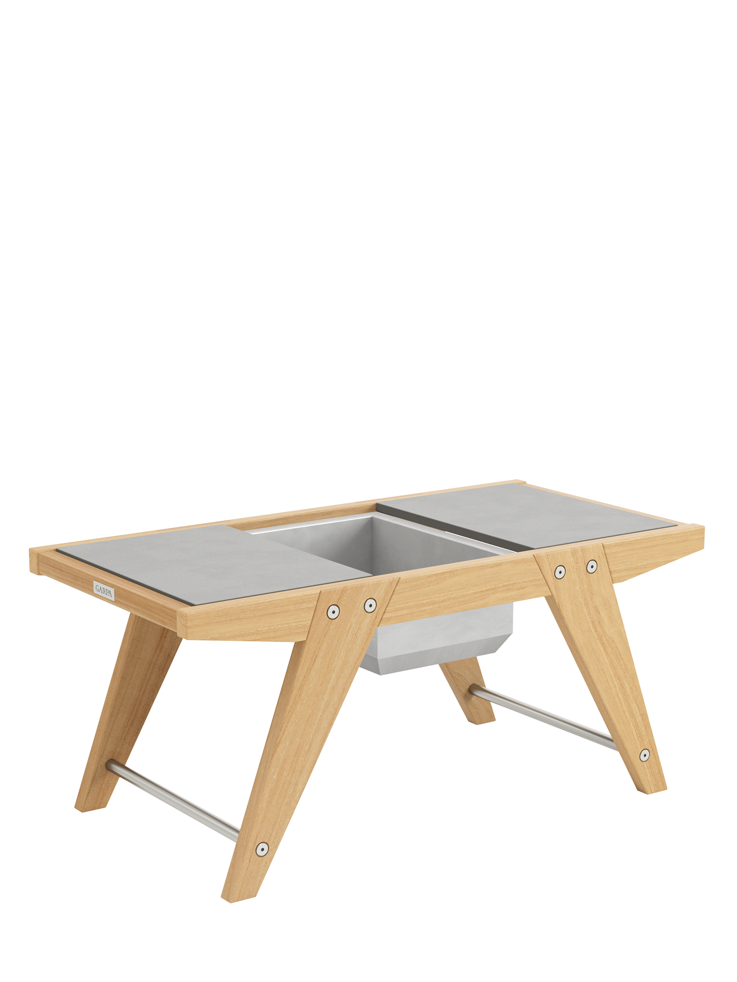 Die Doppia Beistelltische aus Teak sind in drei Varianten und mit Oberflächen aus Teak oder Kunstharz erhältlich. Die Tischplatte des rechteckigen Beistelltisches mit Einsatz lässt sich zu beiden Seiten hin öffnen. Im eingelassenen Edelstahlbehälter finden Utensilien Platz; mit Eis gefüllt, hält er sogar Getränke kalt.