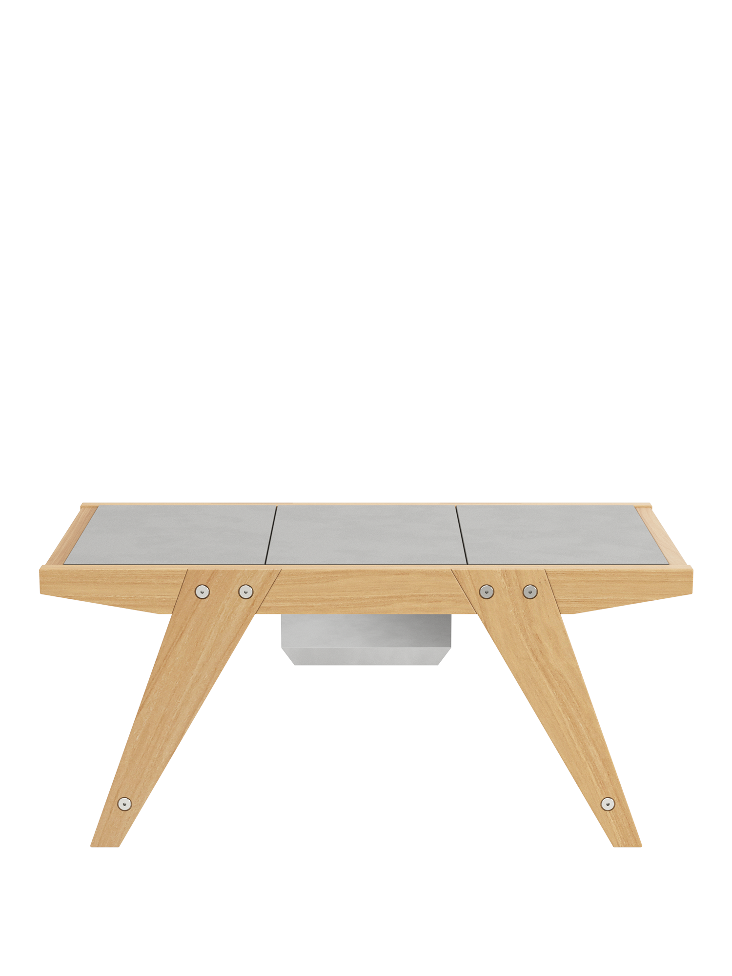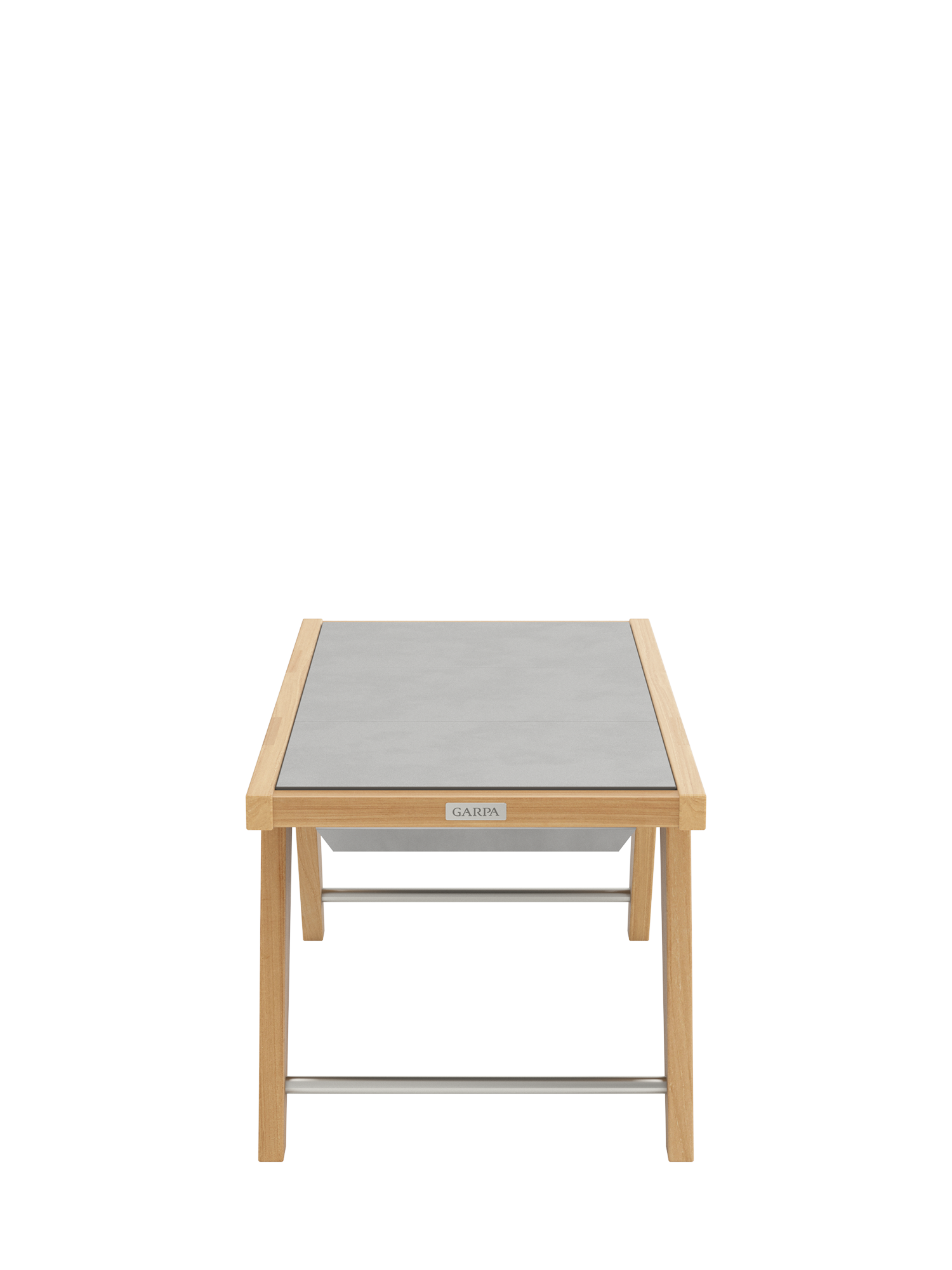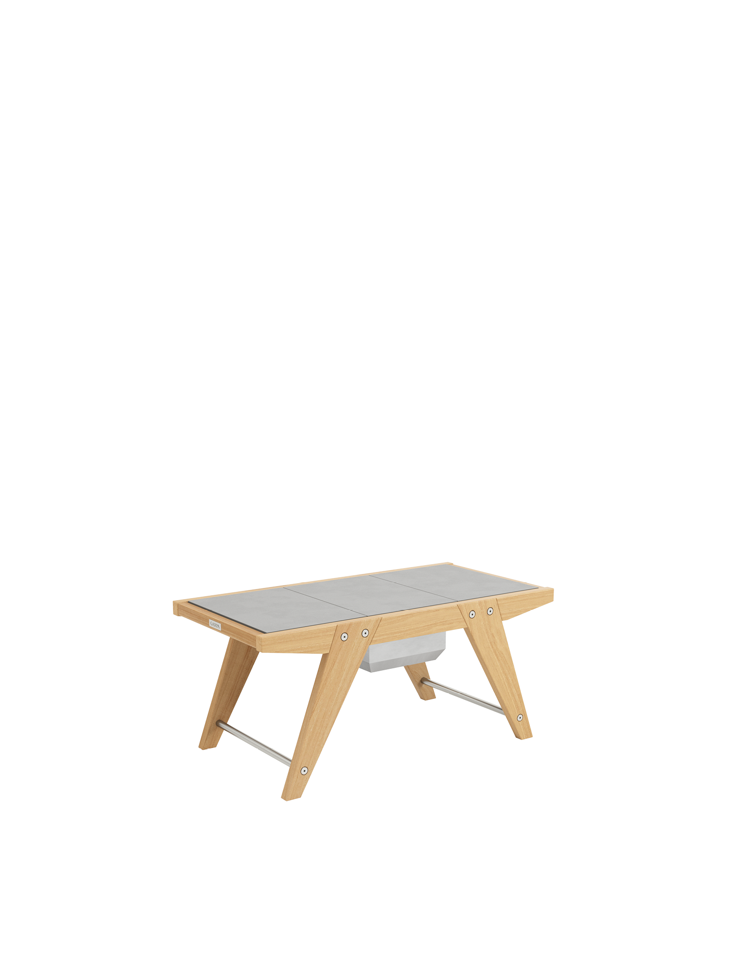 Die Doppia Beistelltische aus Teak sind in drei Varianten und mit Oberflächen aus Teak oder Kunstharz erhältlich. Die Tischplatte des rechteckigen Beistelltisches mit Einsatz lässt sich zu beiden Seiten hin öffnen. Im eingelassenen Edelstahlbehälter finden Utensilien Platz; mit Eis gefüllt, hält er sogar Getränke kalt.
