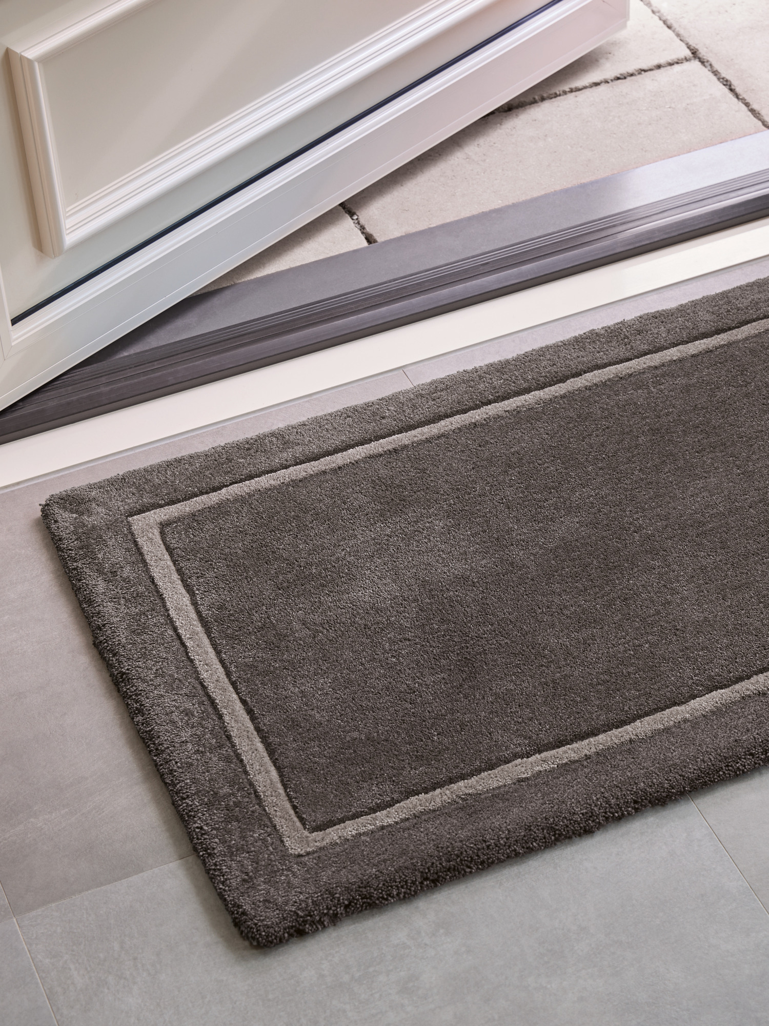 Mit seinen dichten Schlaufen aus Polyacryl saugt der Eingangsteppich für den Innenbereich im Format 90 x 60 cm zuverlässig Feuchtigkeit von den Schuhsohlen. Jede Schlaufe ist von Hand getuftet, eine rutschfeste Unterseite sorgt für Bodenhaftung. Bei Bedarf ist eine chemische Reinigung möglich.
