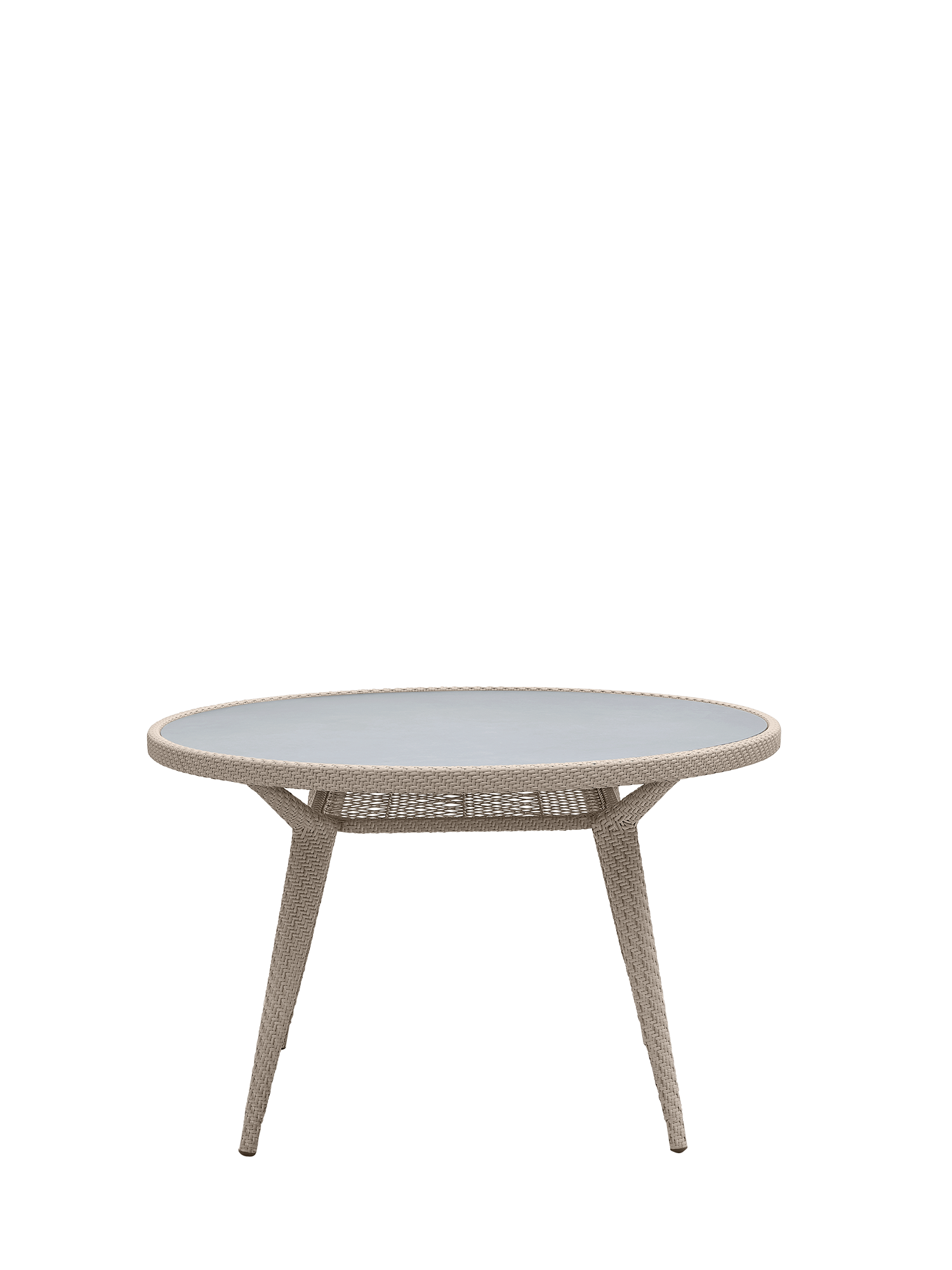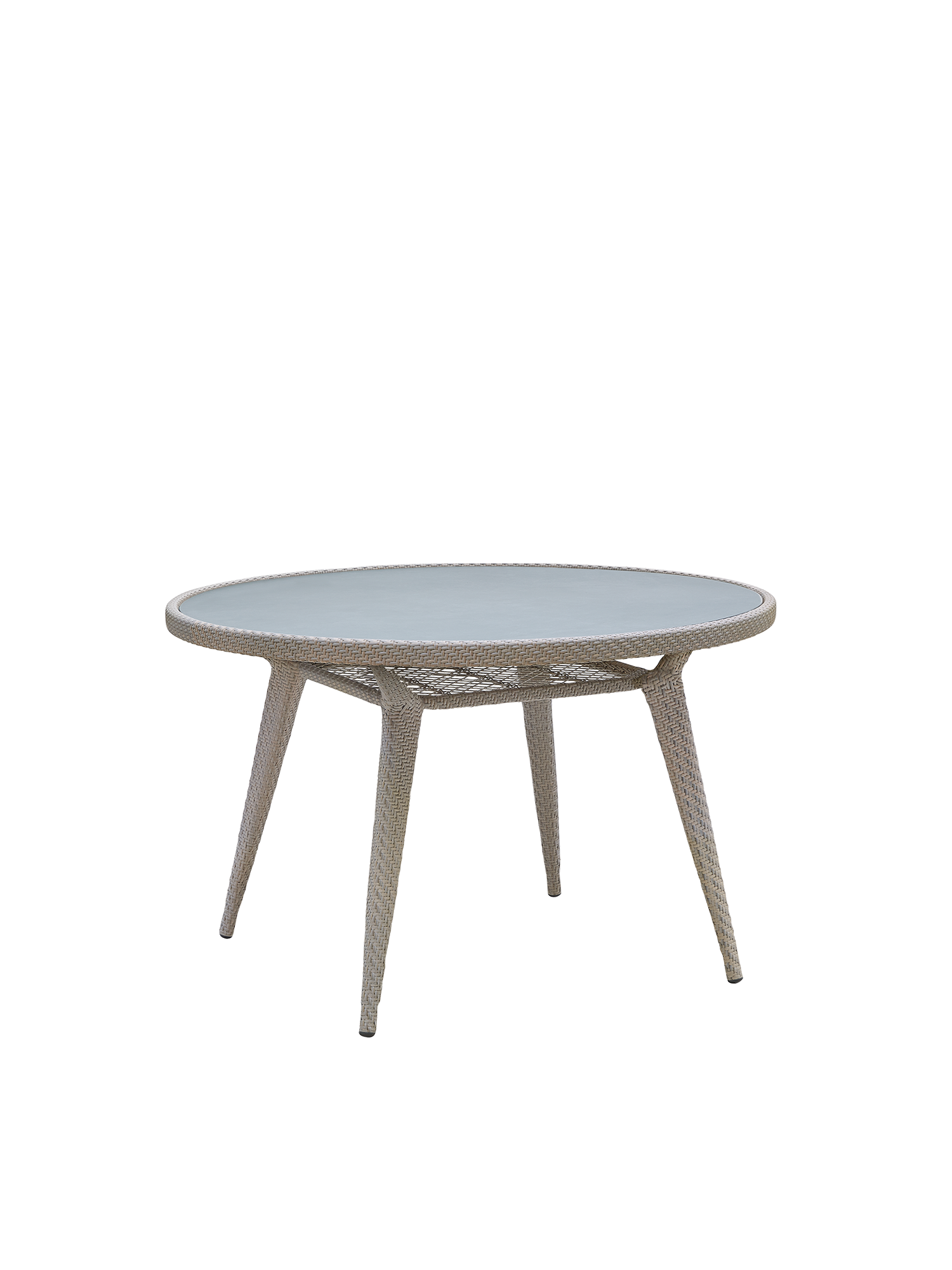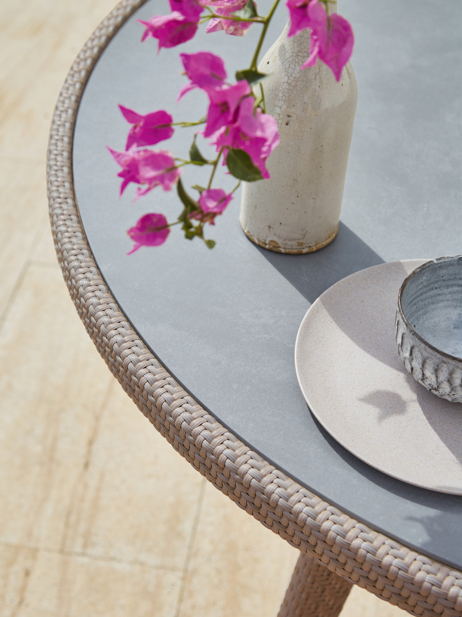 The patterning on the frames is repeated in the design of the round and rectangular tables – available with ceramic or teak tops. Both materials harmonise with the colour nuances of the wickerwork. A woven surface under the tabletop is a practical as well as decorative feature.