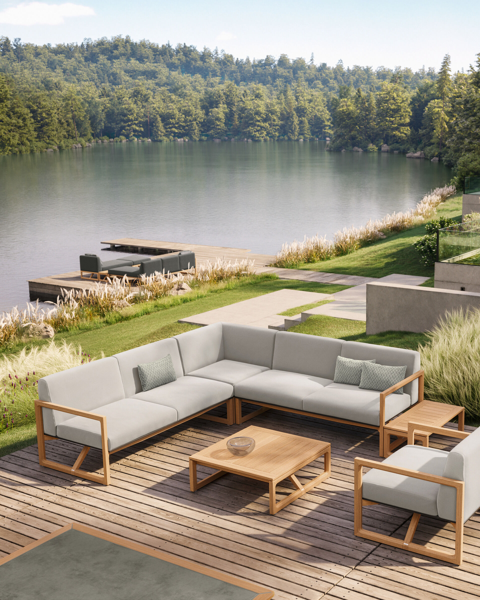 Pleasantly upholstered furniture can be grouped around a low coffee table exactly as desired. A side table completes the welcoming scenario. The salient feature uniting the comfortable lounge furniture is the self-assured design – fulfilling classic requirements for relaxation in a contemporary way. Frames made of high-quality plantation teak are fitted with upholstery made of 100% polyacrylic for optimum stability. Family-oriented minimalists will appreciate this.