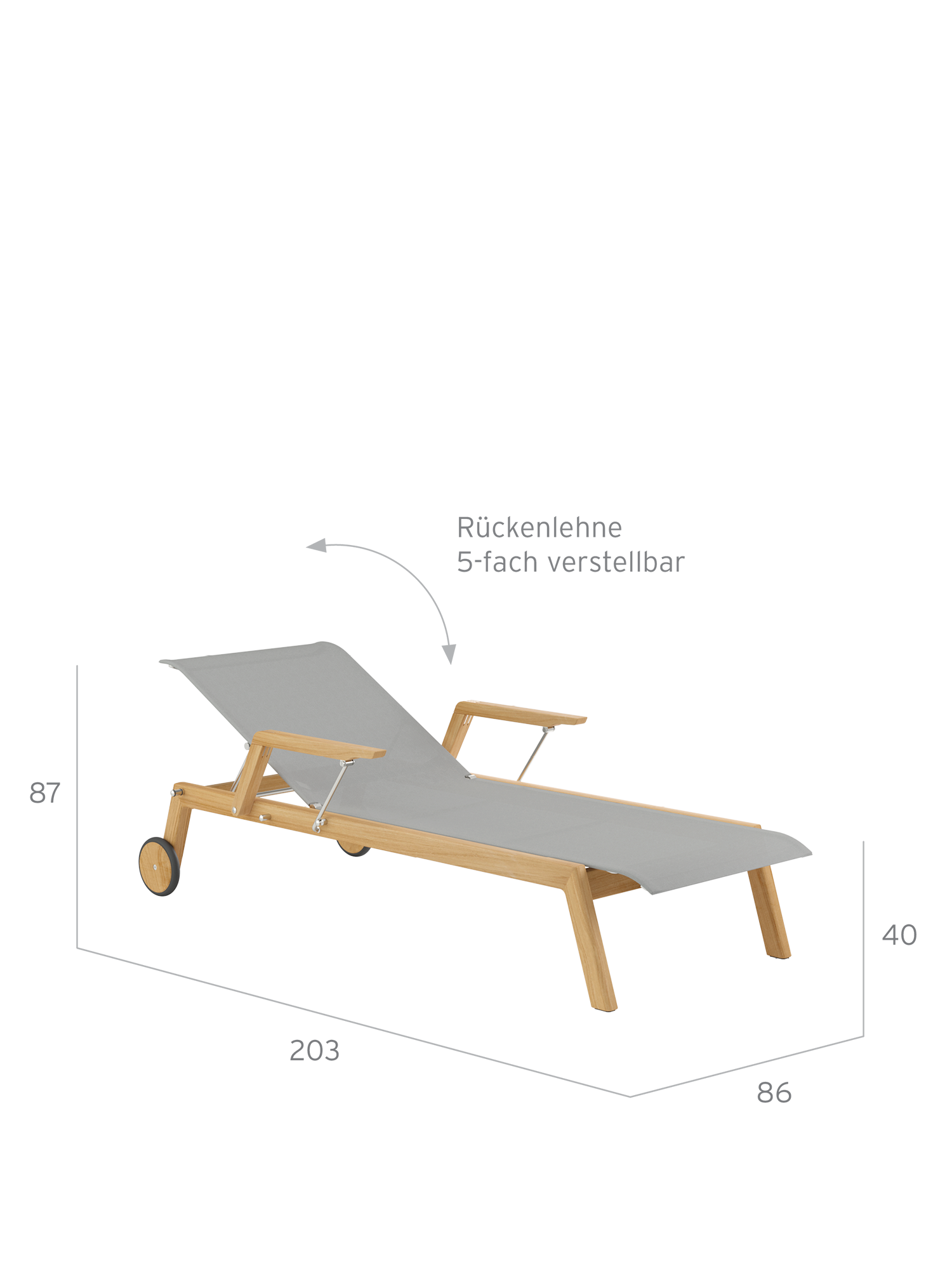 Foldable armrests ensure easy access. The perfect reclining position on dimensionally stable polymer fabric is quickly realised thanks to a five-point adjustable backrest.