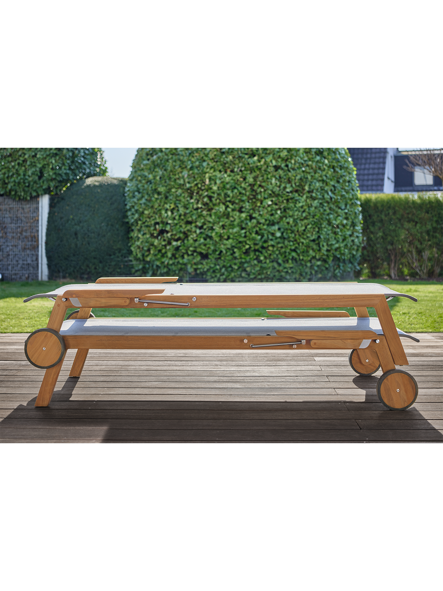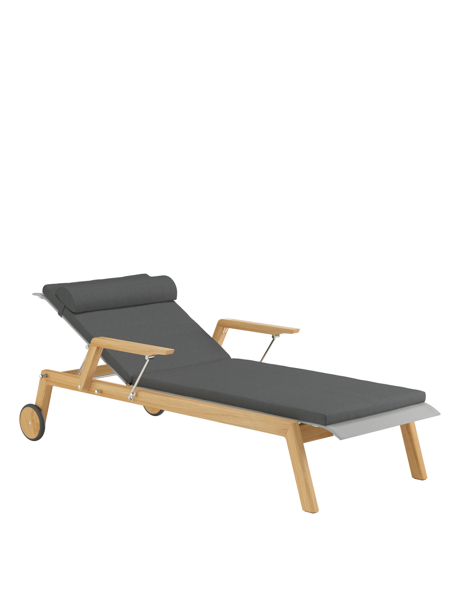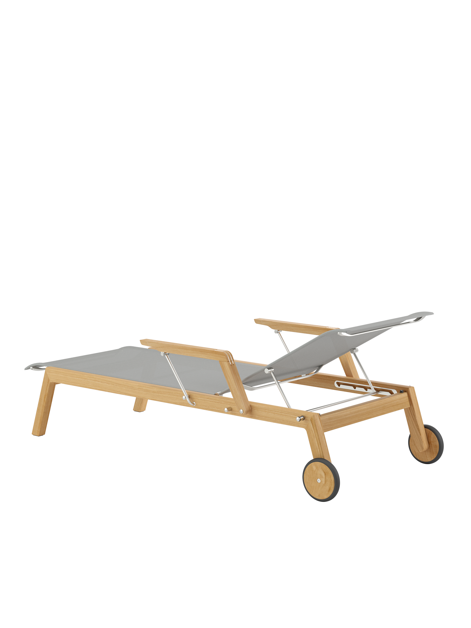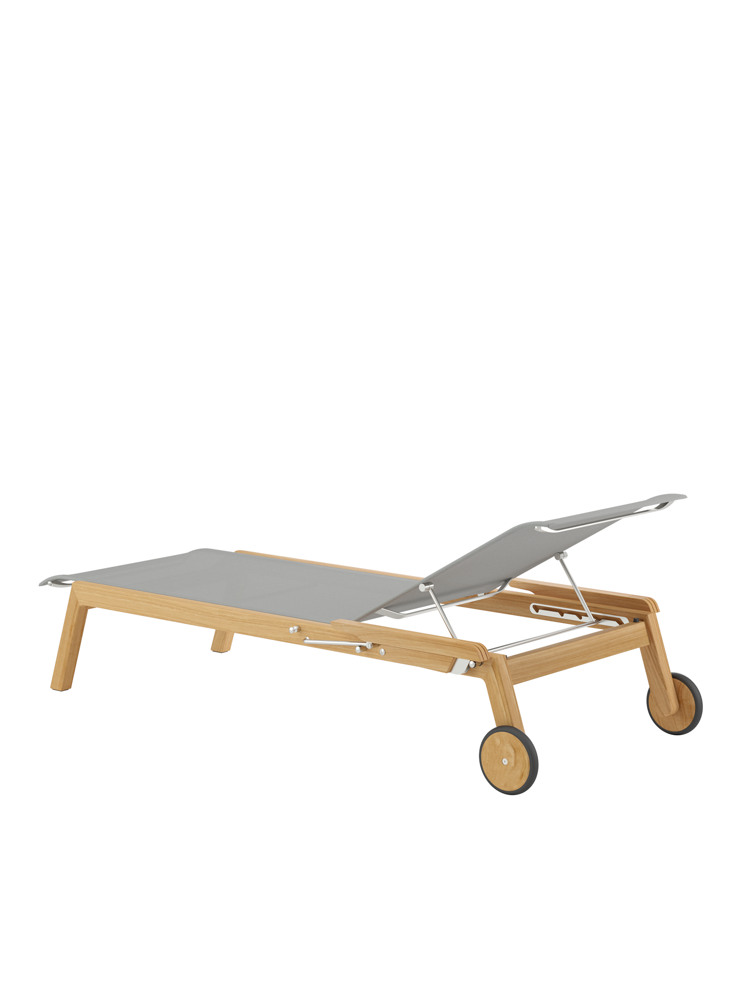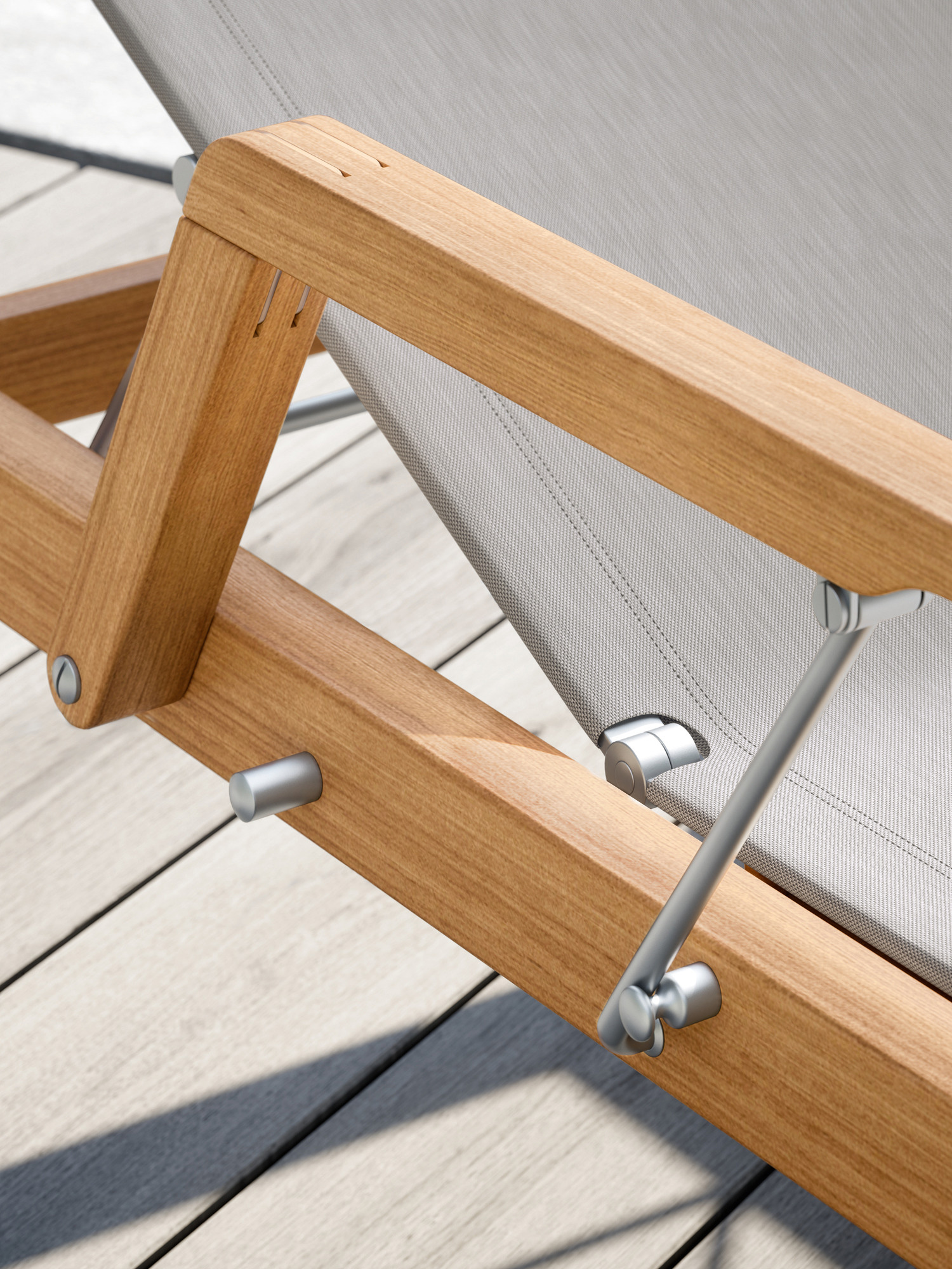 Clean, smoothly rounded edges characterise the teak frame, and the polymer covering is held in elements made of brushed stainless steel. Minimalist aesthetic meets maximum comfort.