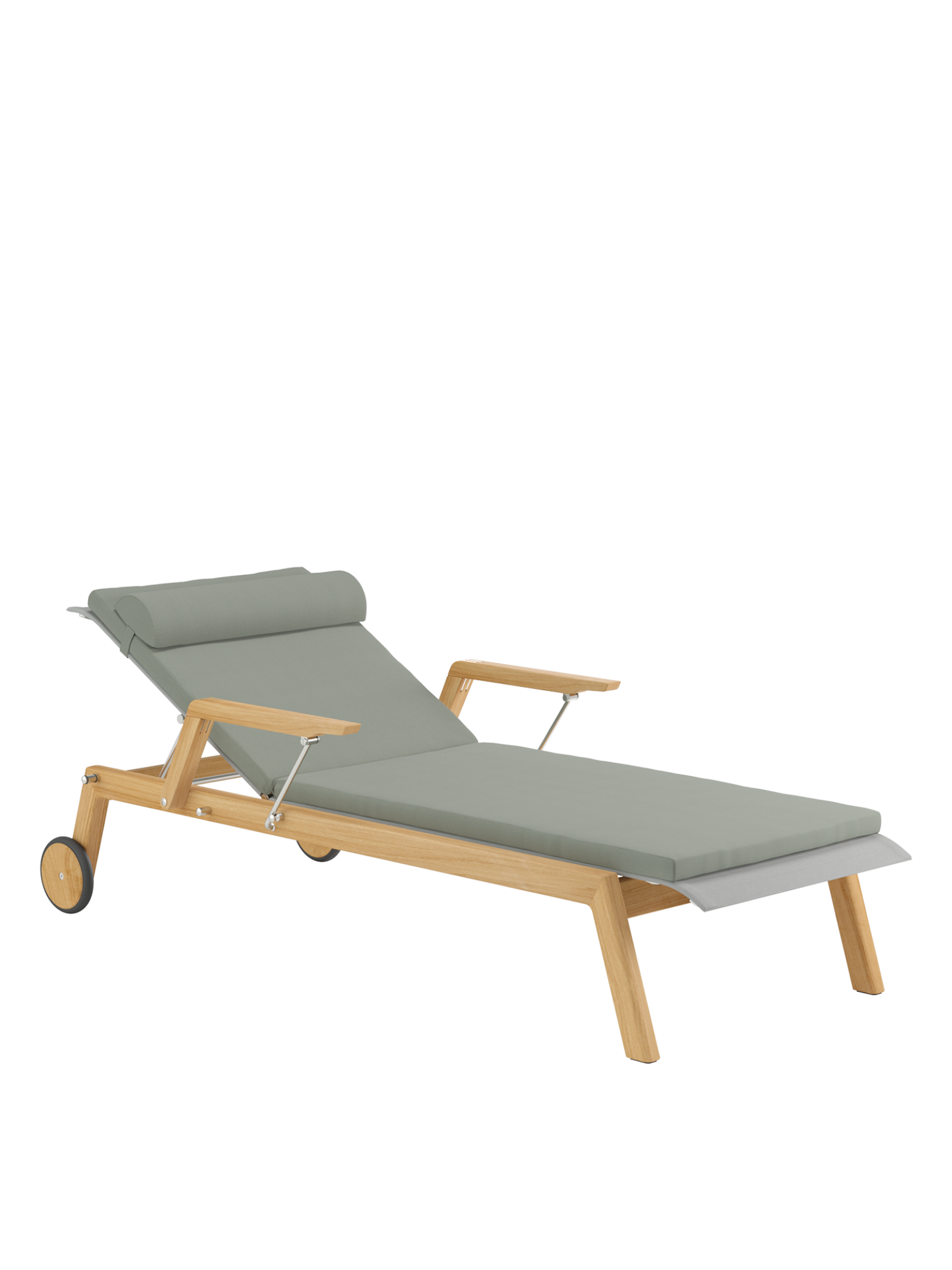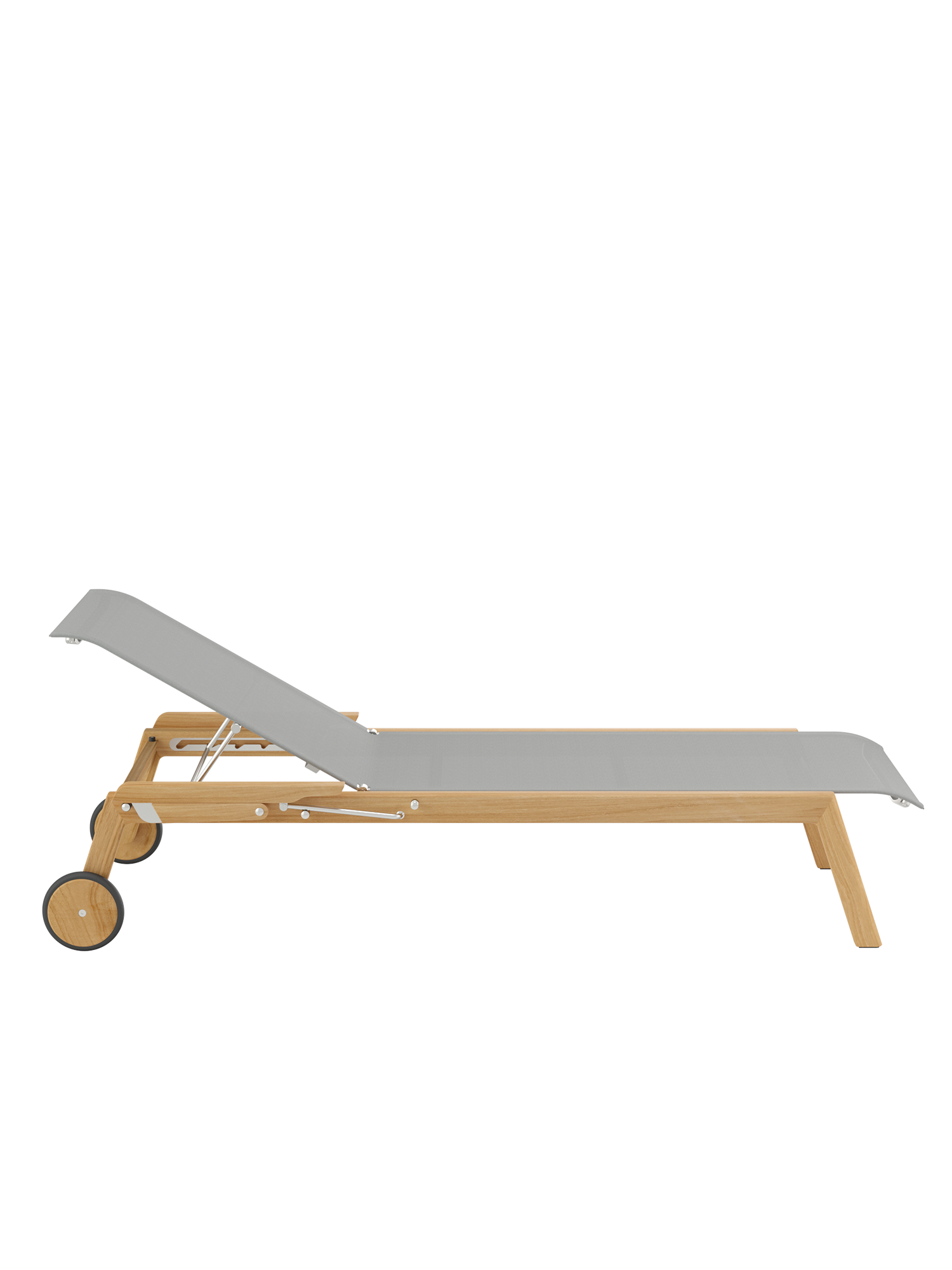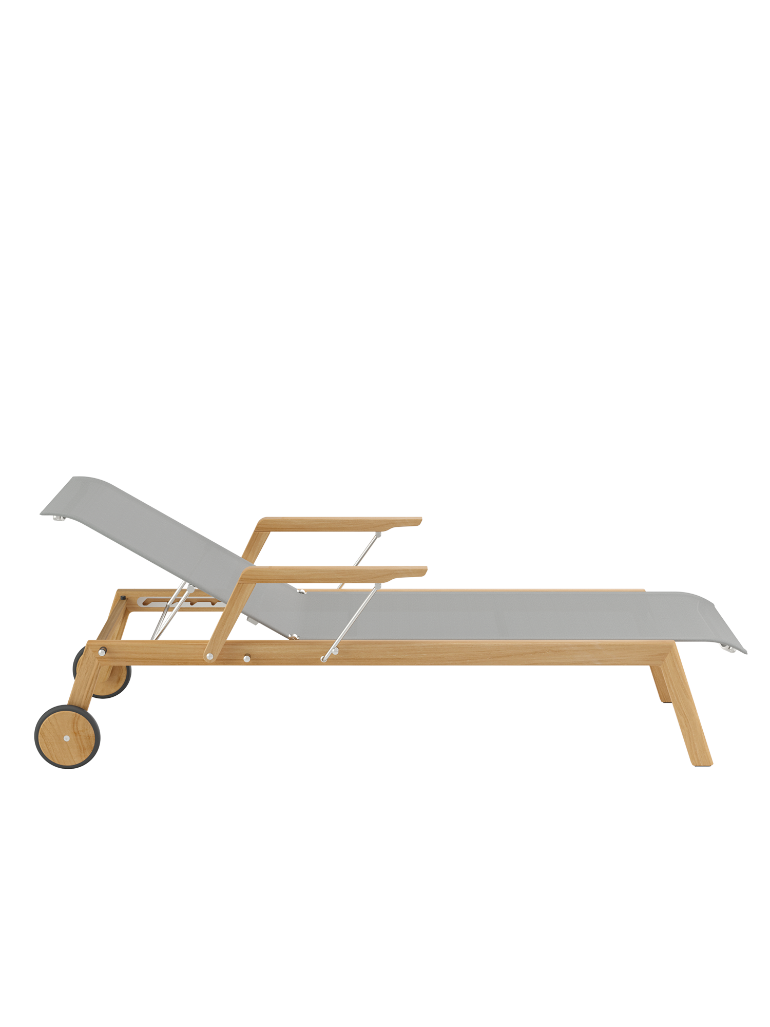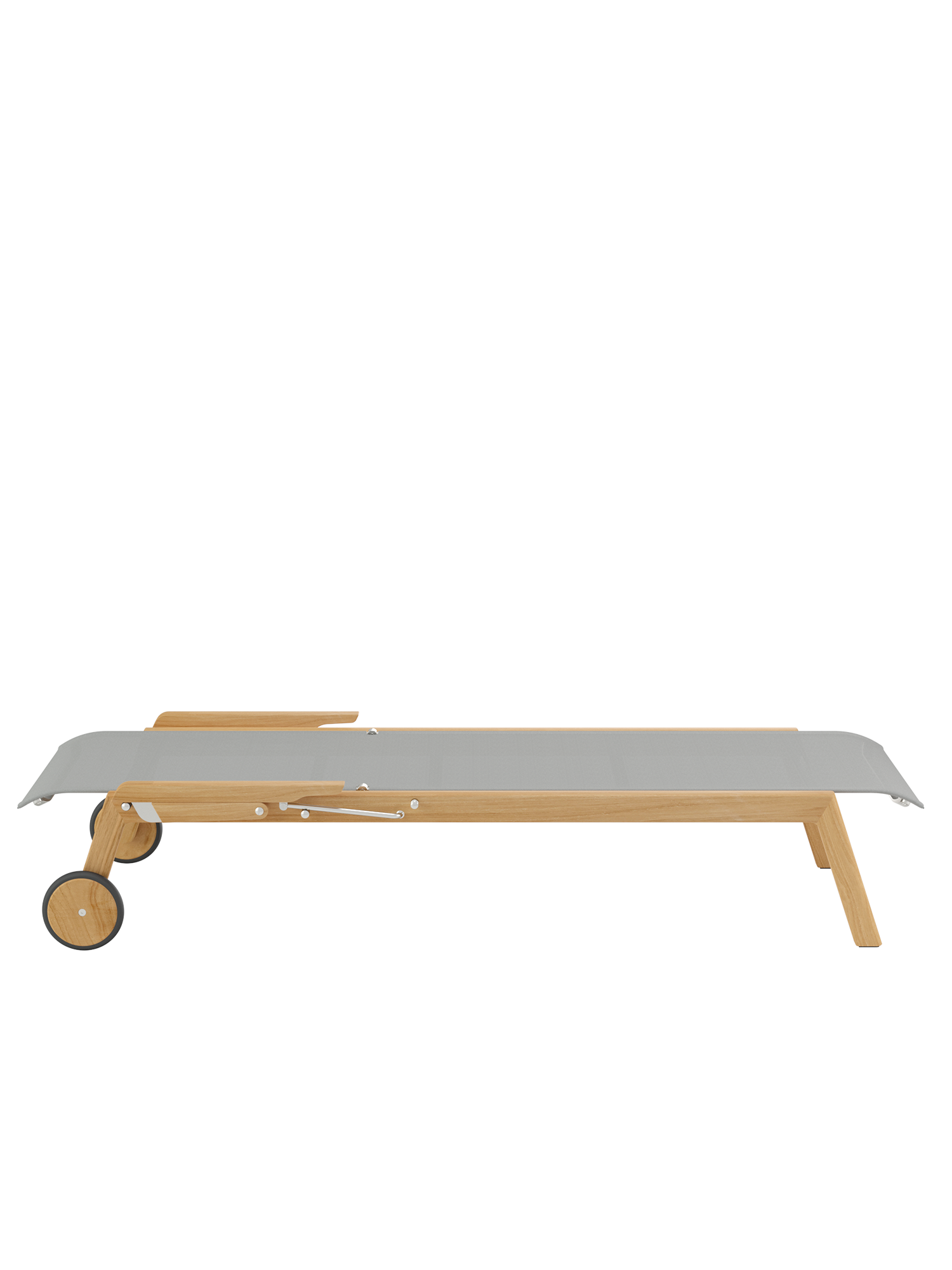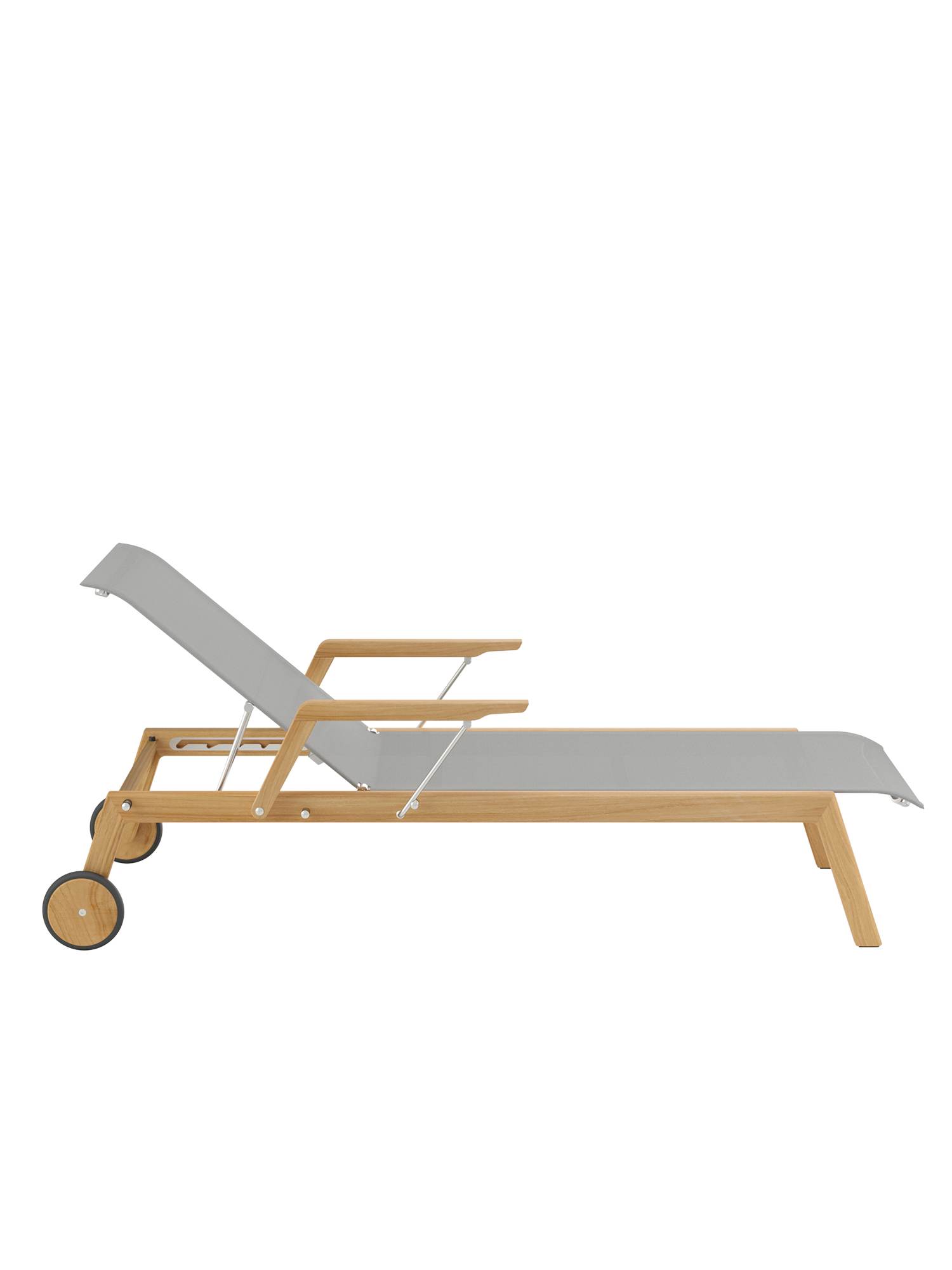 Clean, smoothly rounded edges characterise the teak frame, and the polymer covering is held in elements made of brushed stainless steel. Minimalist aesthetic meets maximum comfort.