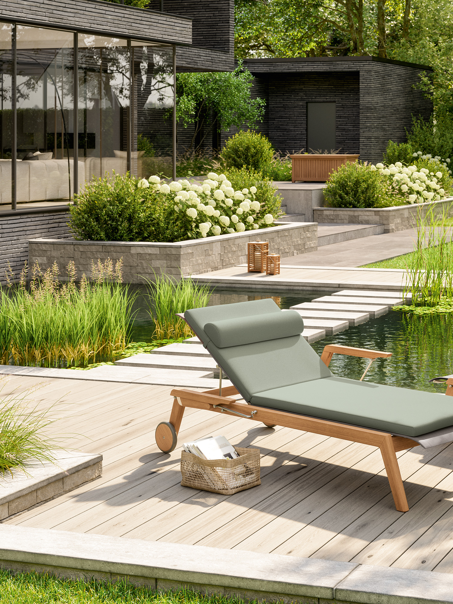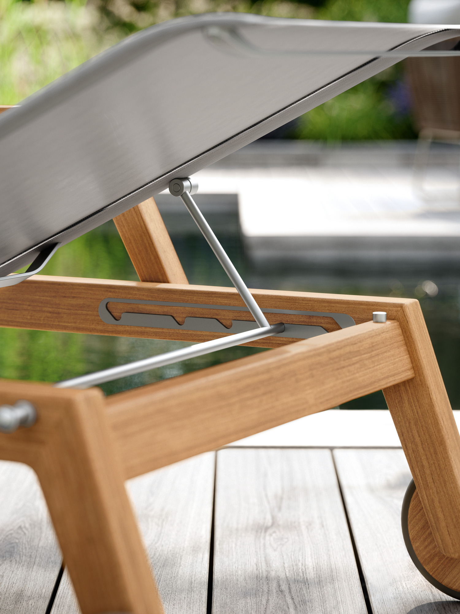 High-quality teak wood, UV-resistant polymer fabric and brushed stainless steel elements withstand all the challenges of sun, rain, pool water or frost, and are very easy to clean.