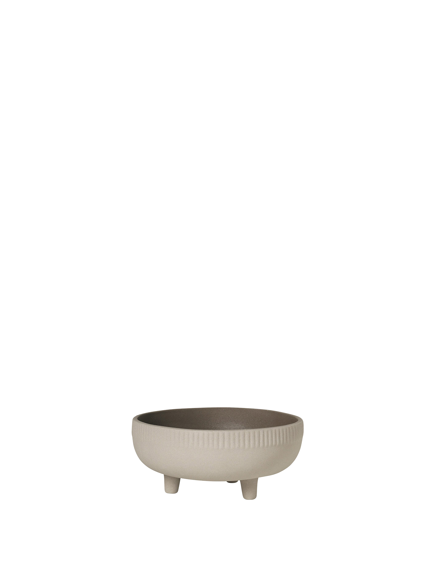 For the shallow plant bowl, terracotta has been given a uniquely new look. Engobe, a thin clay finish, gives the piece its natural looking grey surface. A glaze on the inside ensures that no water can escape. The unmistakable design is distinguished by three small feet and a simple pattern pressed into the clay around the top edge.